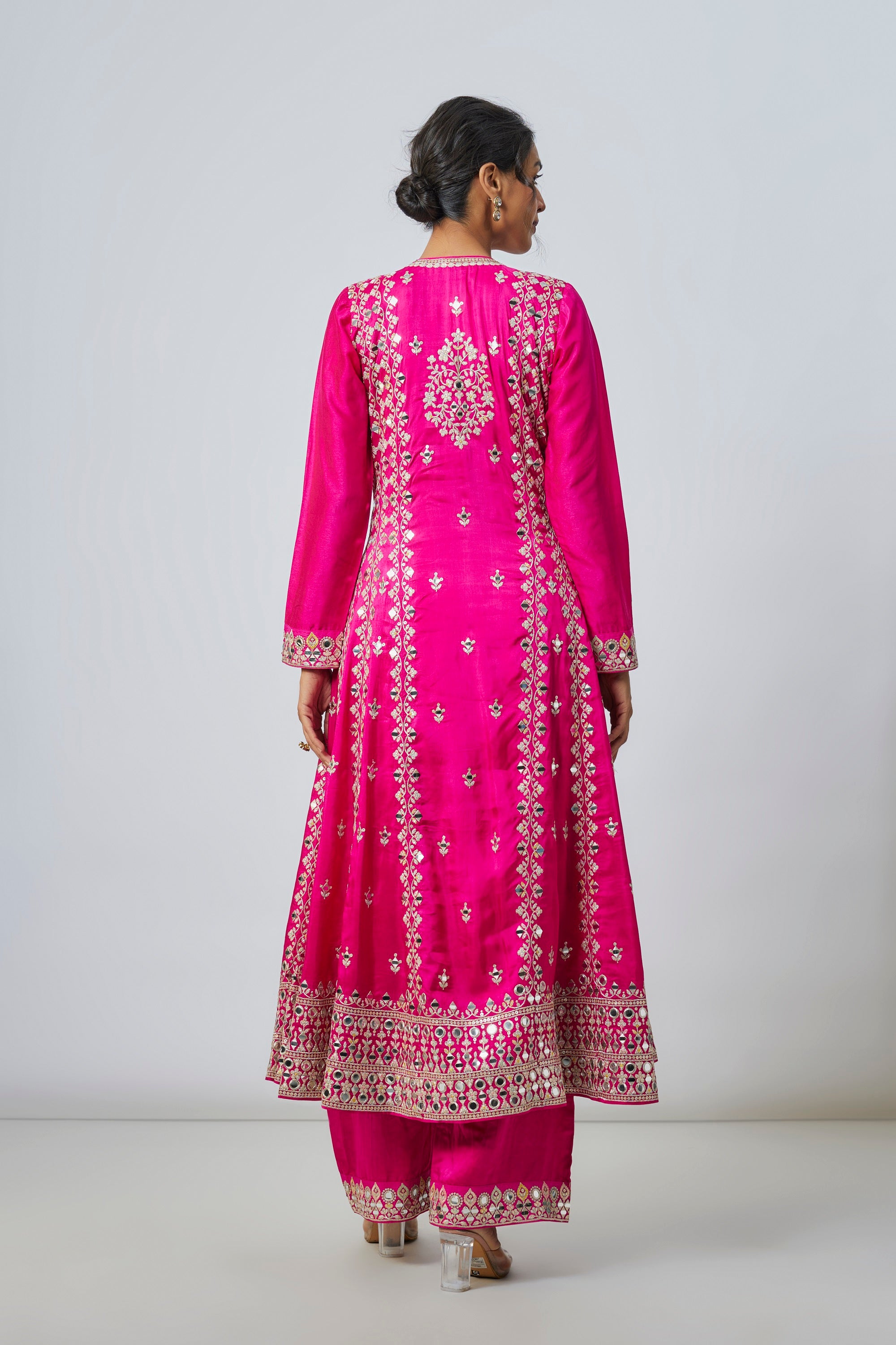 This Anarkali Suit Shows Intricate Embroidery With Floral And Geometric Motifs, Accentuated By Delicate Mirror Work Throughout The Fabric. The Full Sleeves And A Defined Neckline Lend A Modest Yet Chic Vibe. Paired With Matching Palazzo Pants Adorned With Similar Detailing At The Hem And Embroidered Dupatta Completes The Look.