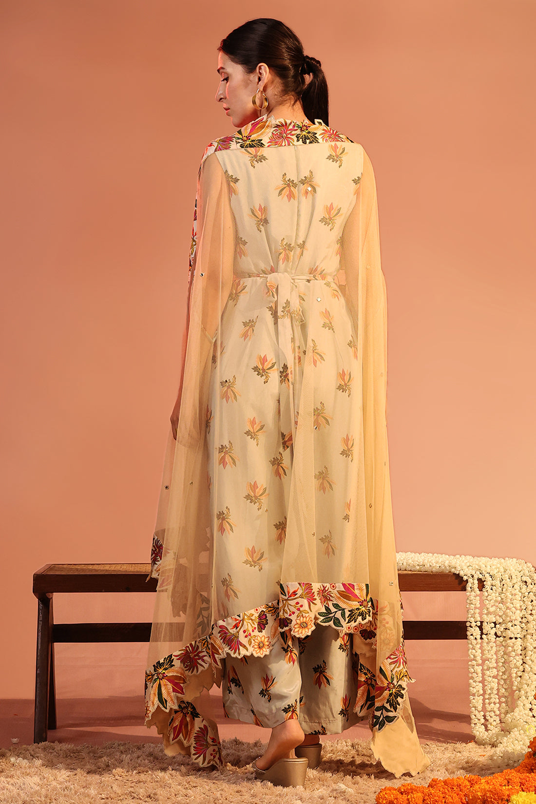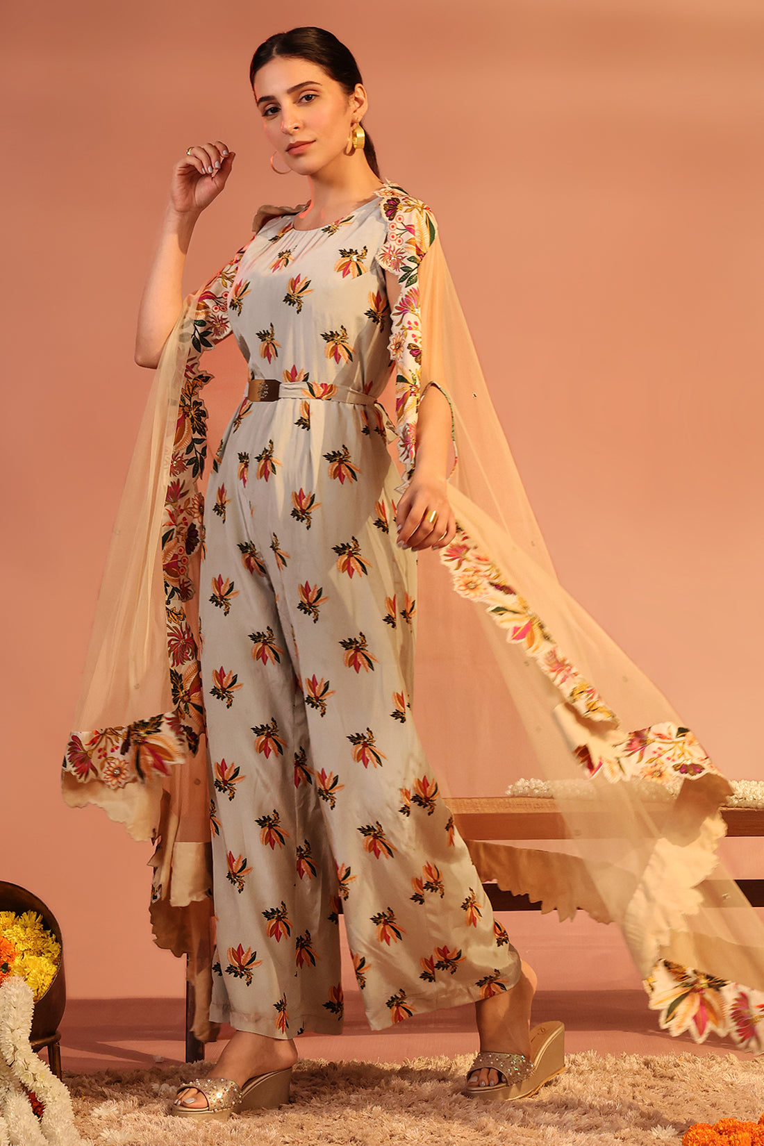 Blue Aarani Printed Jumpsuit with a Statement Metal Belt, Paired with an Embroidered Net Cape.