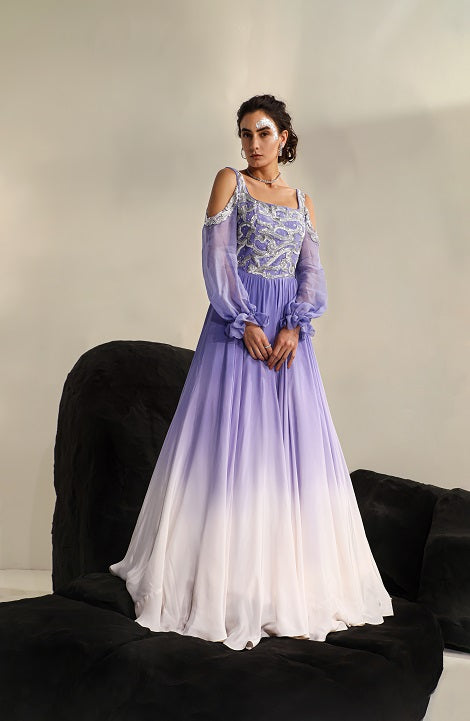 | Inspired by the surreal magnificience of mermaid scales, the Attina gown is designed to make you feel like Royalty. It highlights a cold shoulder bishop sleeve, an embroidered torso and double ombre gown. |