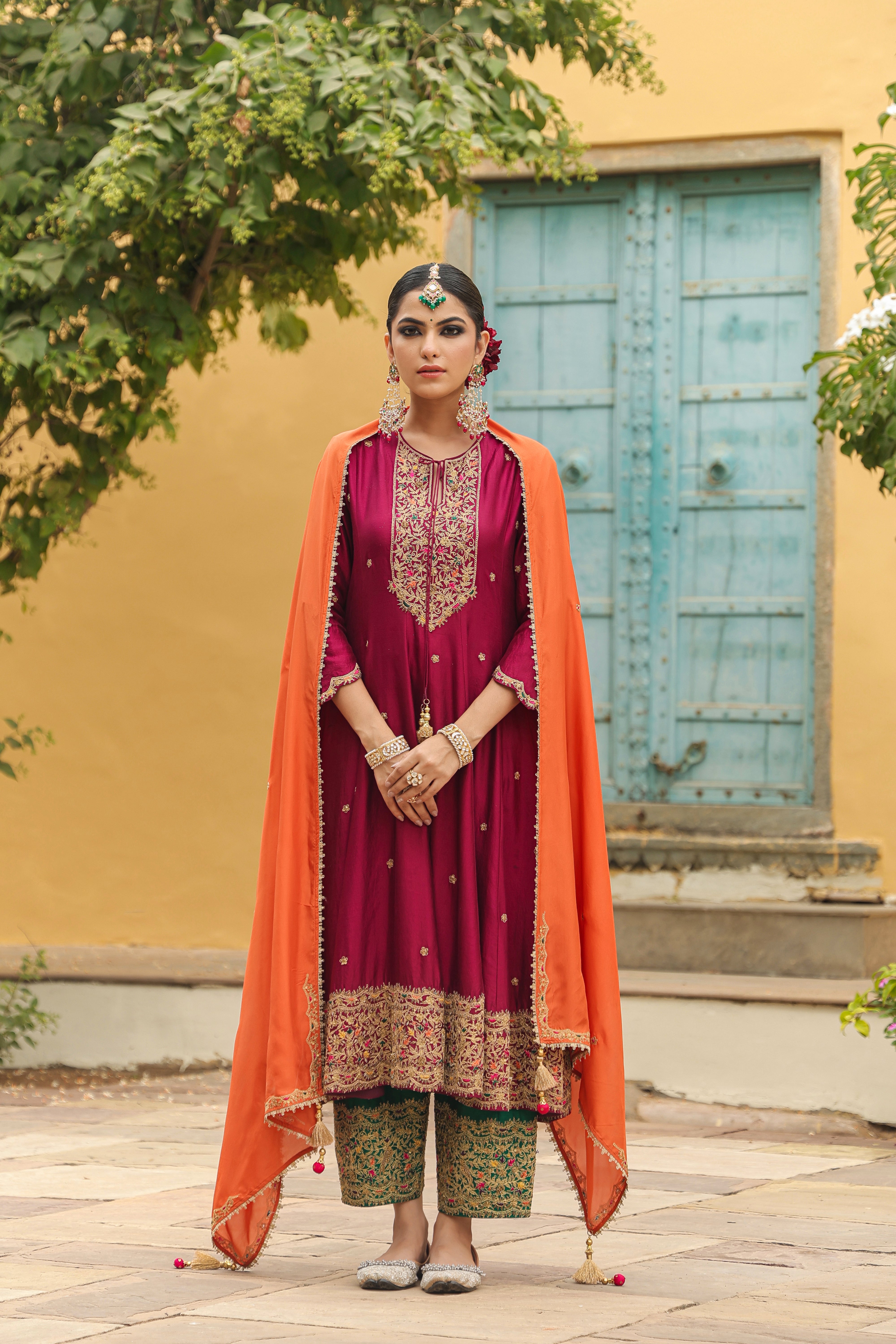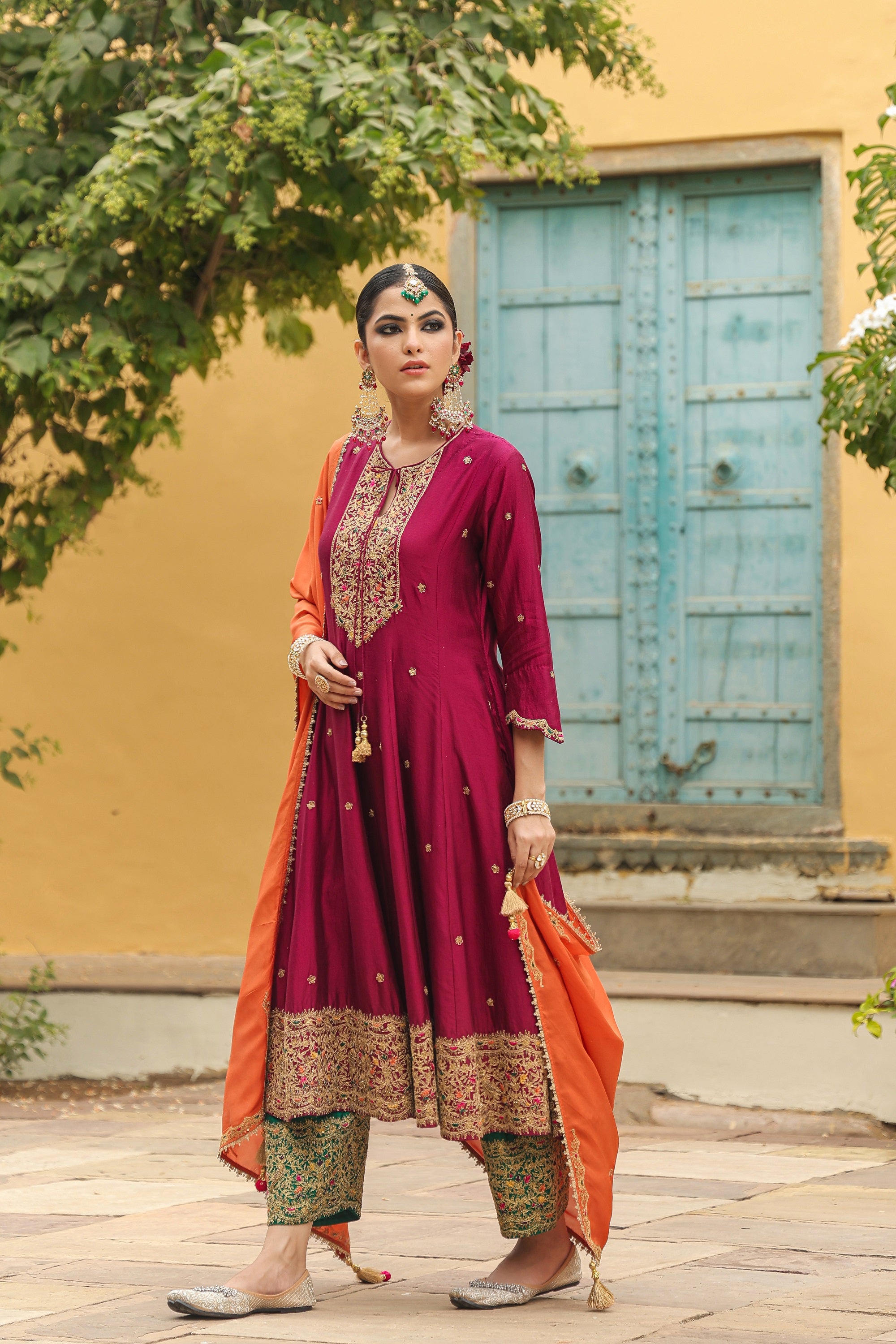 | This 3 pc Kalidaar kurta Set comes with a heavy zari dori embroidery on neck, border with colourful resham and tikki details. The salwar also comes heavily embroidered. The dupatta in a contrast colour is embellished with an embroidered border on two sides and sprinkle of buttis enhanced with lace and latkans . |