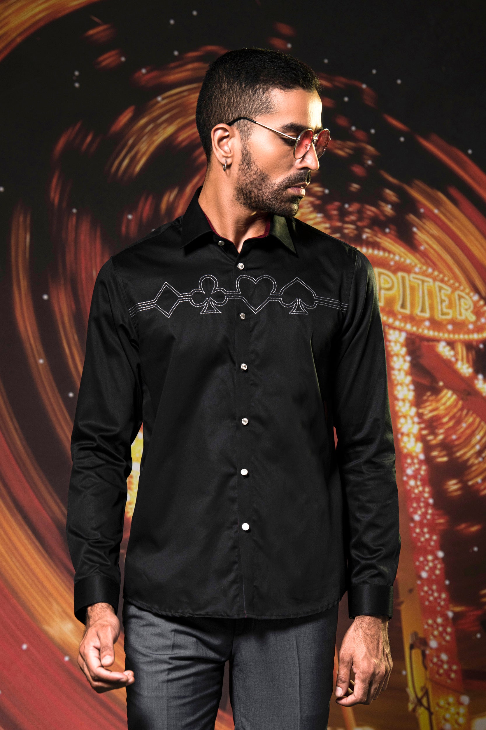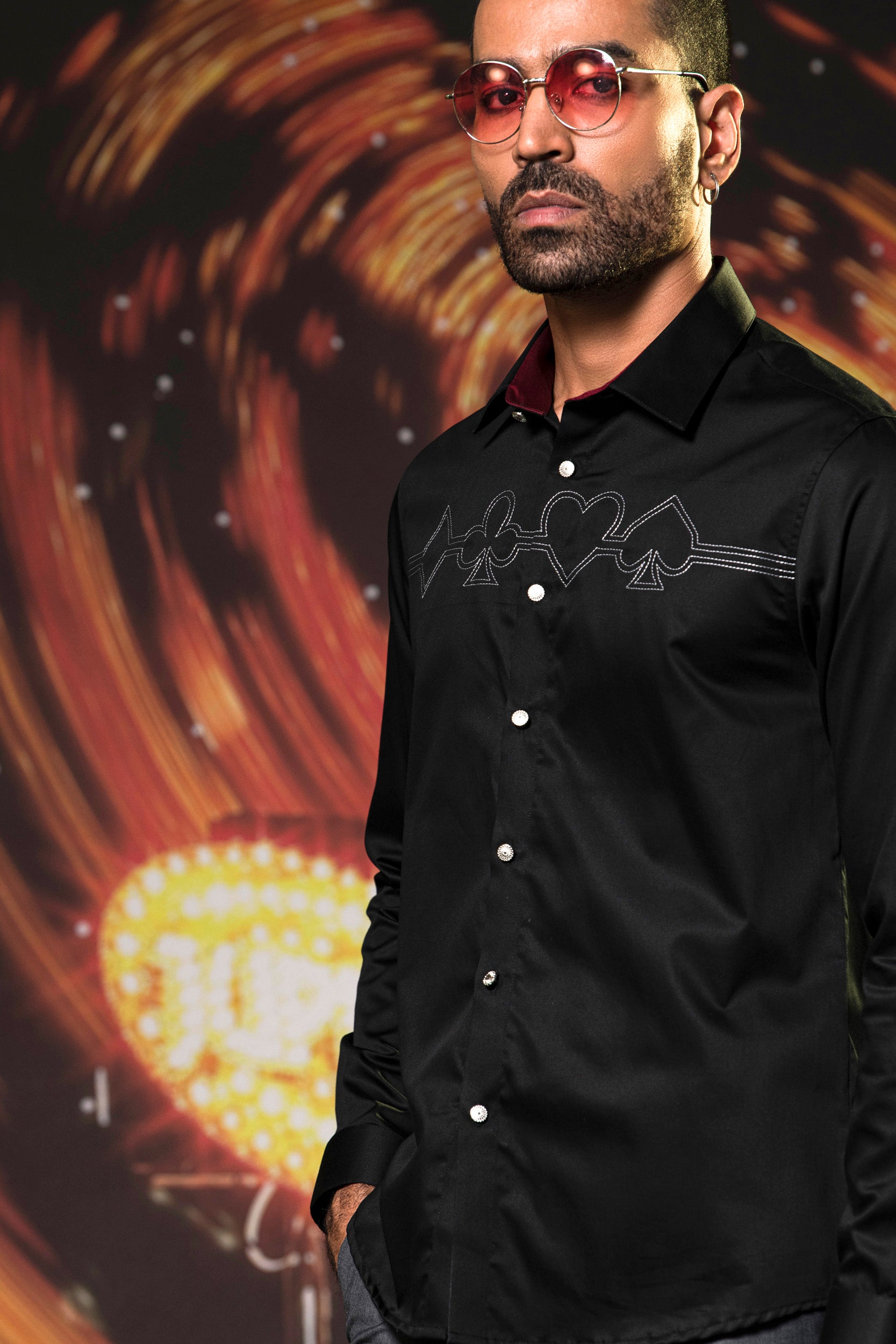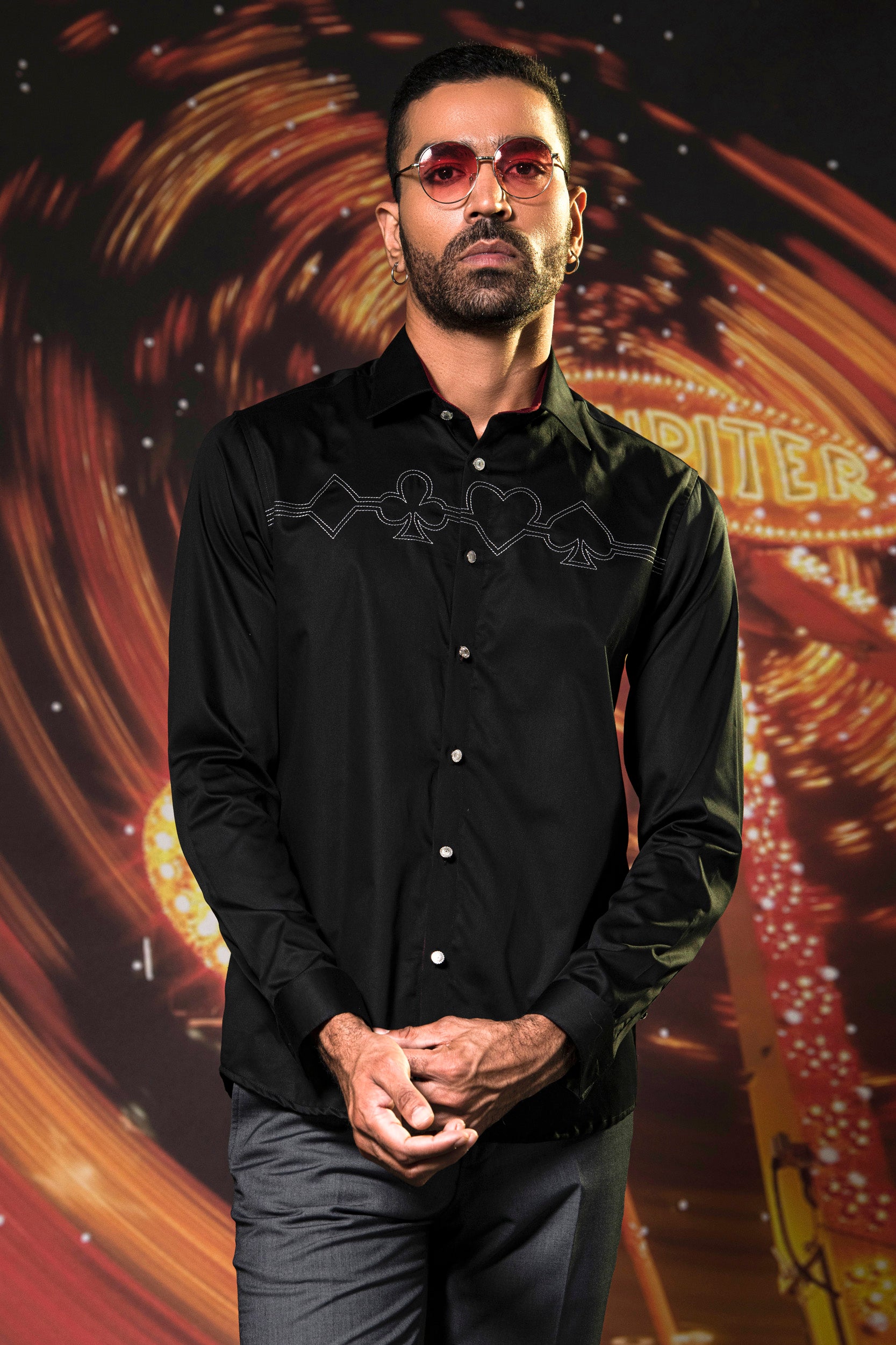 Featuring a black shirt in cotton base with stitch-line embroidery and silver buttons detail. Perfect wear for parties and cocktail ceremonies.