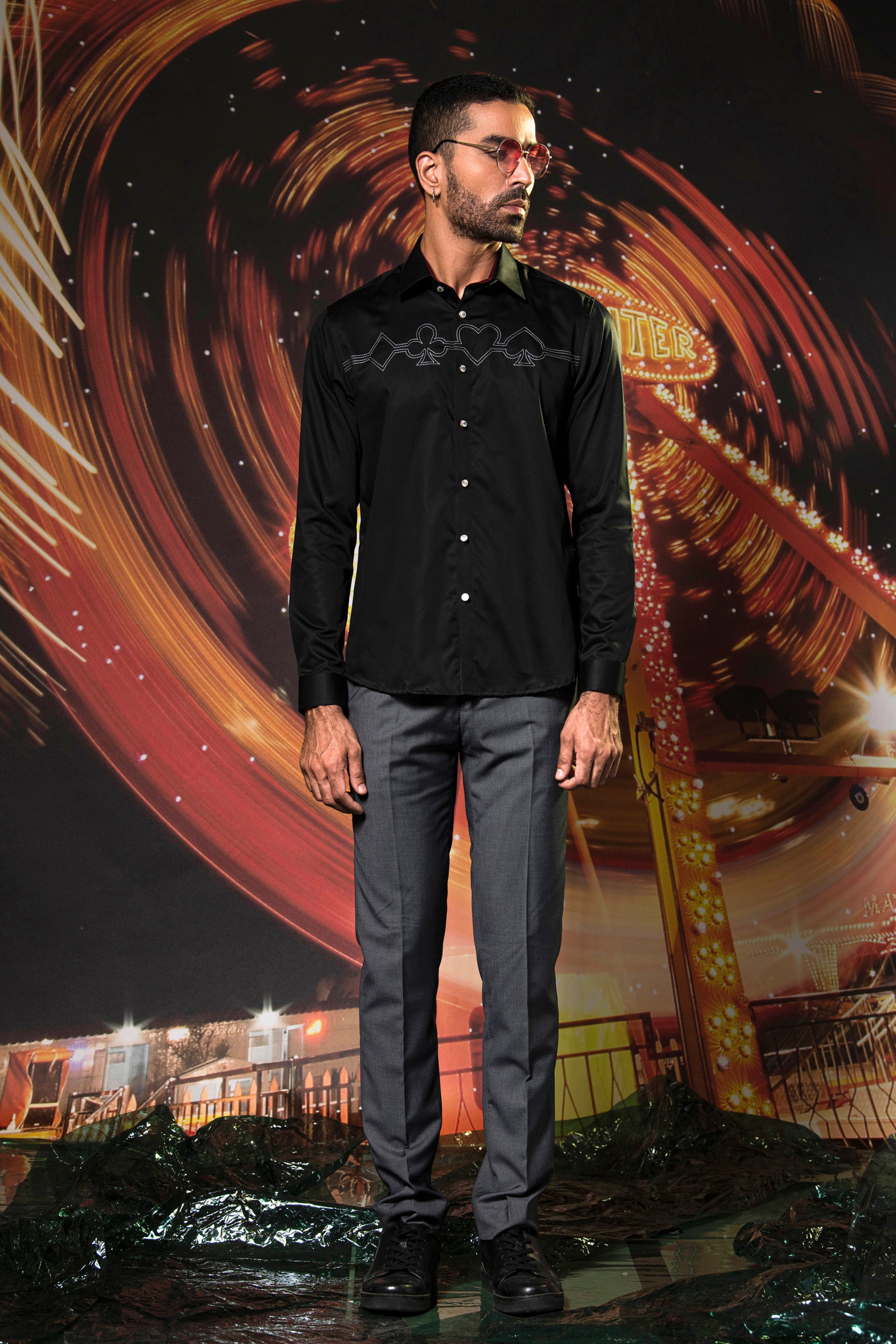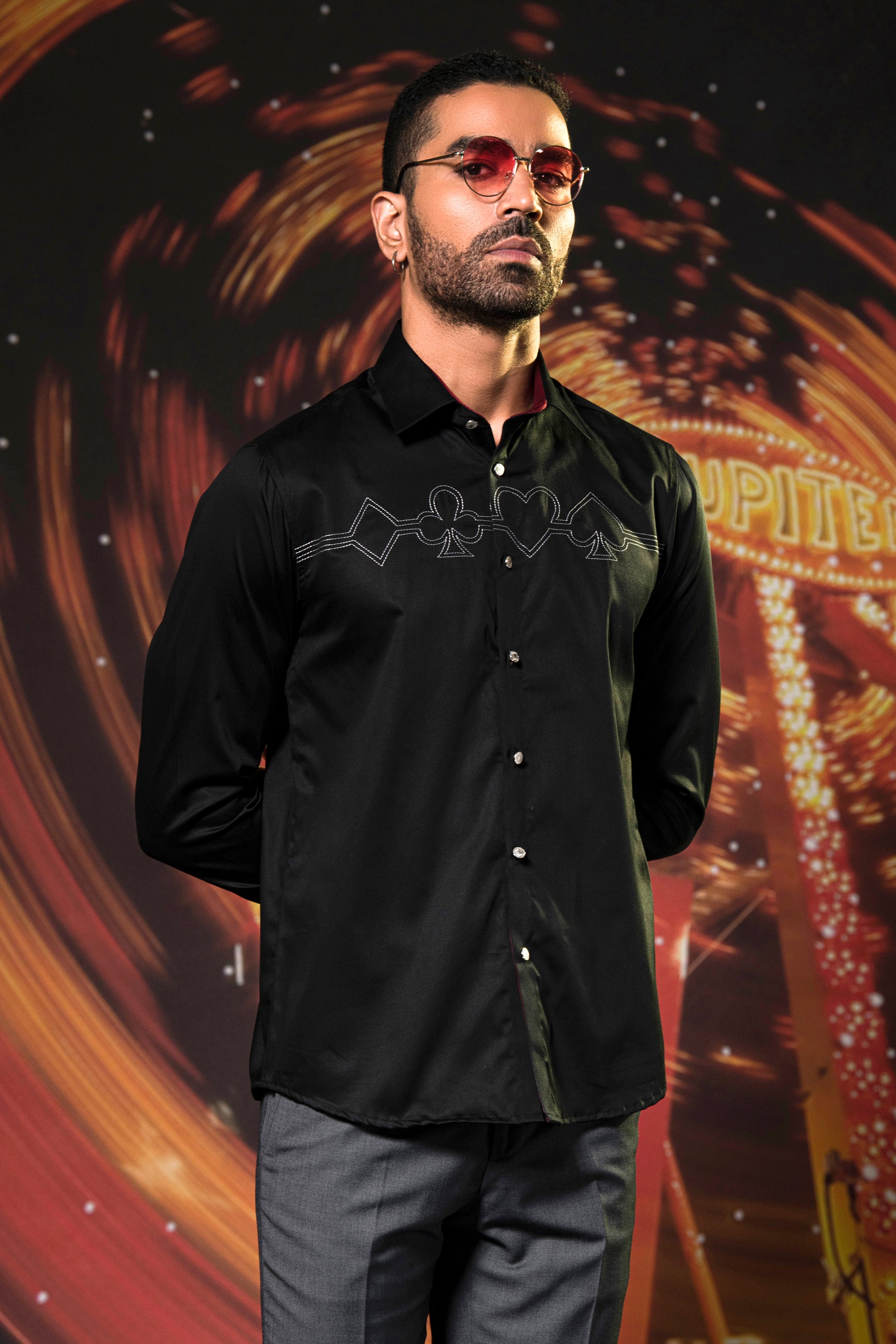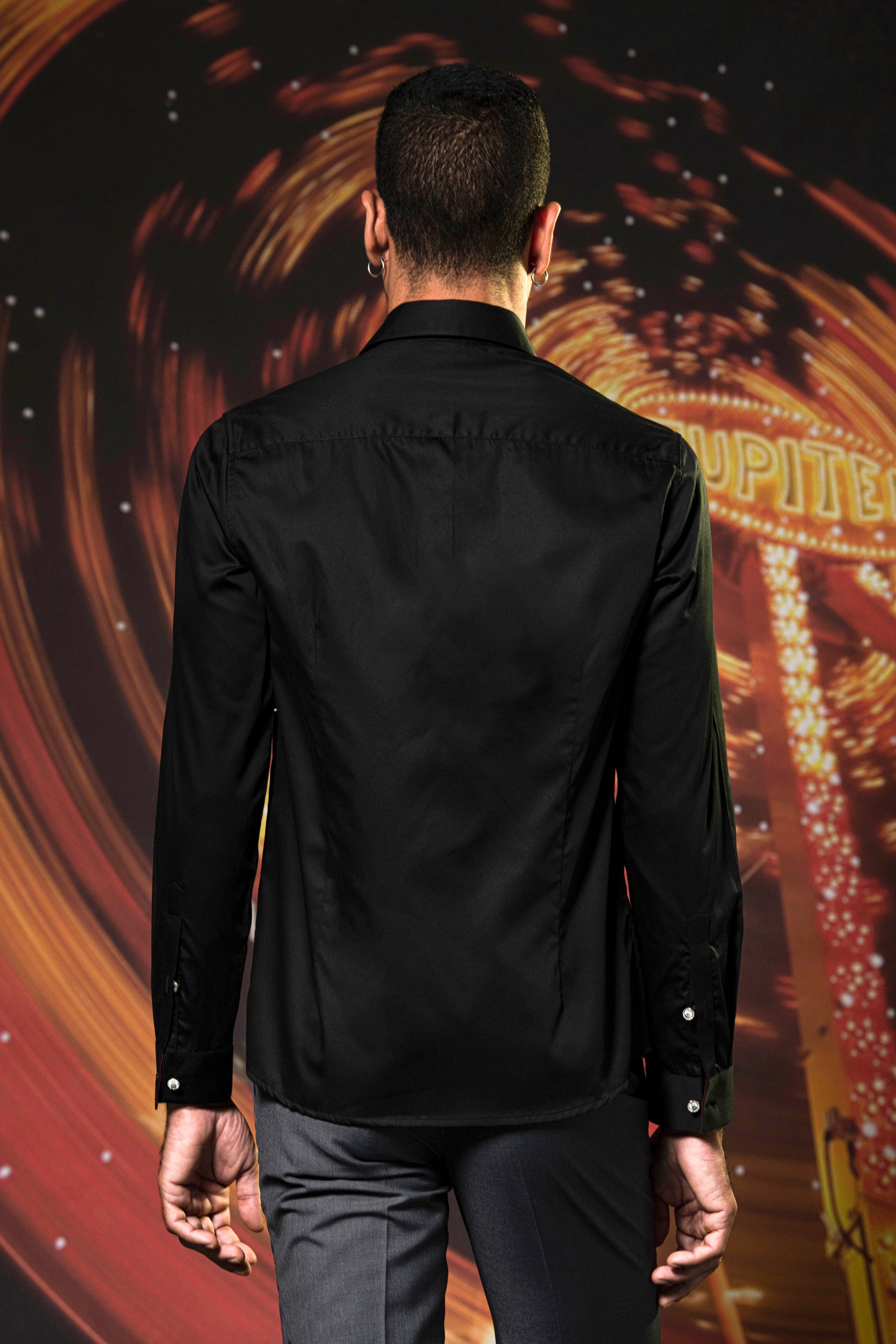 Featuring a black shirt in cotton base with stitch-line embroidery and silver buttons detail. Perfect wear for parties and cocktail ceremonies.