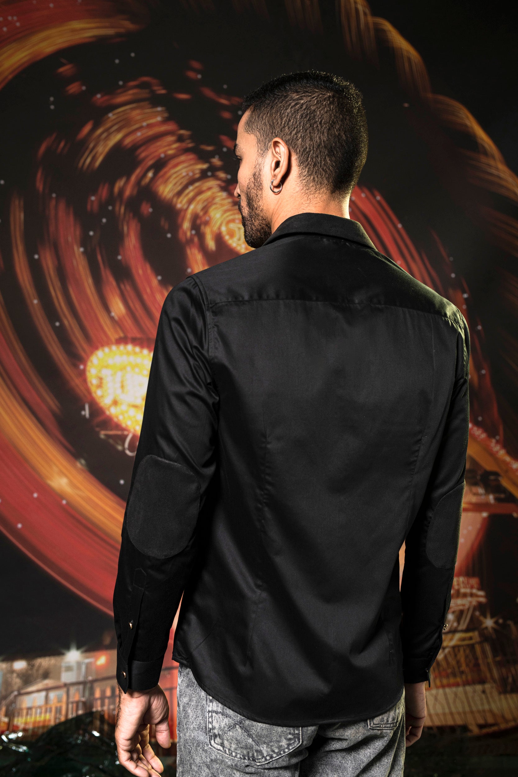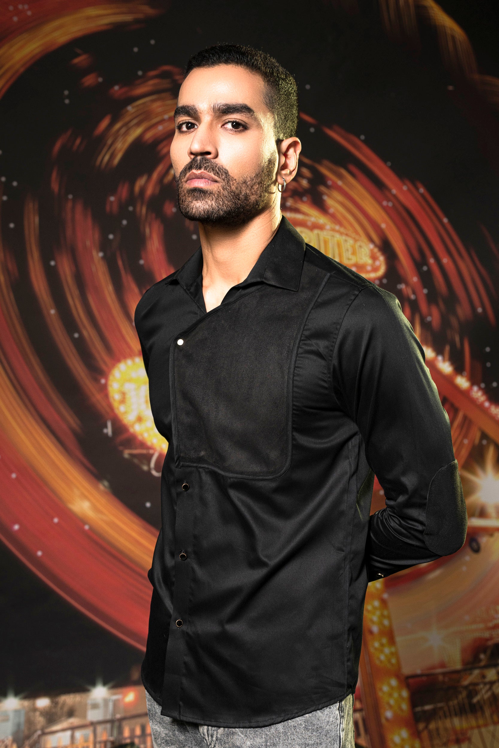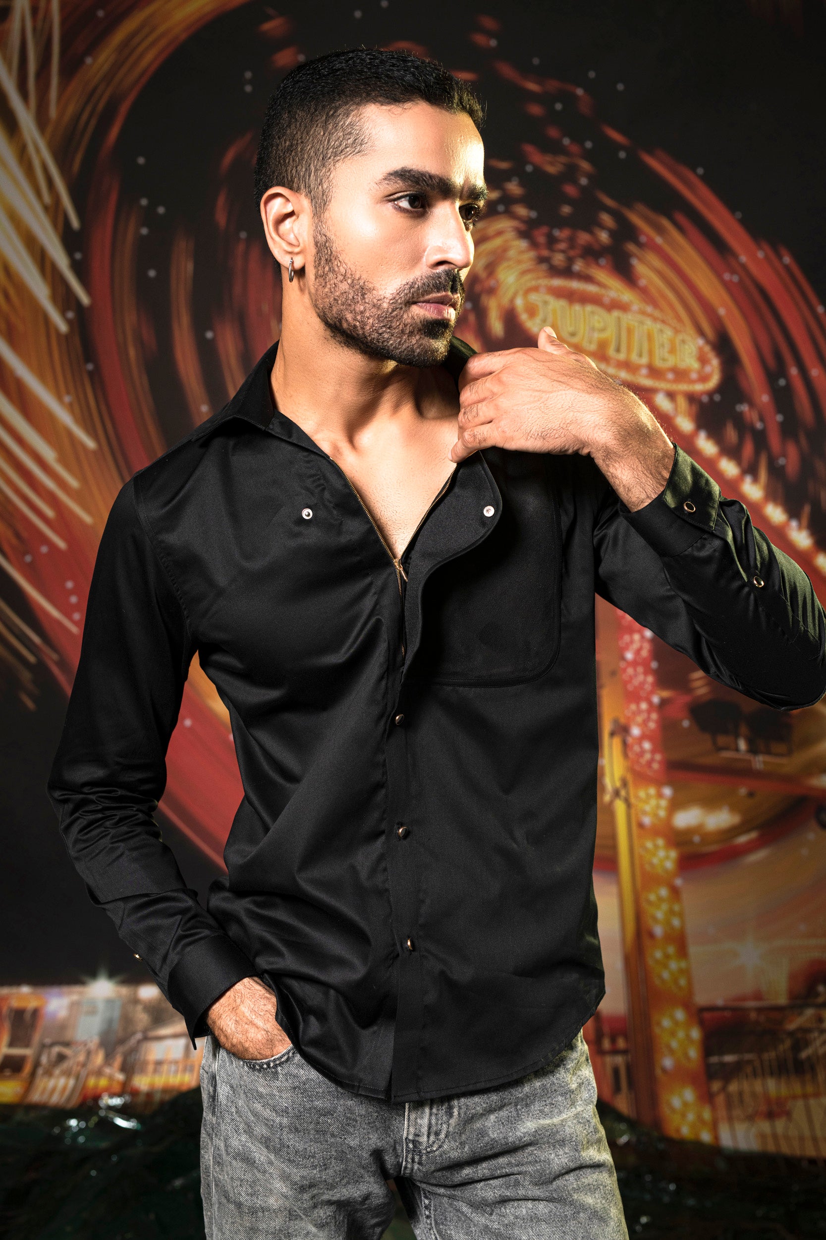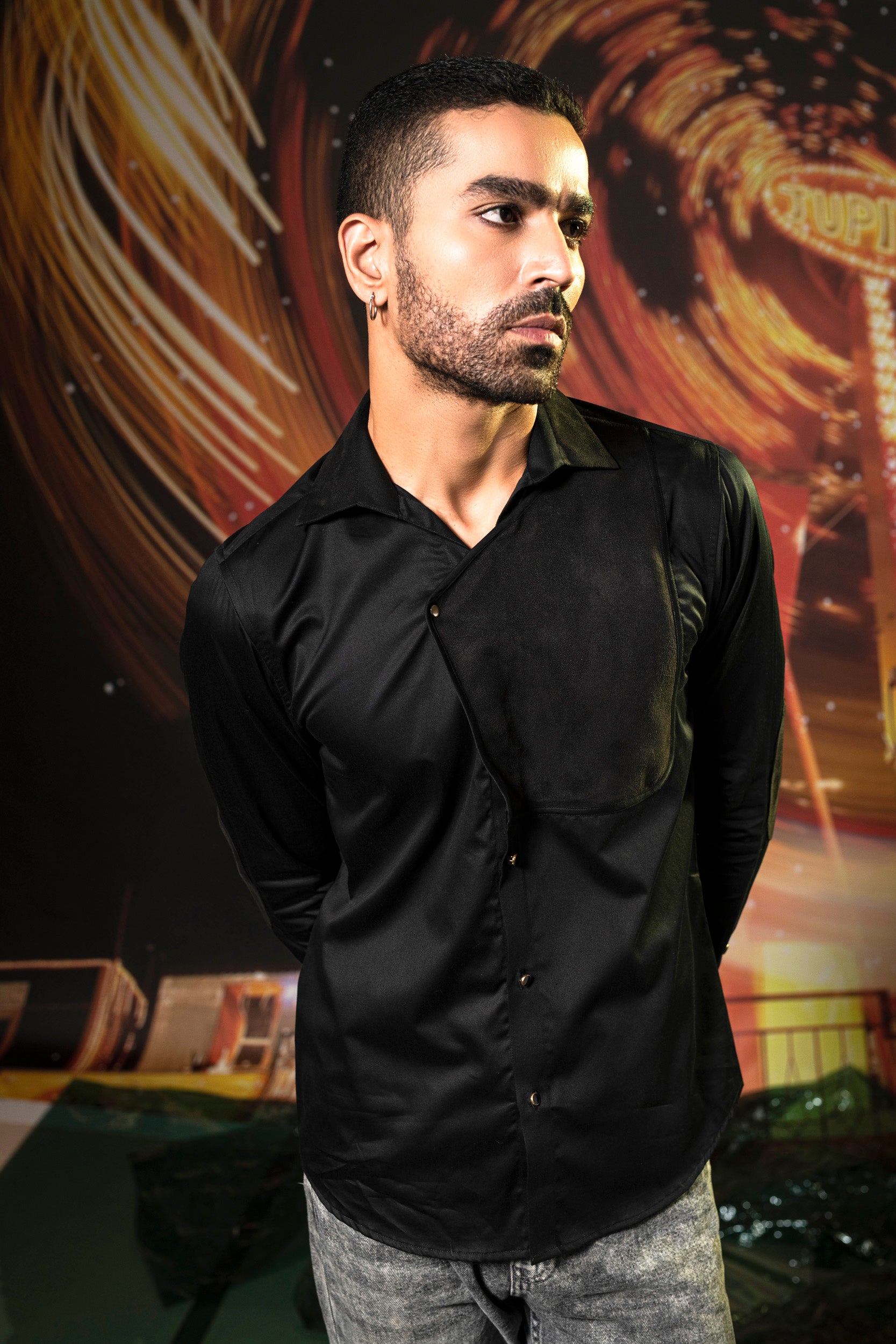 Featuring a black shirt in cotton base with flap detail. Perfect wear for parties and cocktail ceremonies.