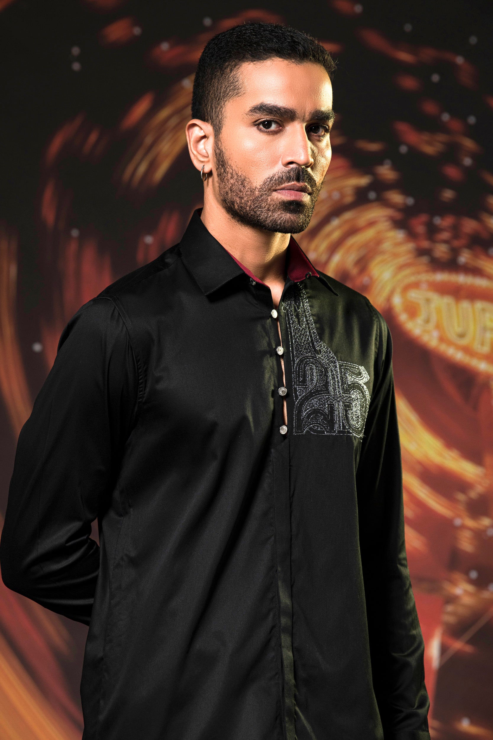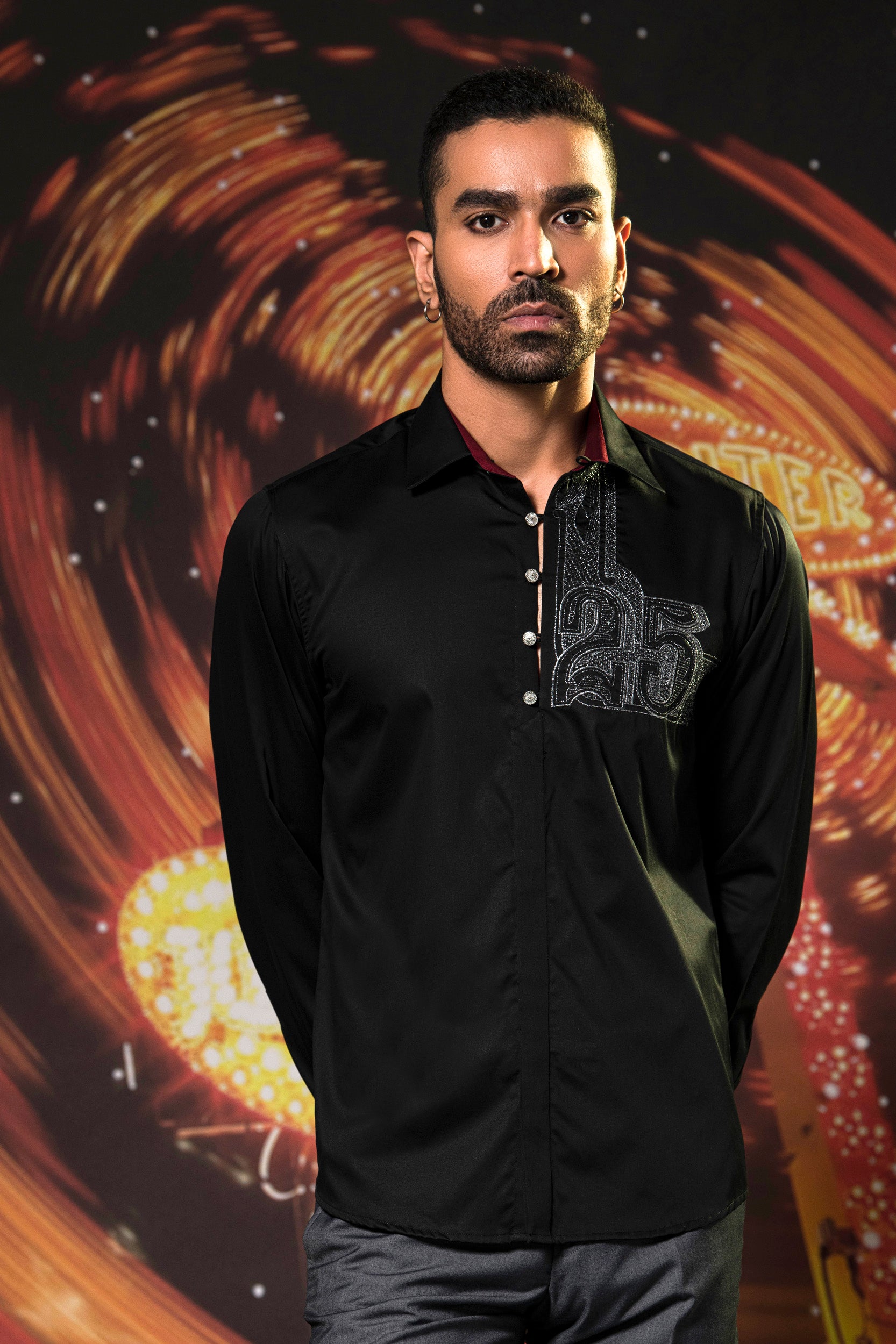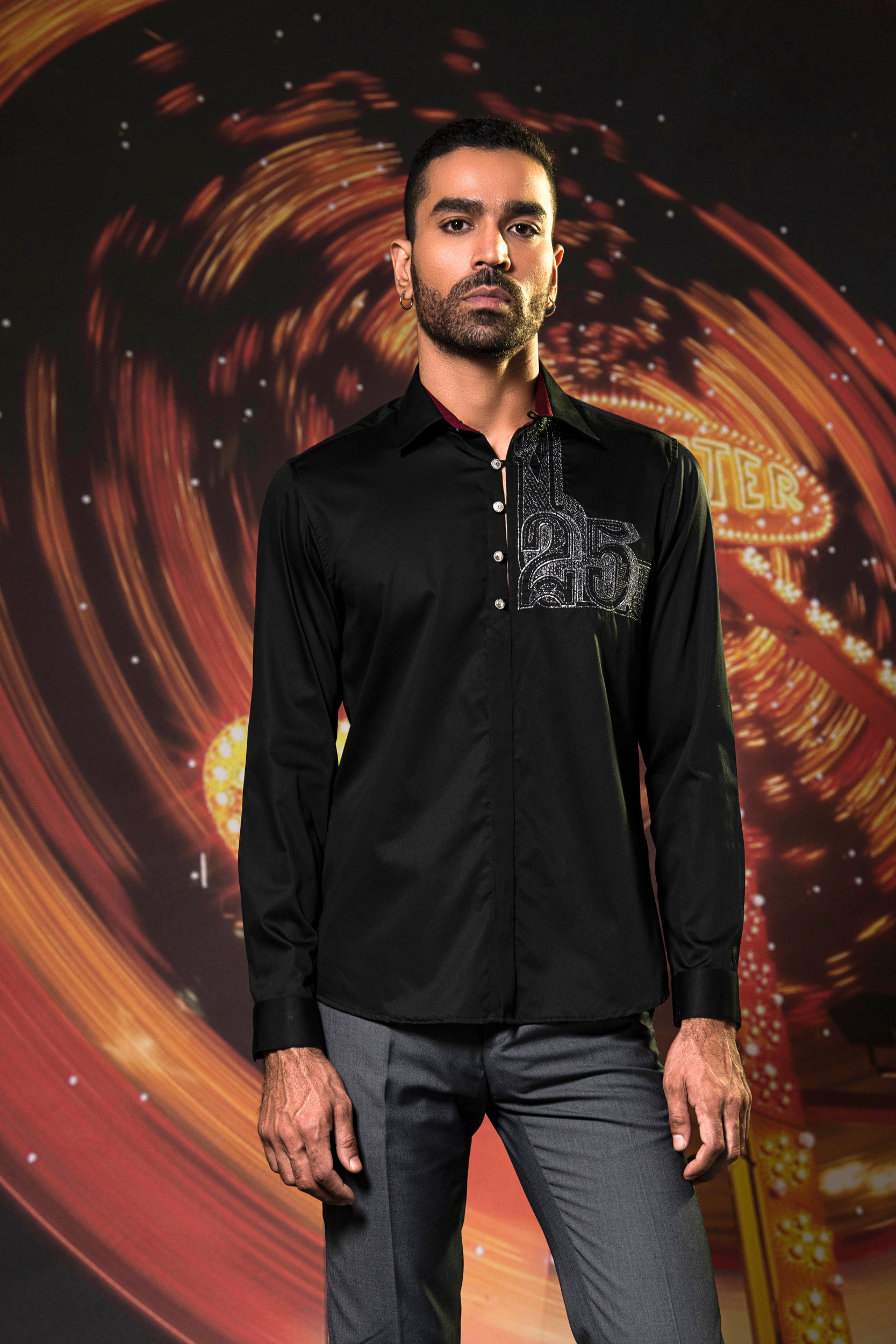 Featuring a black shirt in cotton base with concealed plackets, including badla and thread embroidery. Perfect wear for parties and cocktail ceremonies.