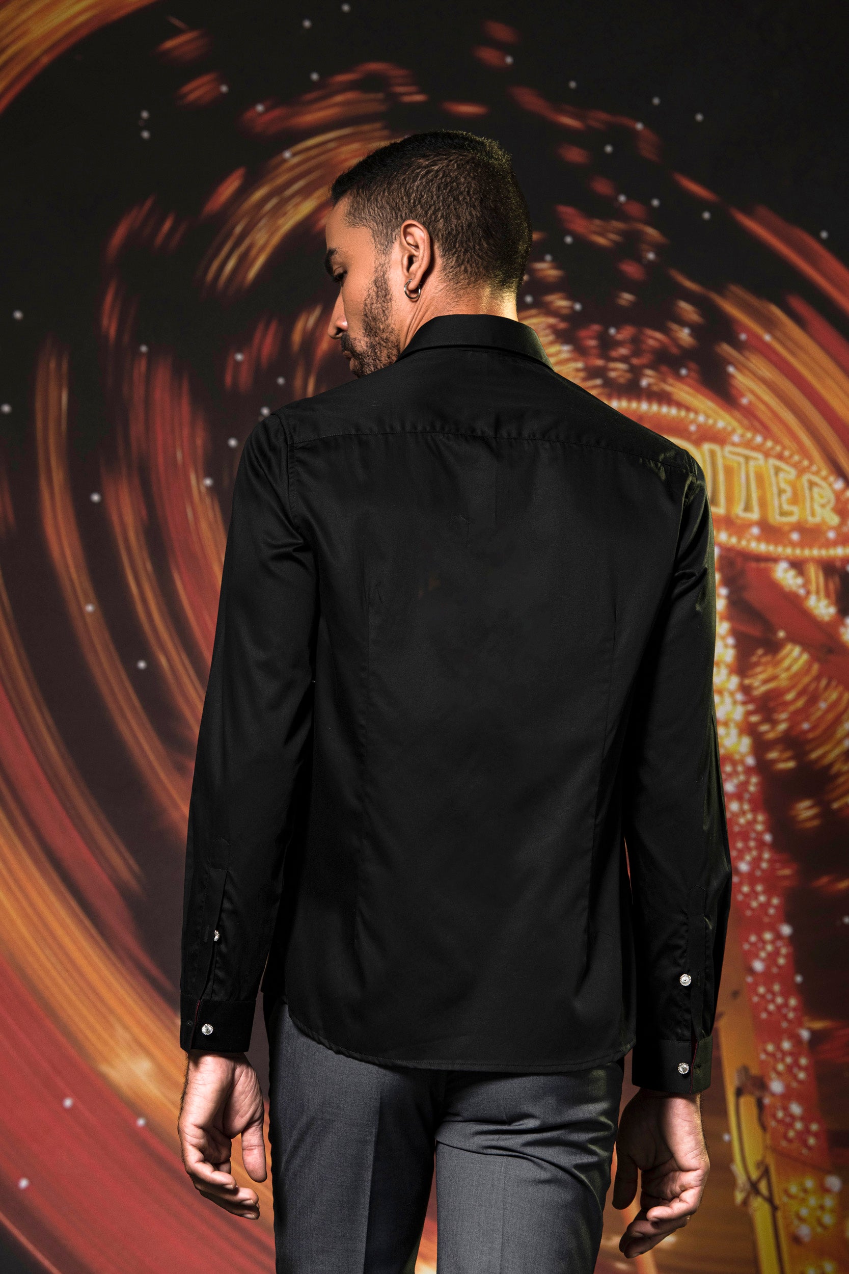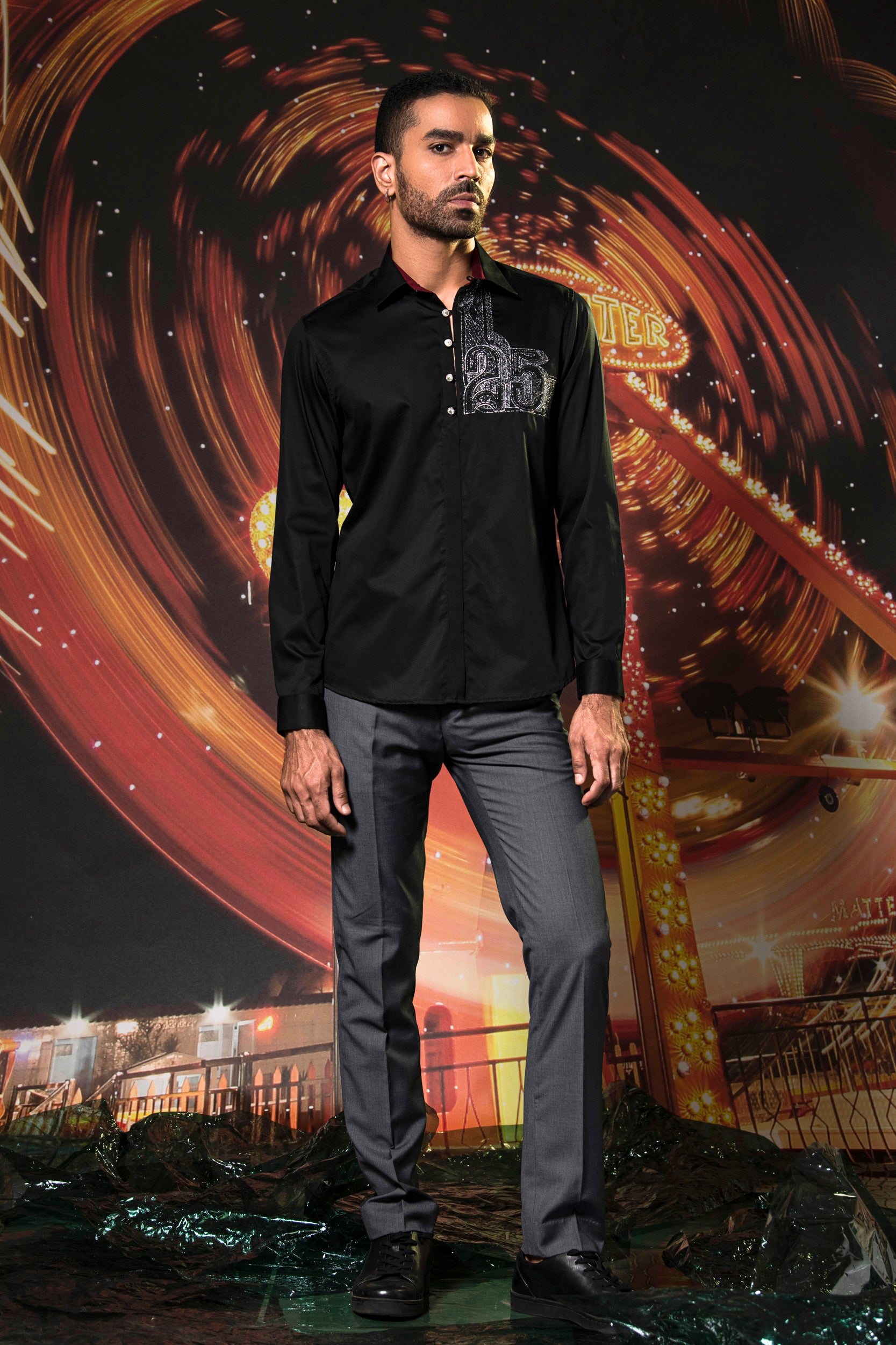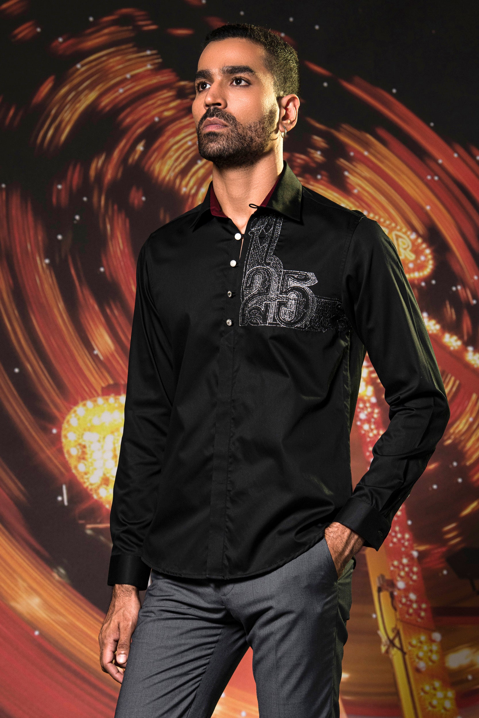 Featuring a black shirt in cotton base with concealed plackets, including badla and thread embroidery. Perfect wear for parties and cocktail ceremonies.