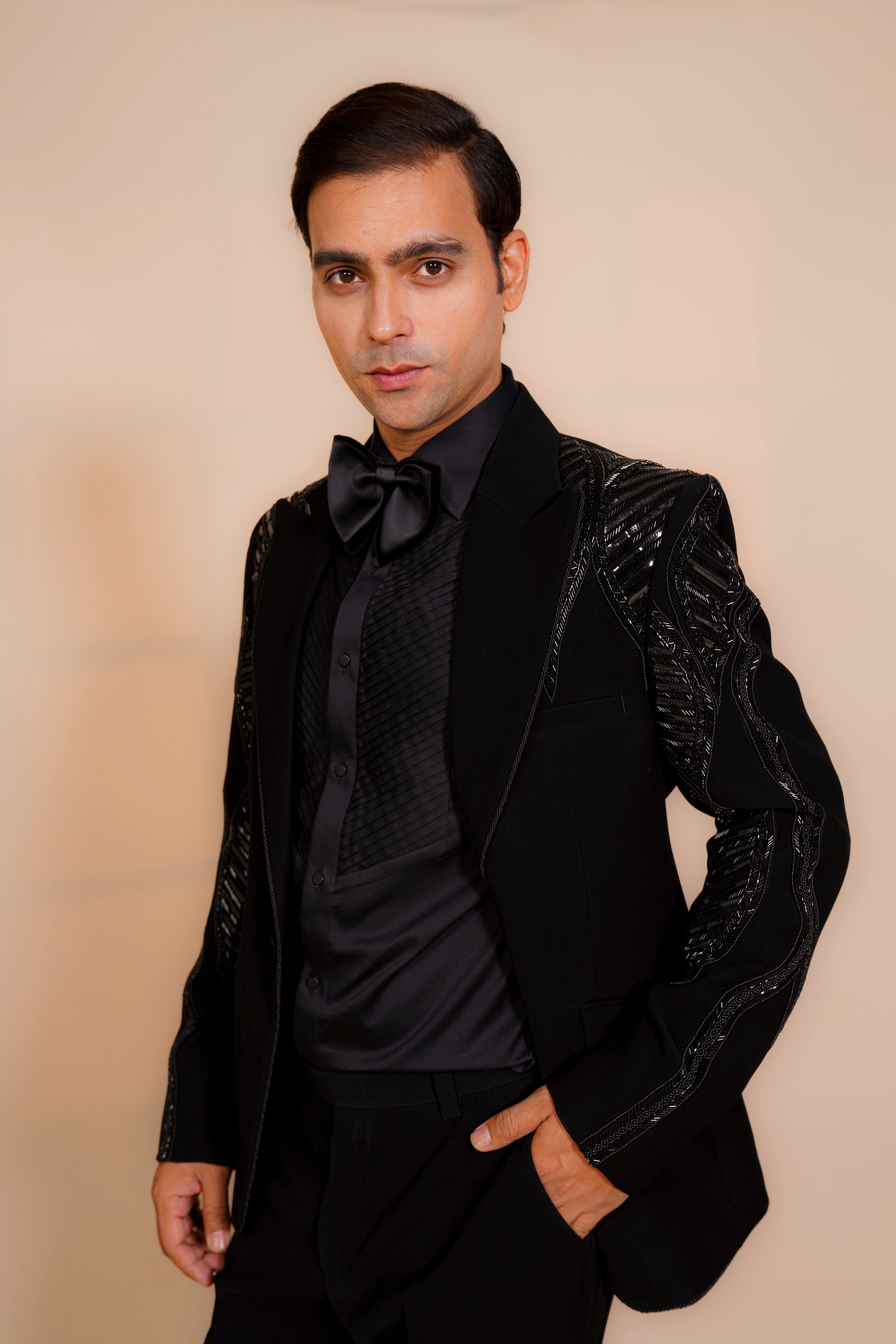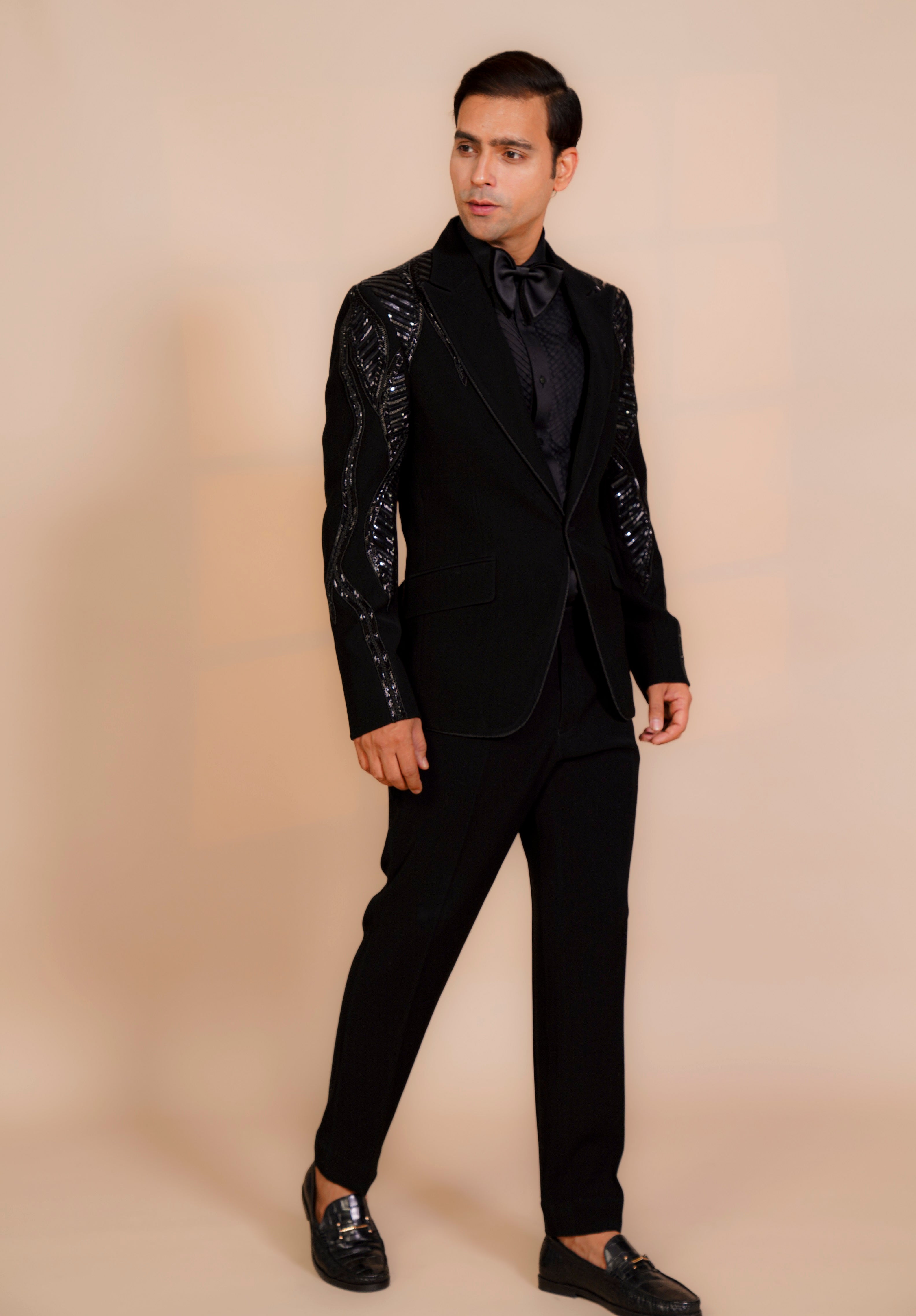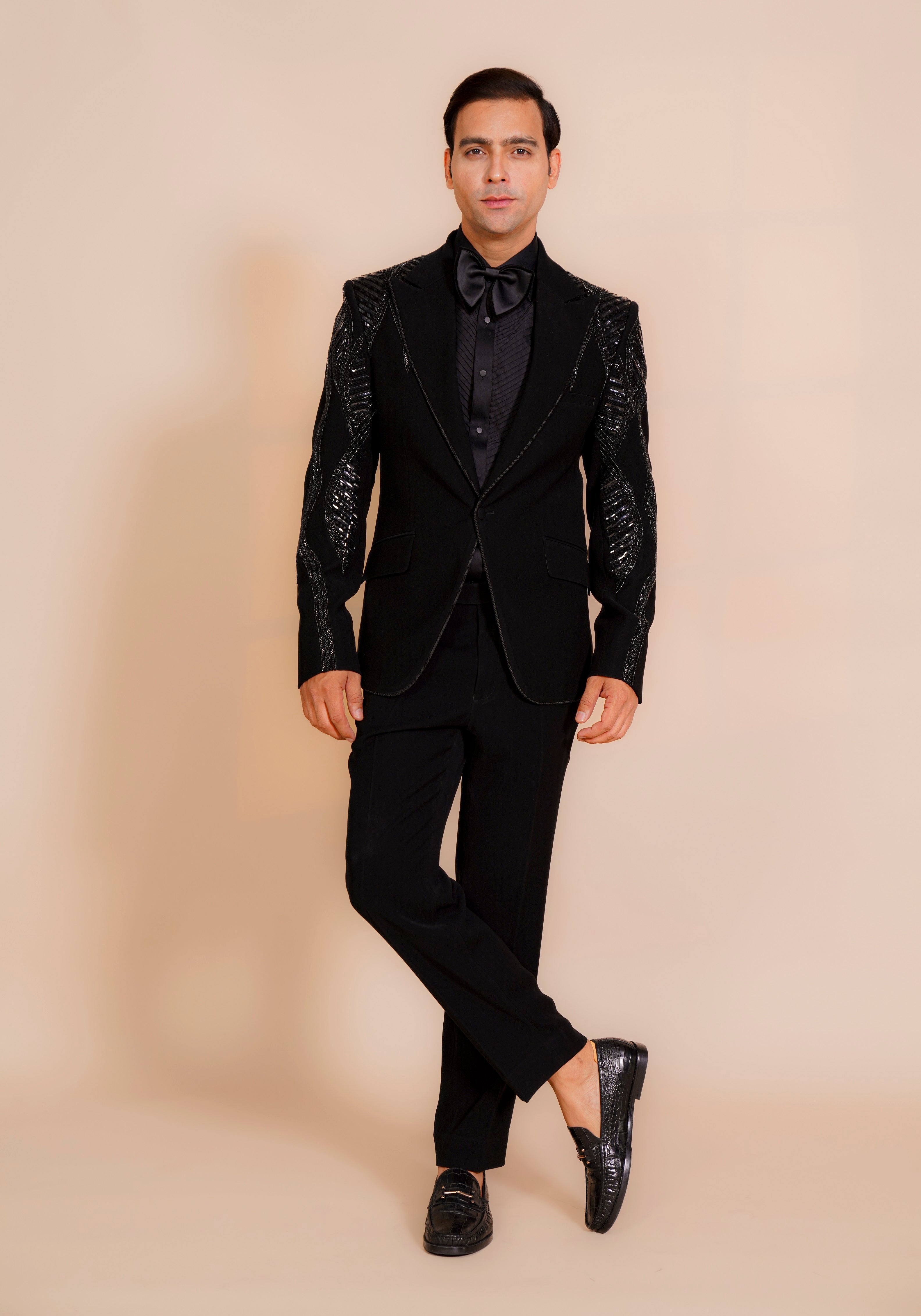 | Featuring the Black Tuxedo set Which is embroided on Sleeves and Shoulder hand crafted design with Metal Tapes. It is paired with Trouser |