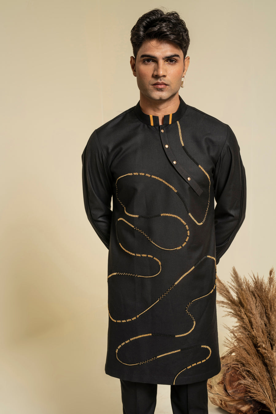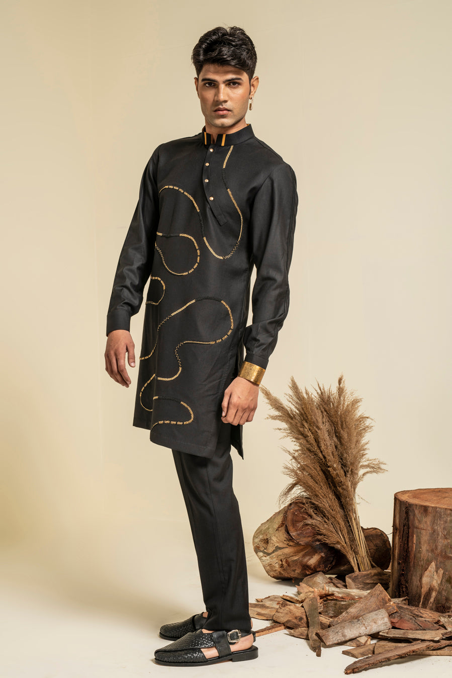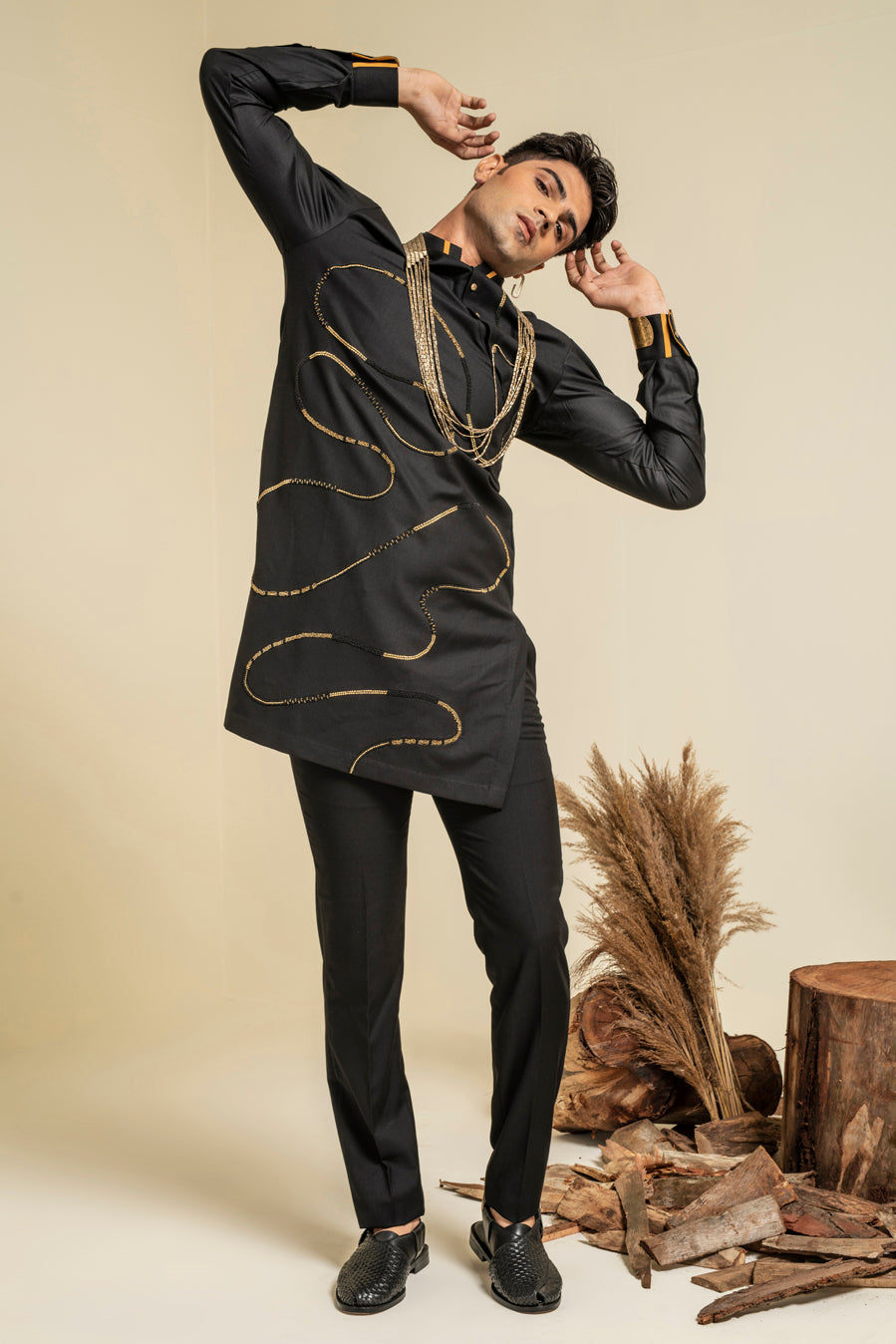 Featuring a black kurta in terry rayon base with beads and zari hand embroidery. It is paired with matching pants.