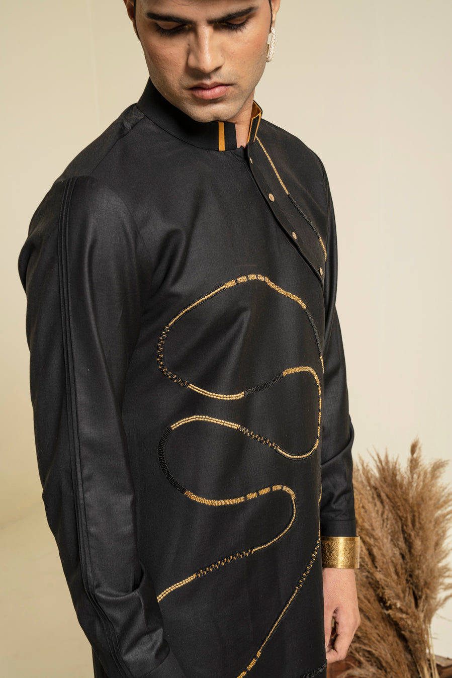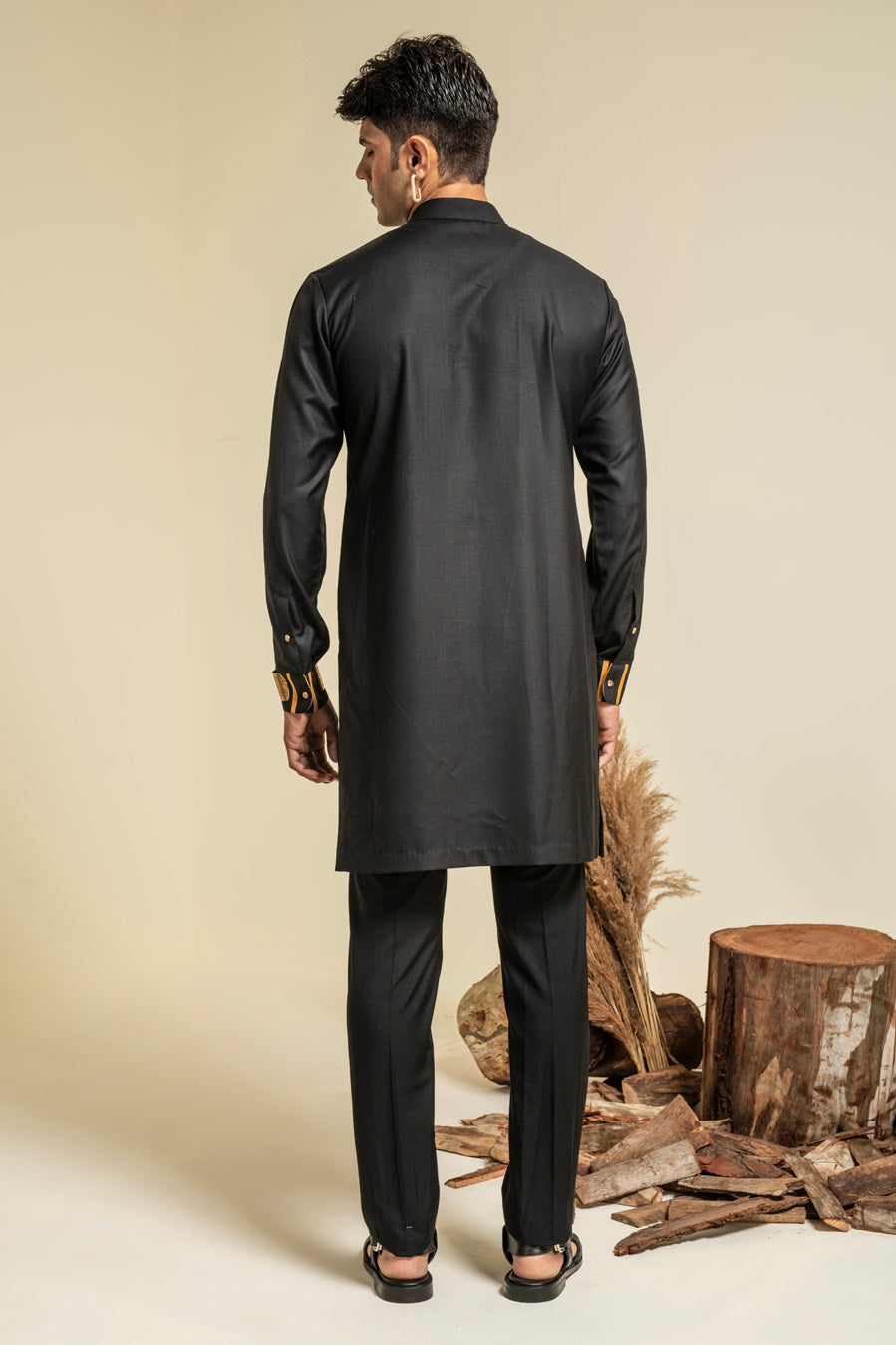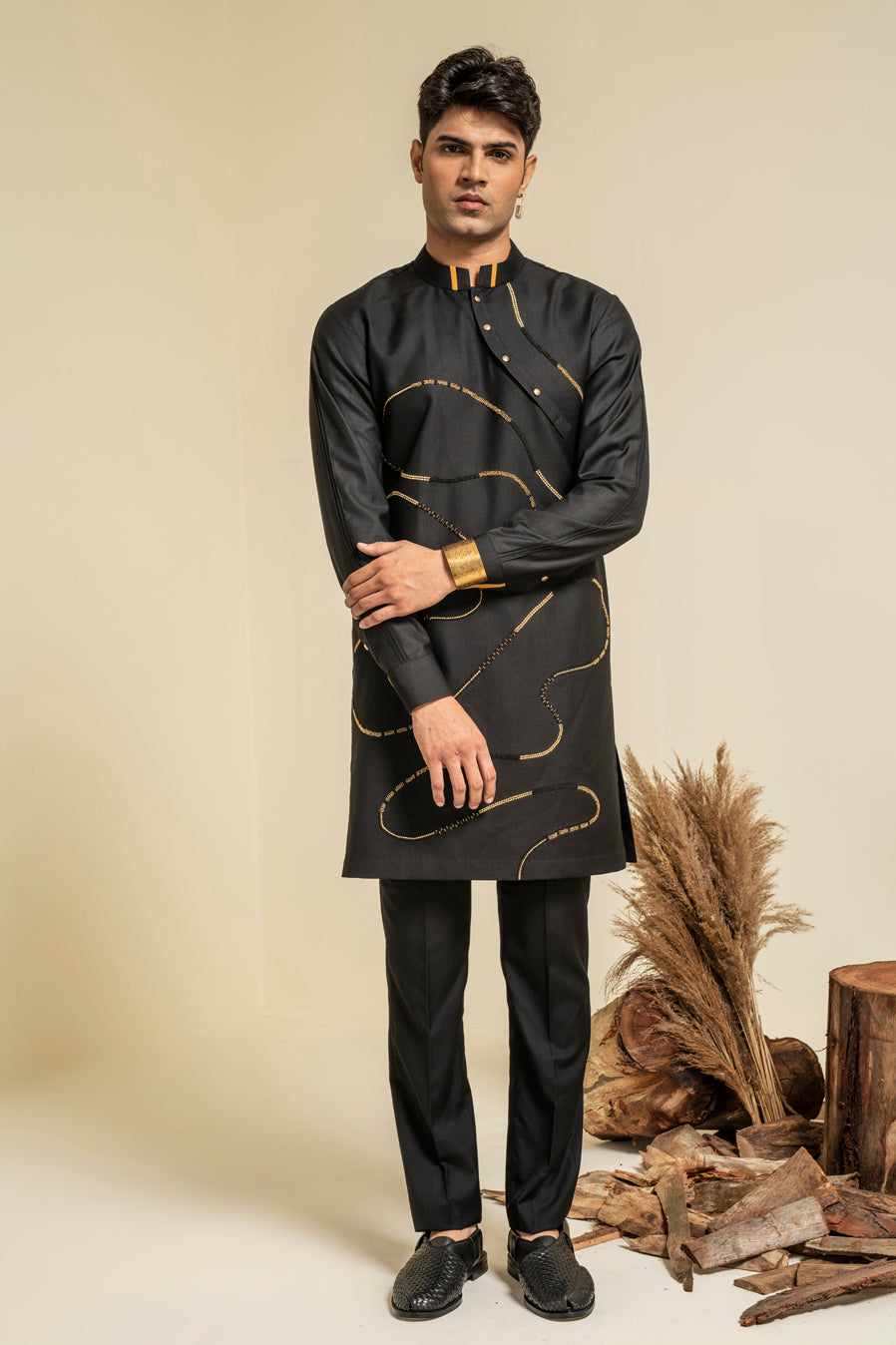 Featuring a black kurta in terry rayon base with beads and zari hand embroidery. It is paired with matching pants.
