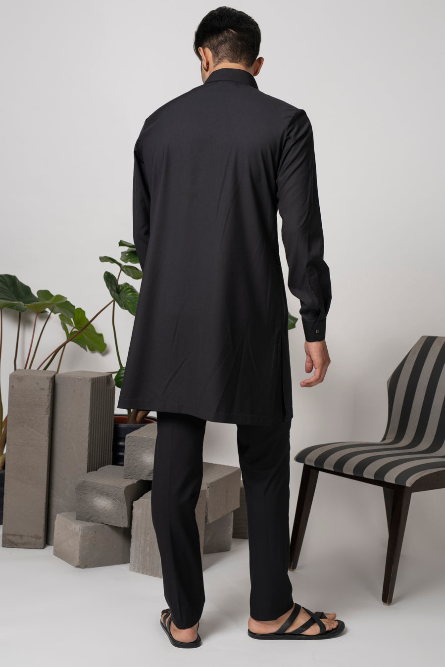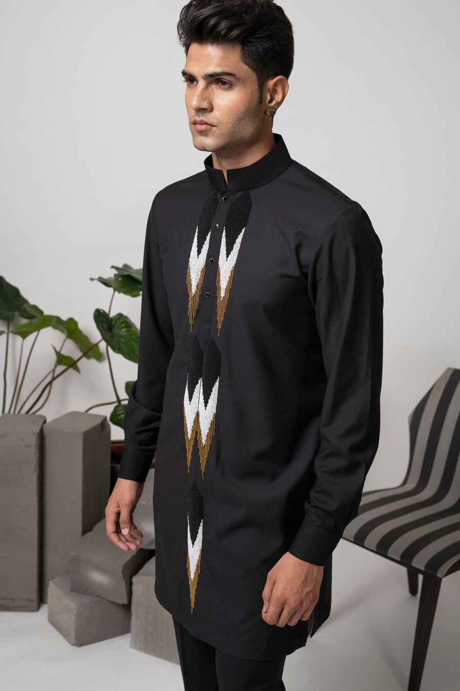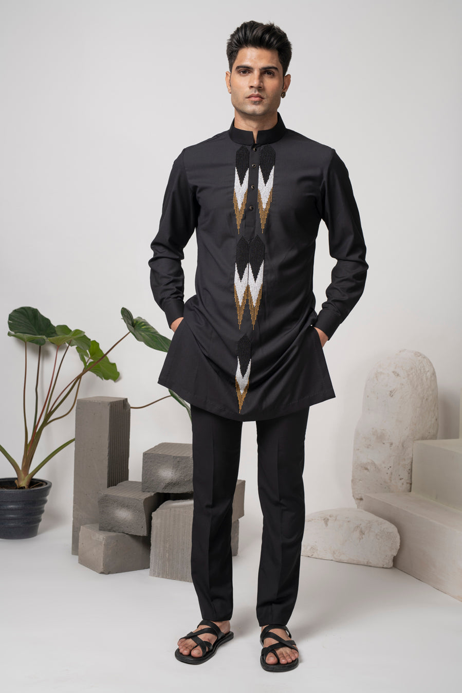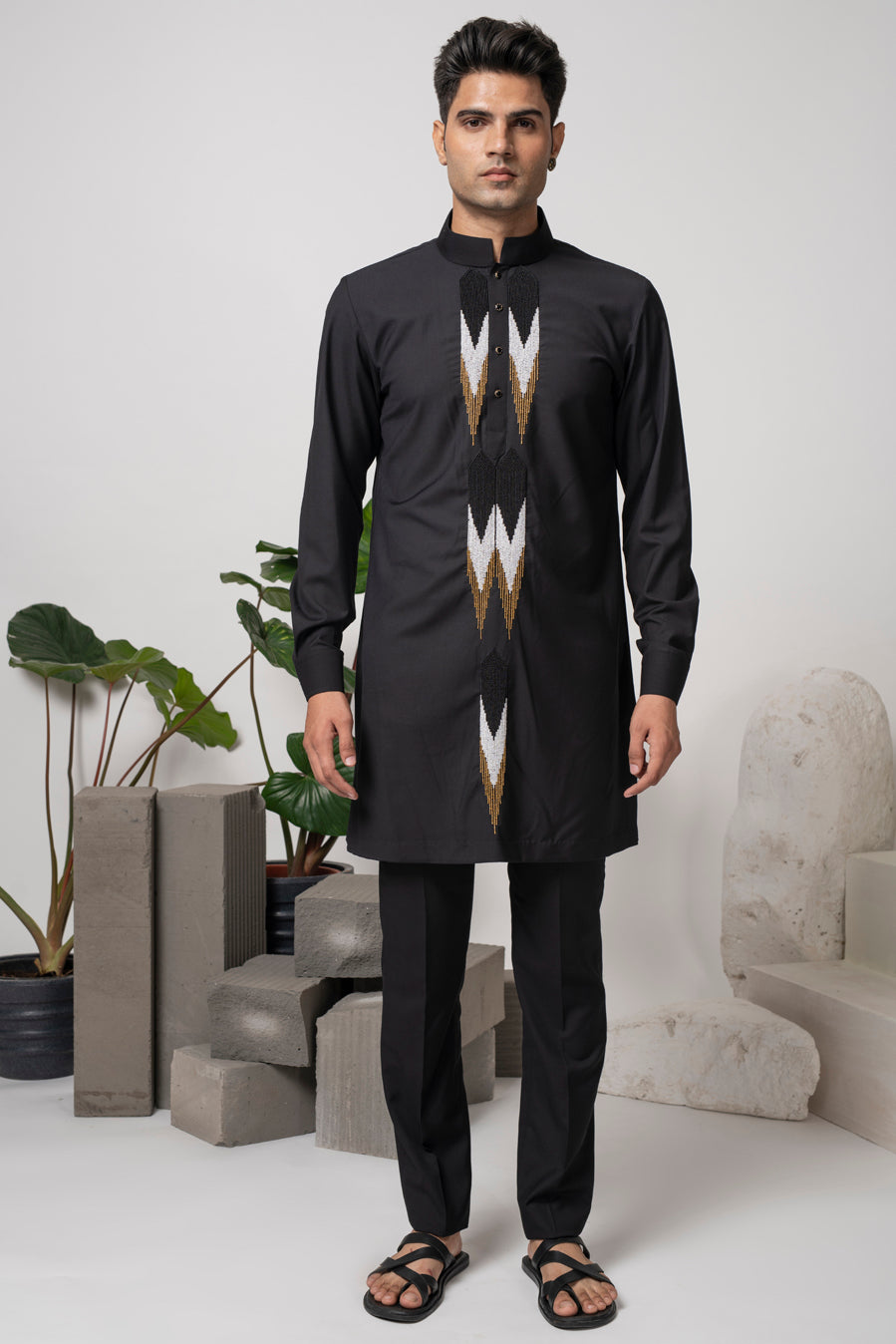 Featuring a black kurta in terry rayon base with beads hand embroidery. It is paired with matching pants.