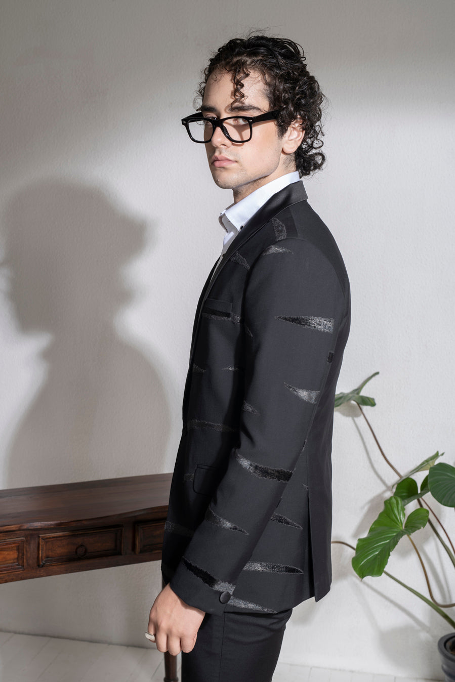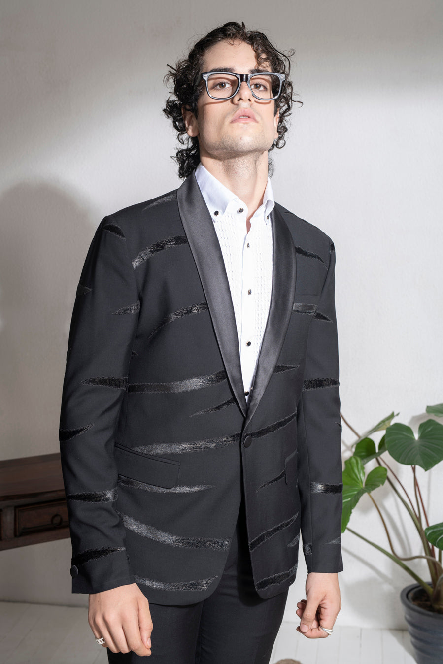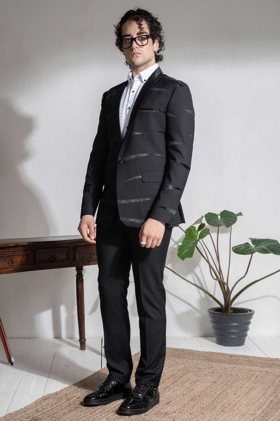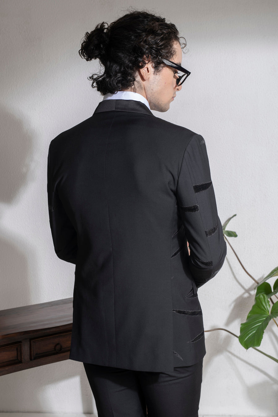 Featuring a black single button coat in terry rayon base with a shawl collar and velvet patchwork embroidery. It is paired with matching trousers. This contains two pieces only.