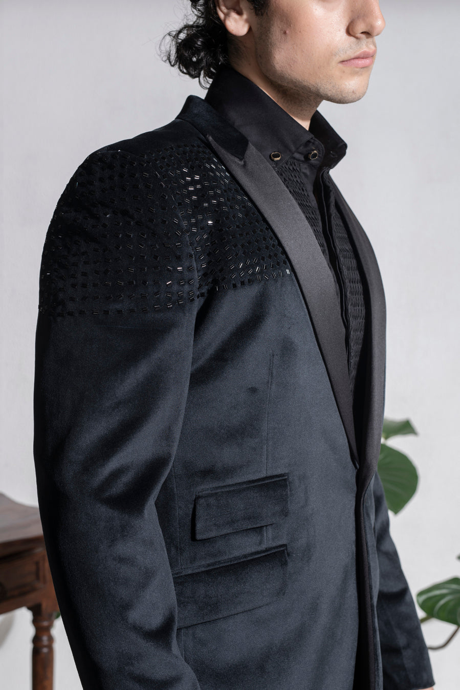 Featuring a black single button coat in velvet base with satin lapels and cylindrical bead hand embroidery. It is paired with matching terry rayon trousers. This contains two pieces only.