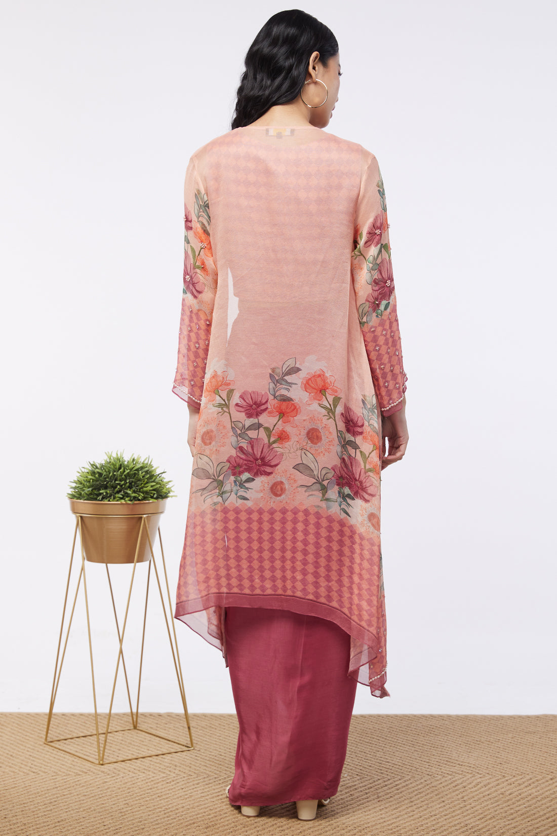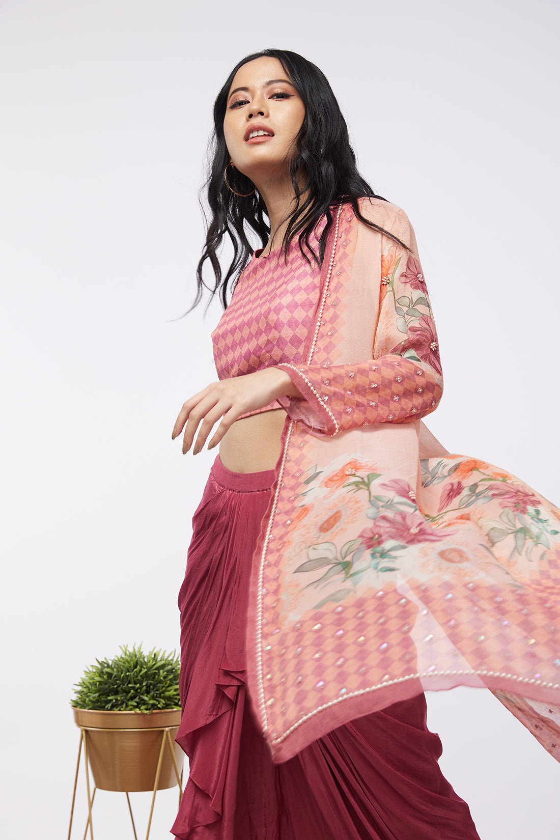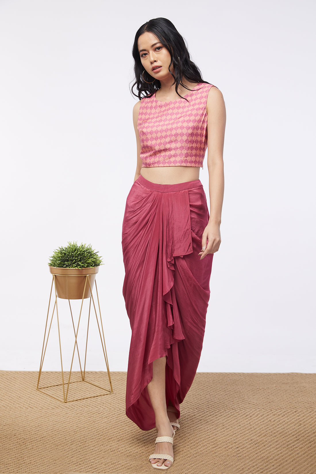 Featuring a pink drape skirt in crepe fabric. It is paired with a crop top & skimmer jacket.