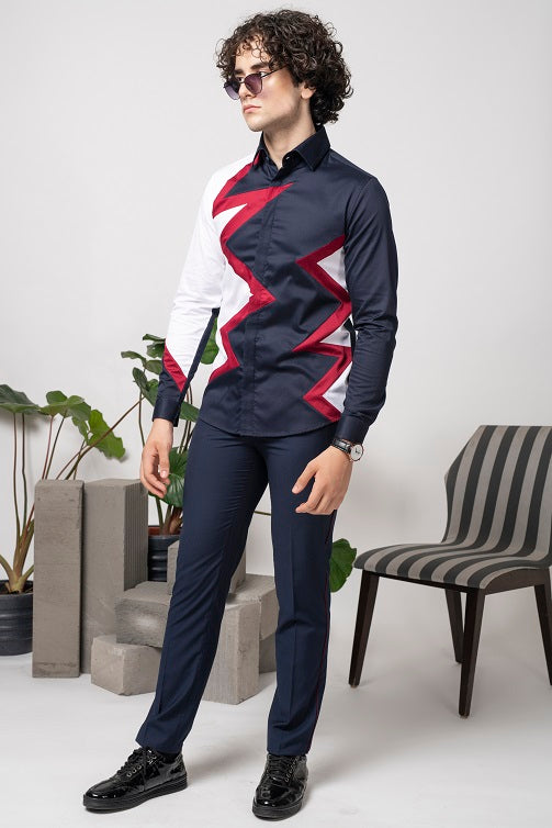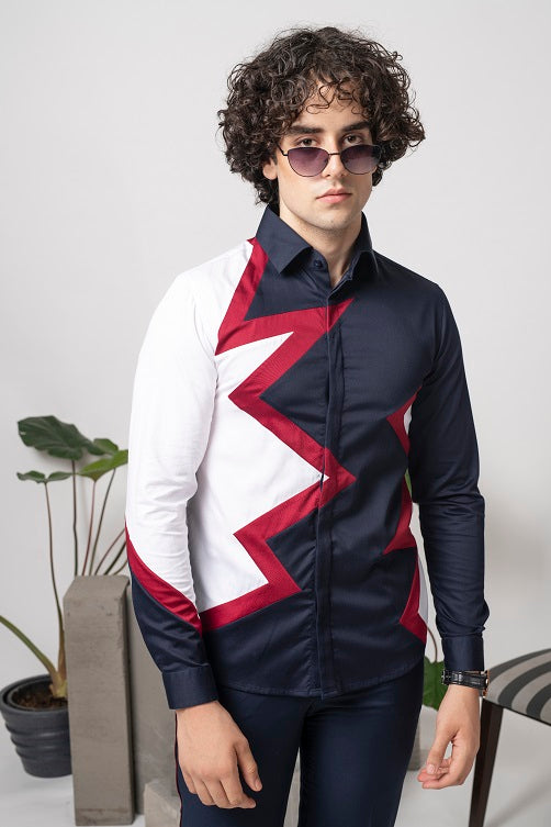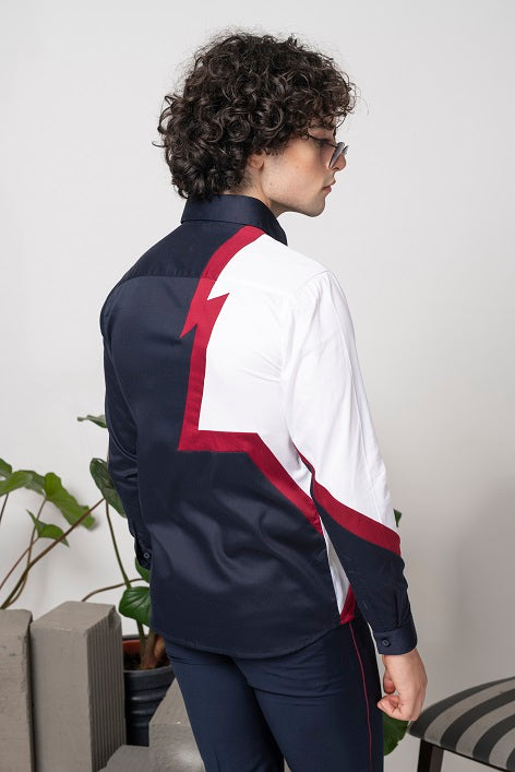 Blue cotton shirt with colour blocking