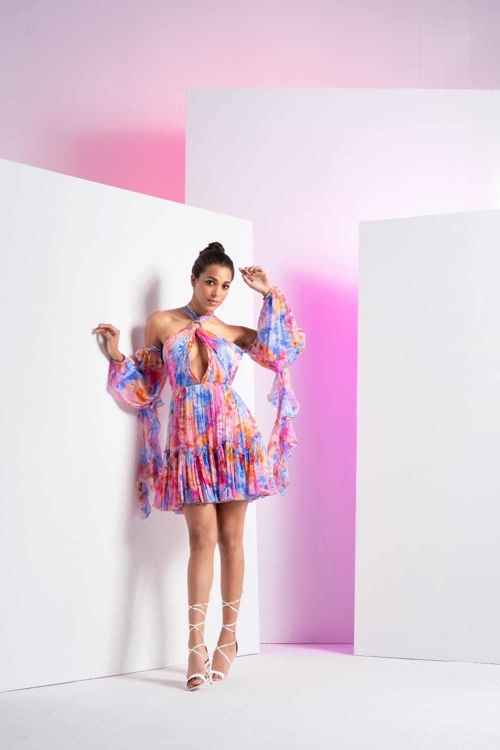 The Blue Floral Camo short dress with cascade sleeves is a captivating blend of contrasting elements. Combining the delicate allure of florals with the edgy, urban vibe of camouflage patterns, this dress creates a unique and eye-catching style. The cascade sleeves add an element of whimsy and movement to the ensemble, and the rich blue color adds a touch of depth and intrigue. This dress beautifully marries classic and contemporary aesthetics, making it a standout choice for those who want to showcase their individuality and fashion-forward sensibilities. It's the perfect pick for a special occasion, exuding both charm and a touch of urban edge in one striking dress.