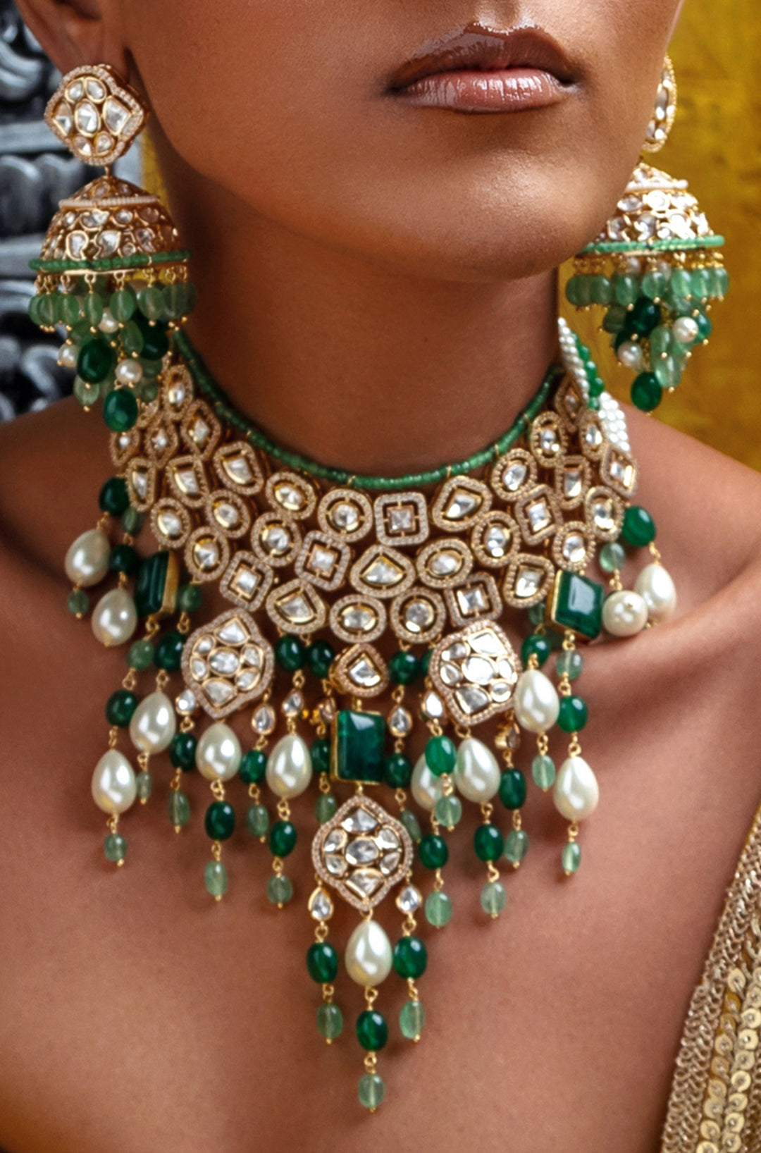 Bridal necklace set with jades & pearl drops