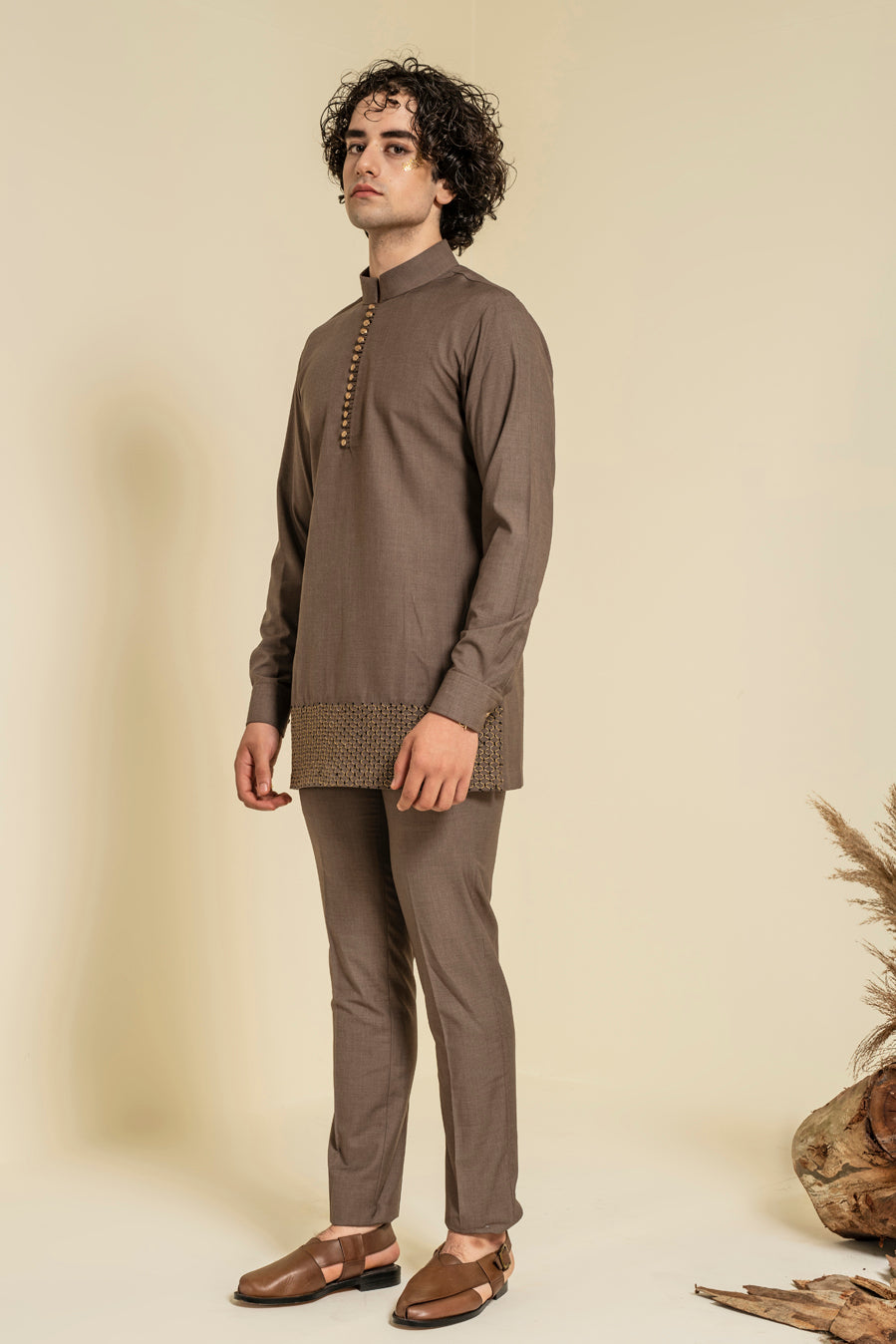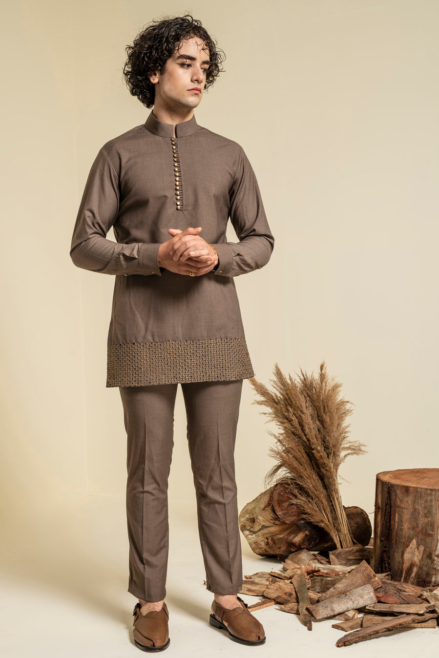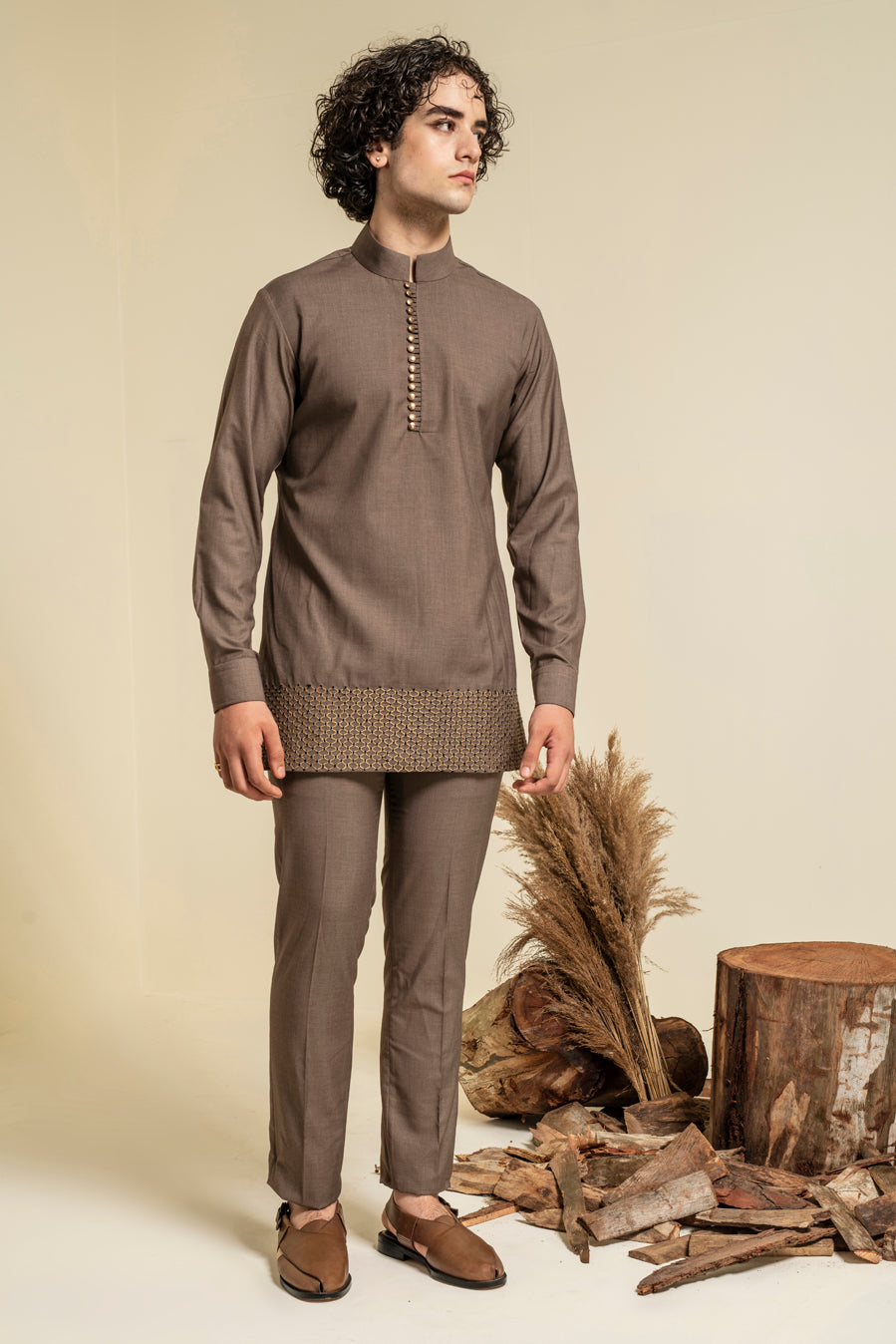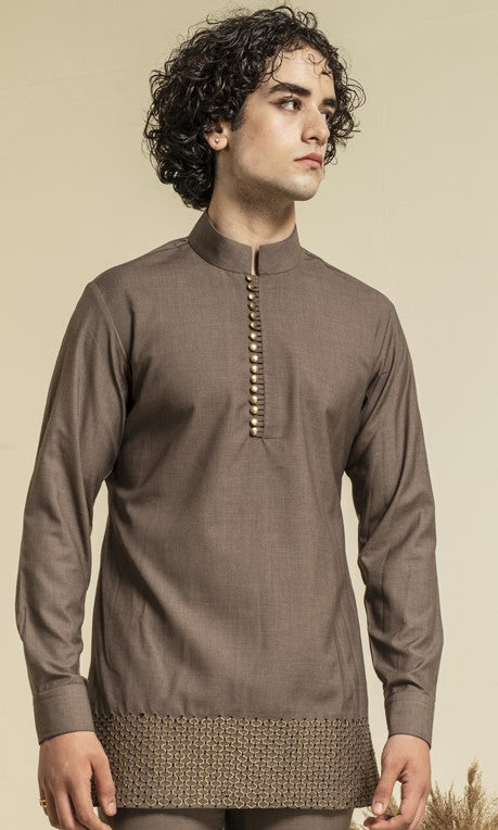 Featuring a brown kurta in terry rayon base with gold zari embroidery. It is paired with matching pants.