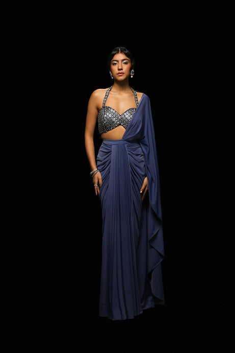 | Caelia saree is a lycra drape saree inspired ensemble with a cut out halter neck blouse. the embroidery is inspired by bling and motifs from the galaxy. |