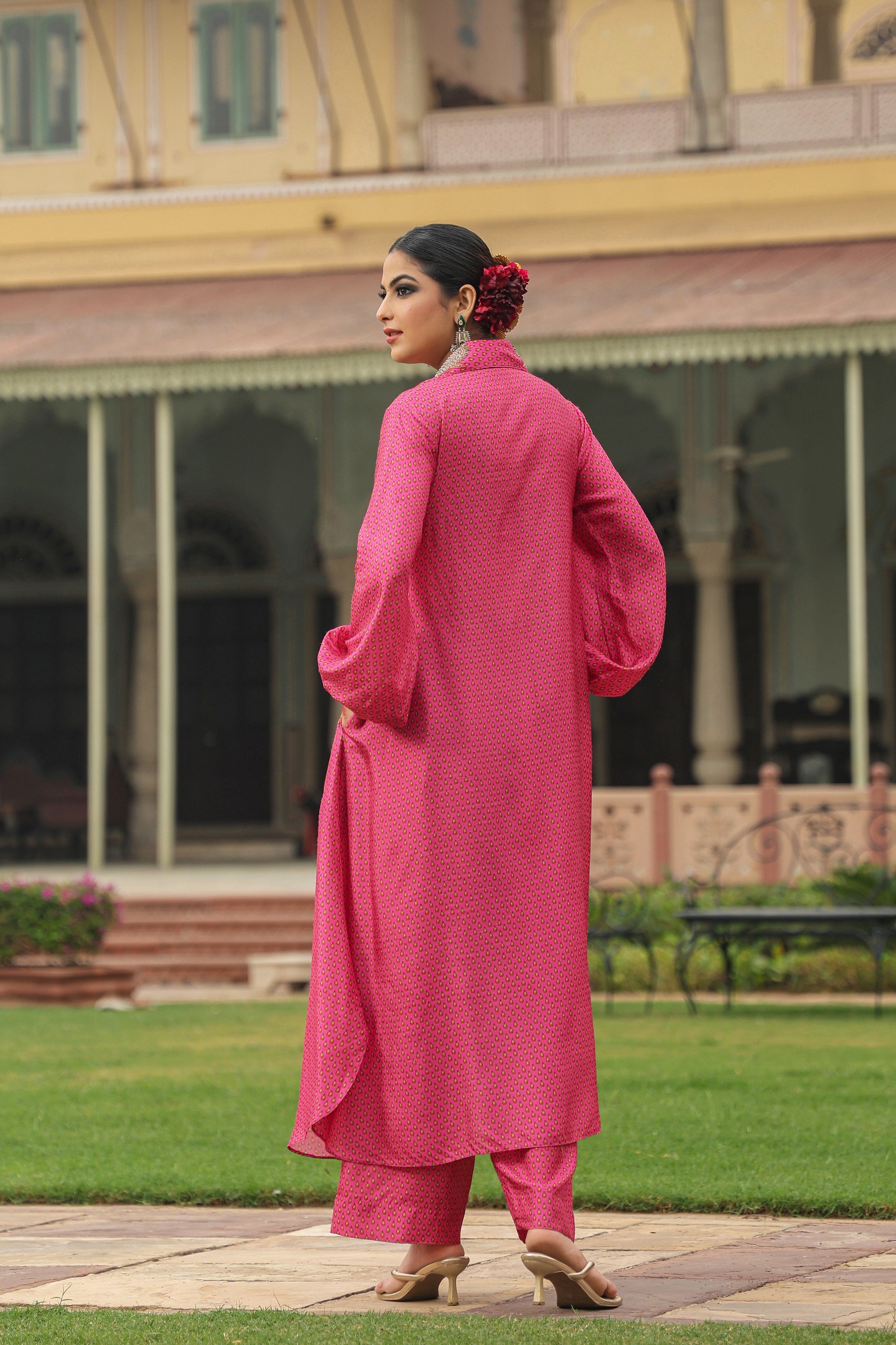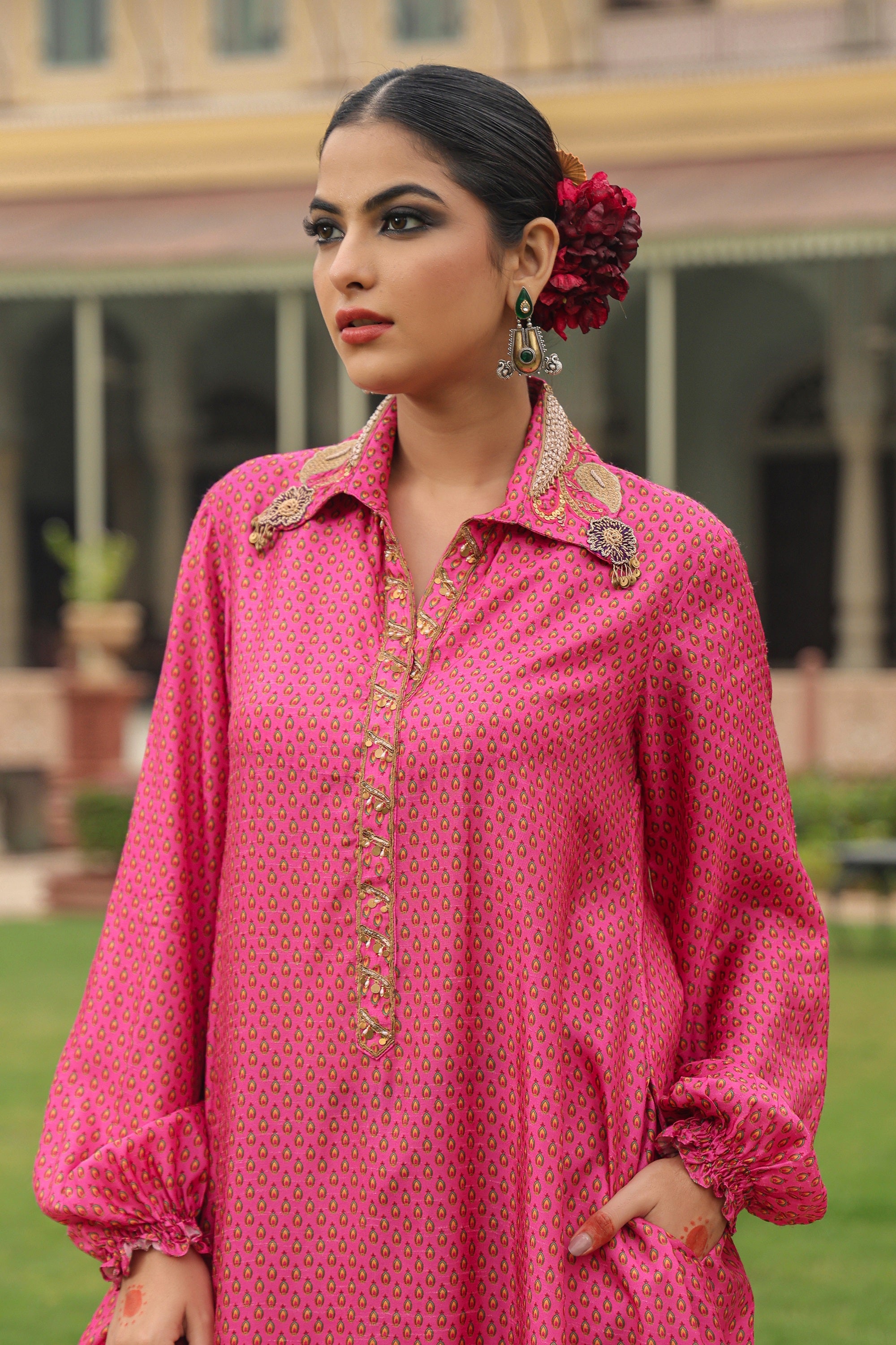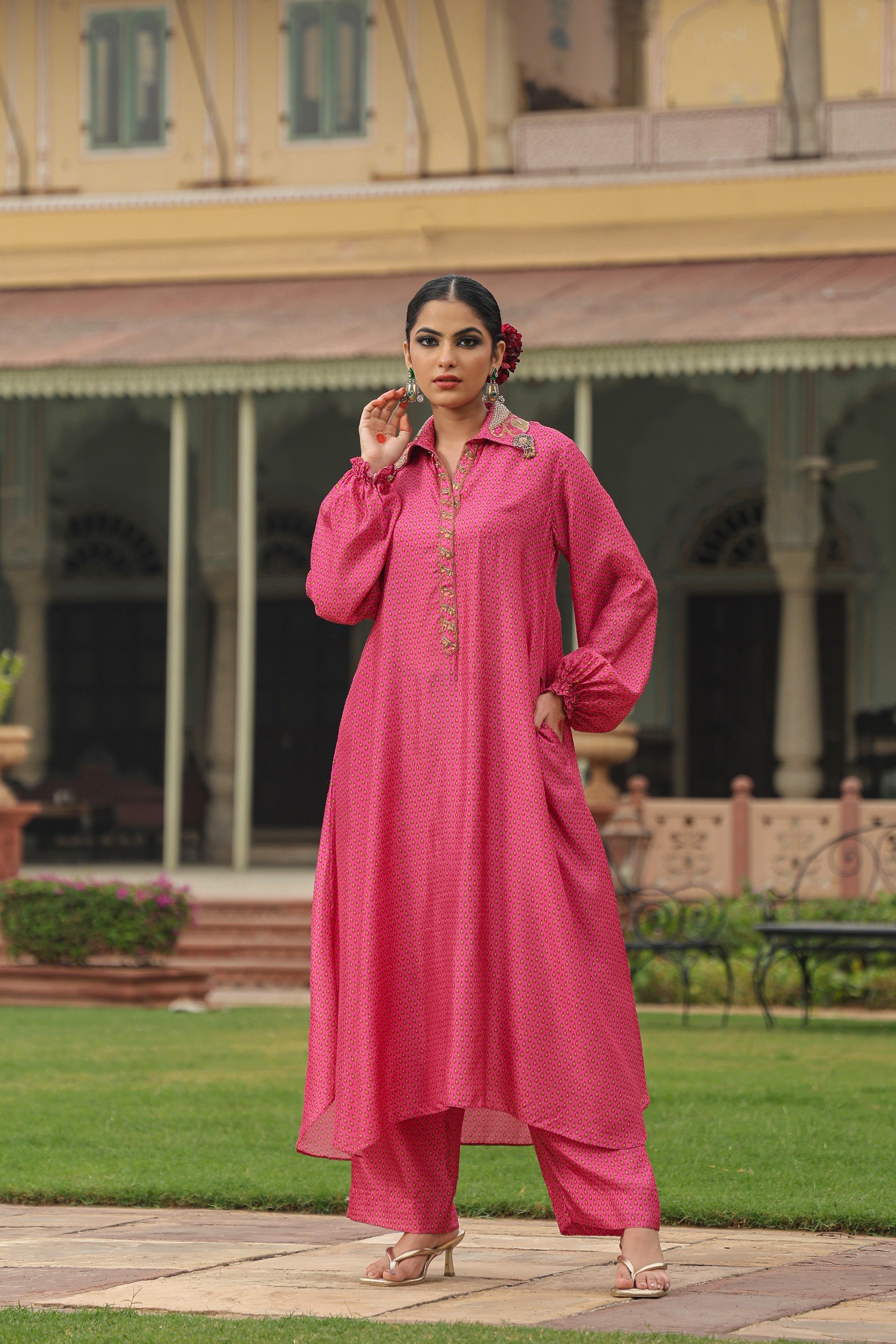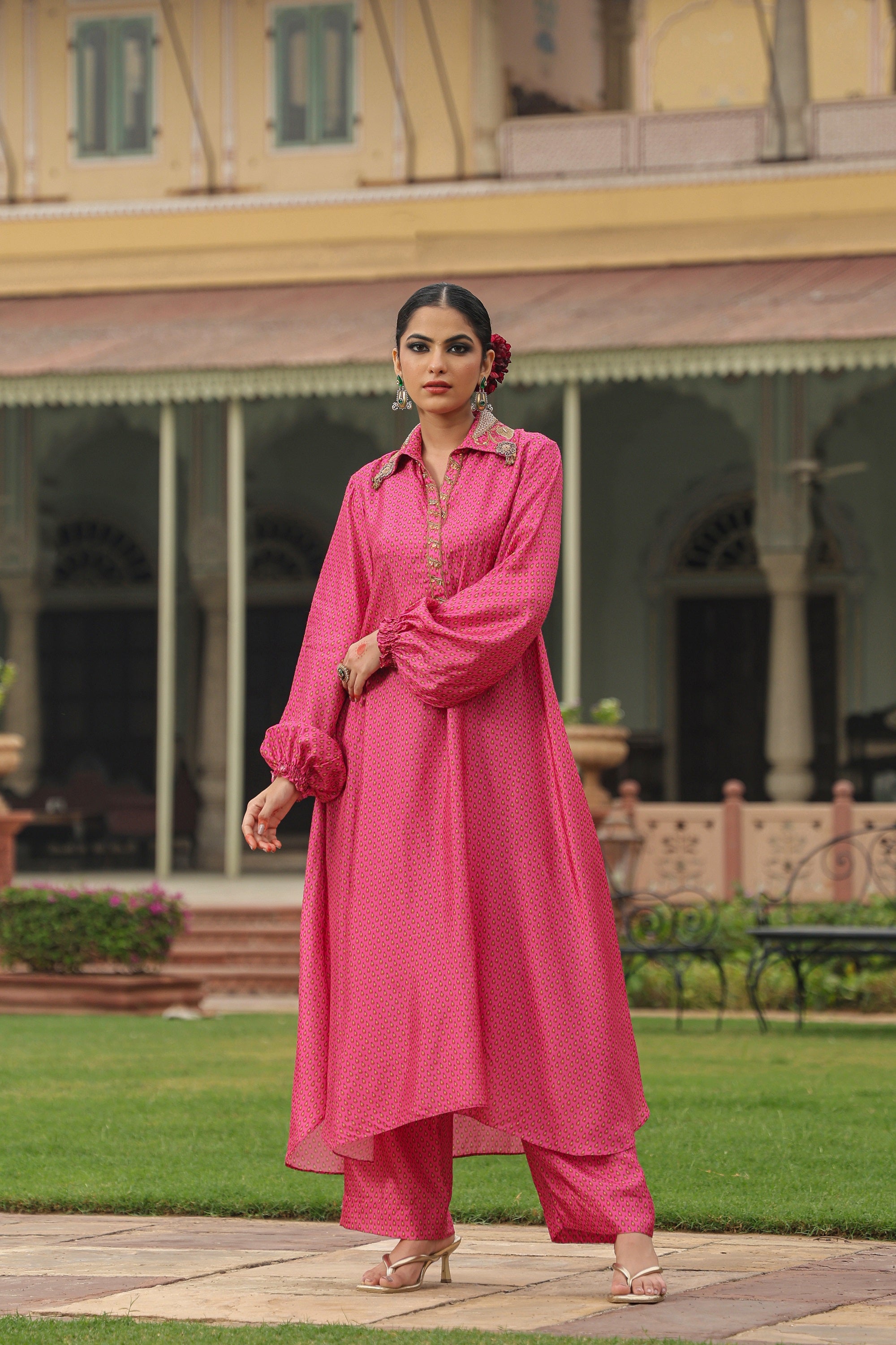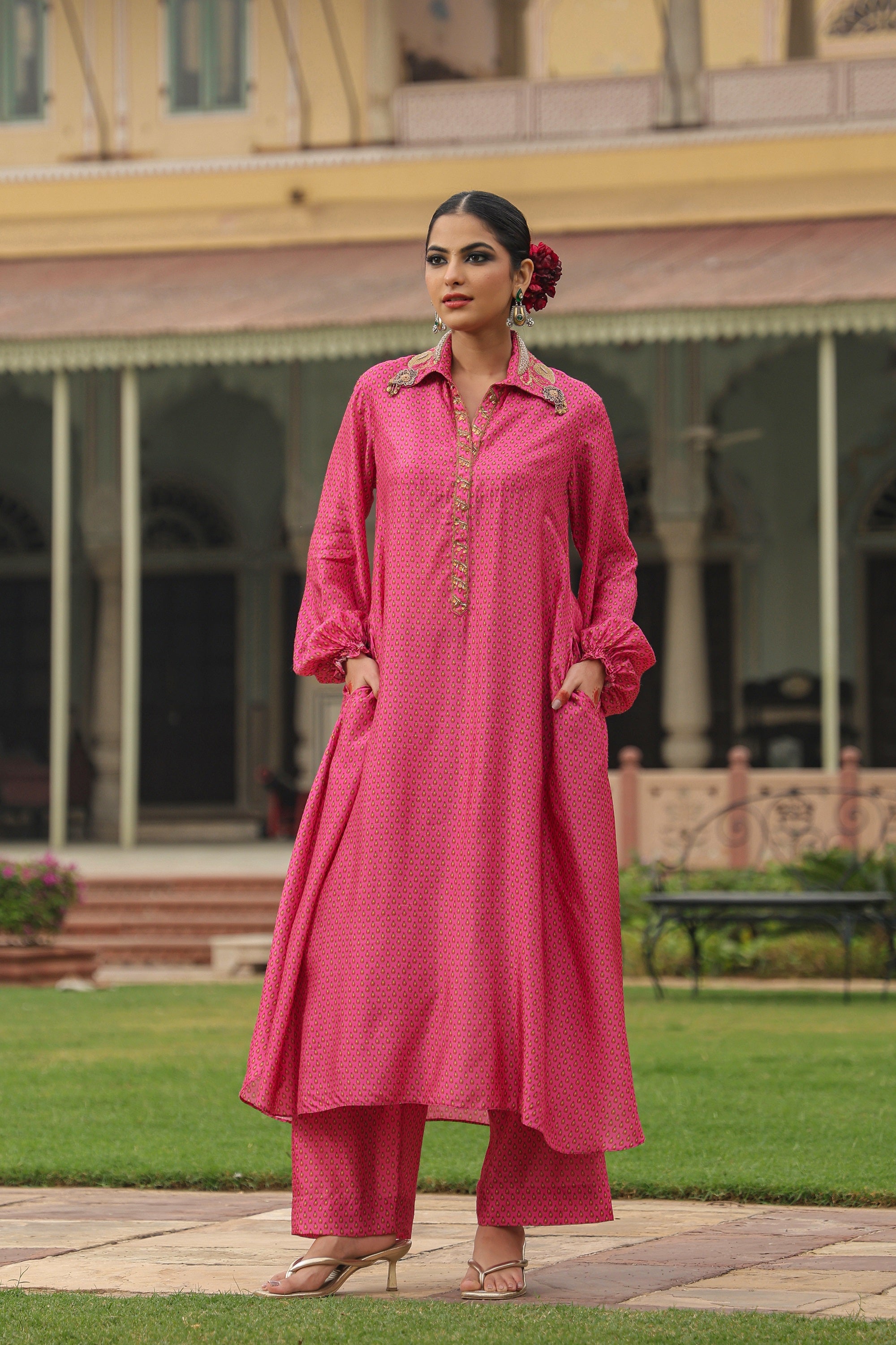 "This 2 pc Kurta Set comes with Balloon sleeve , applique motifs enhanced with pearls, zari and resham details on the collar