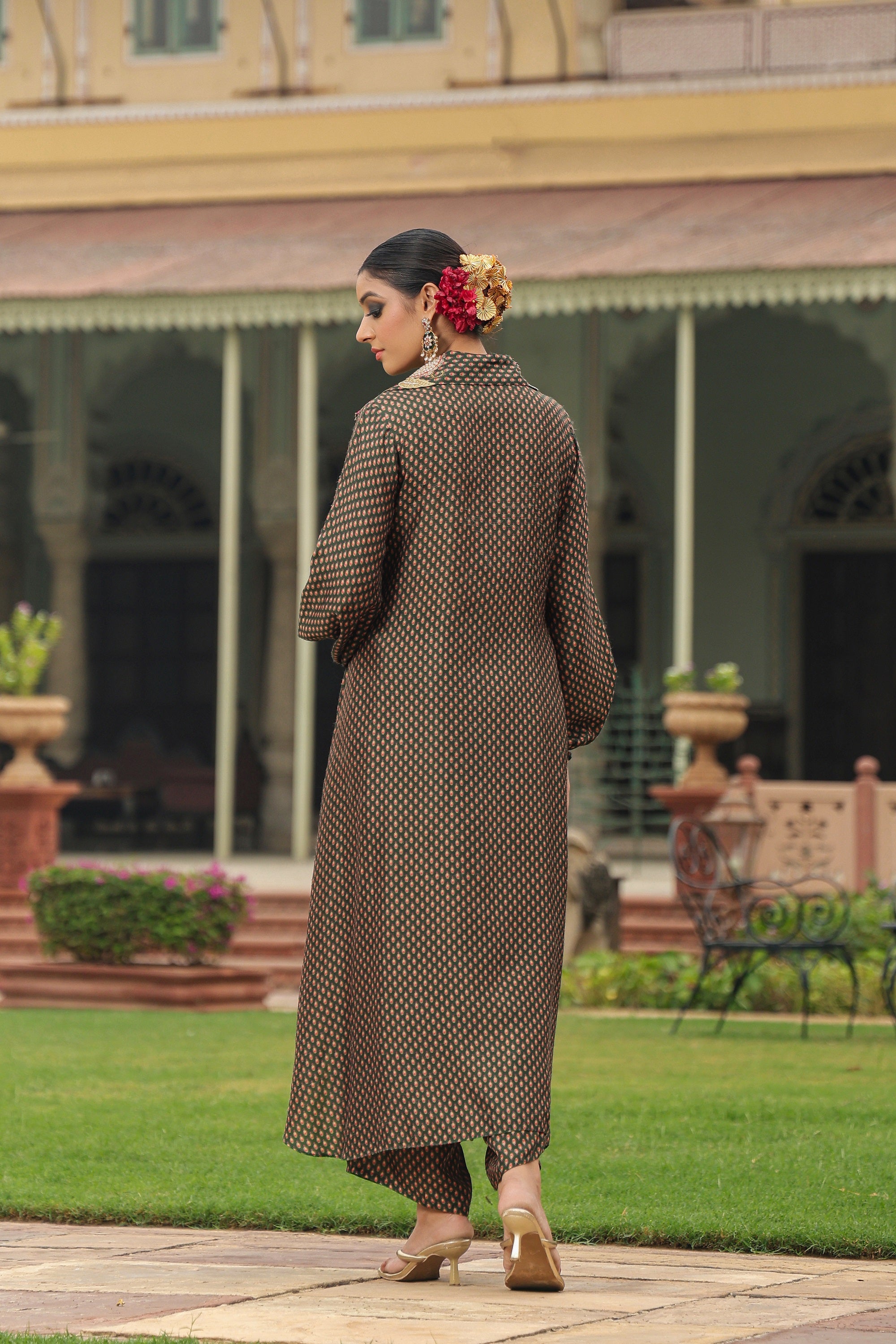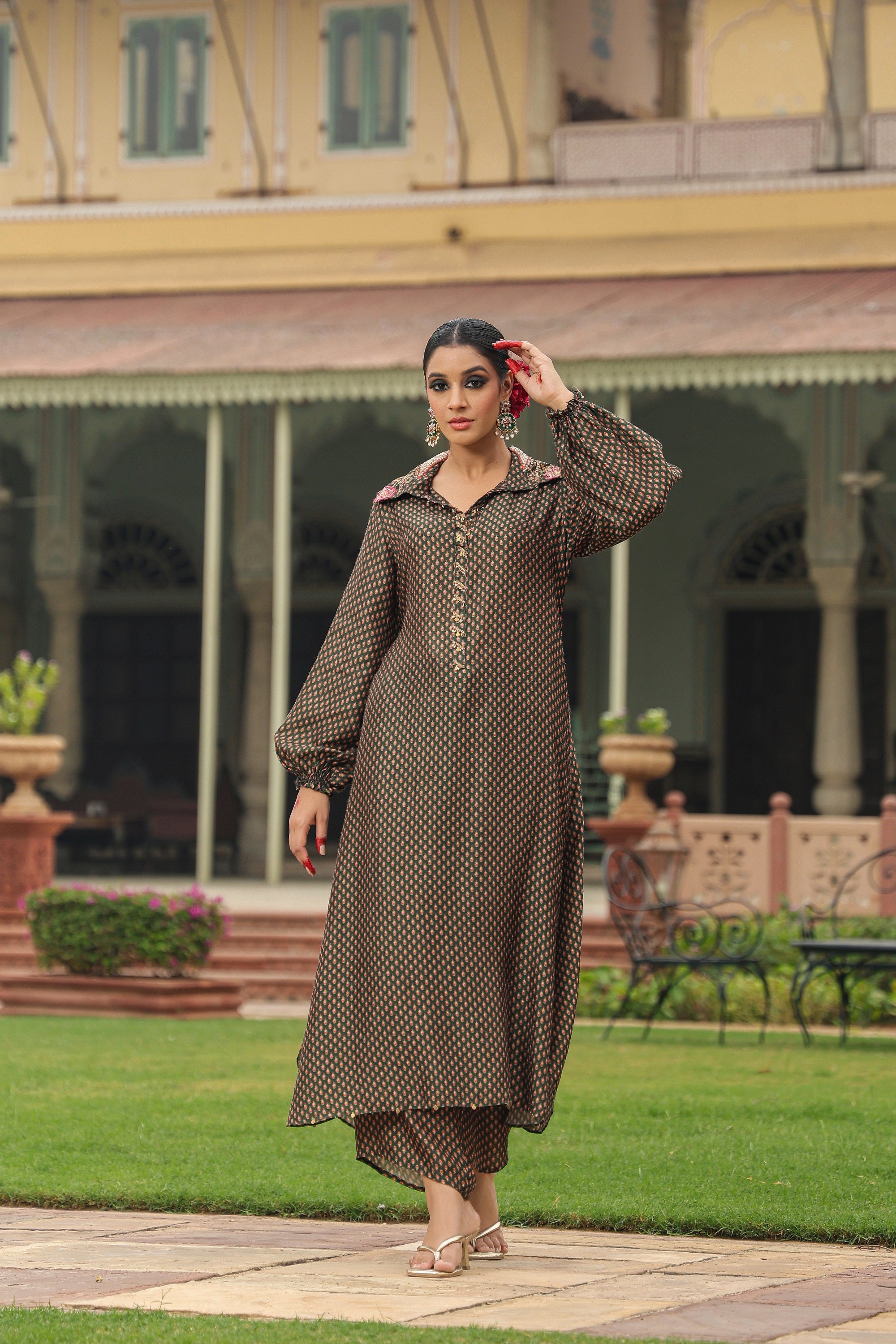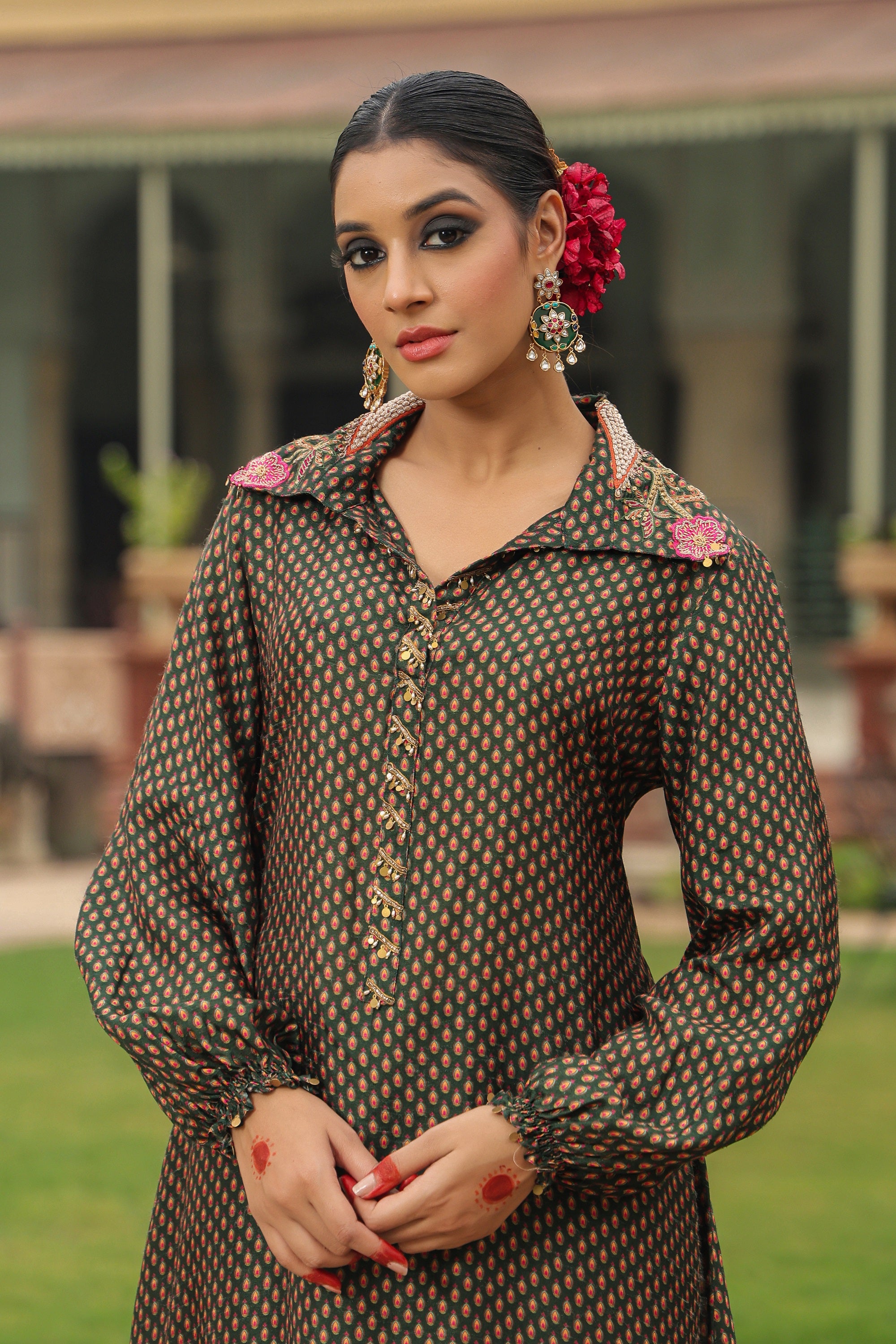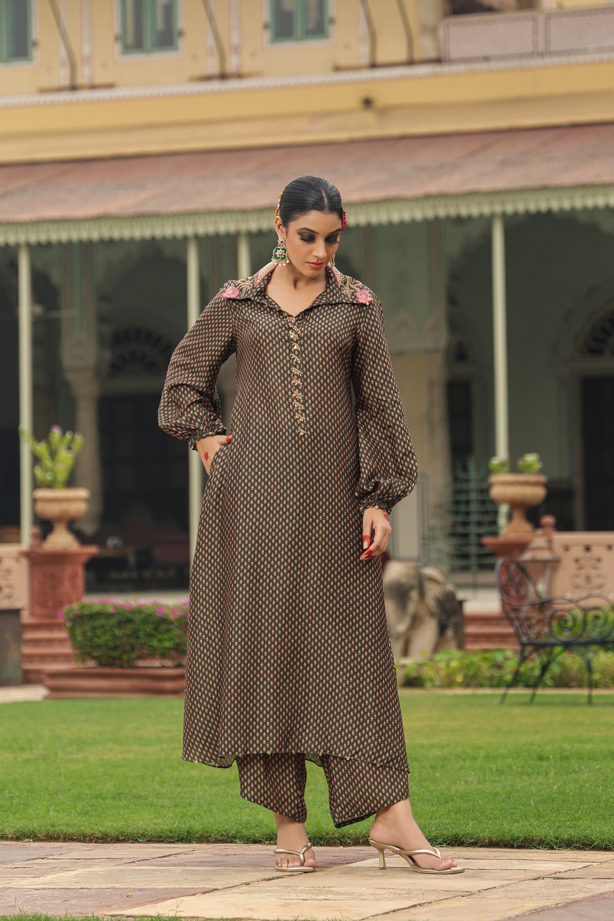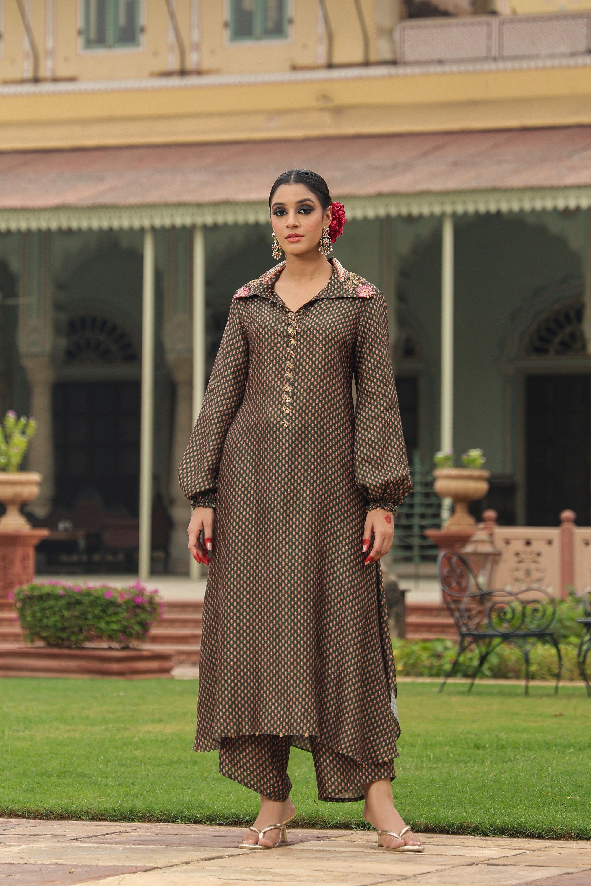 | This 2 pc Kurta Set comes with Balloon sleeve , applique motifs enhanced with pearls, zari and resham details on the collar Paired with applique motifs straight pants |