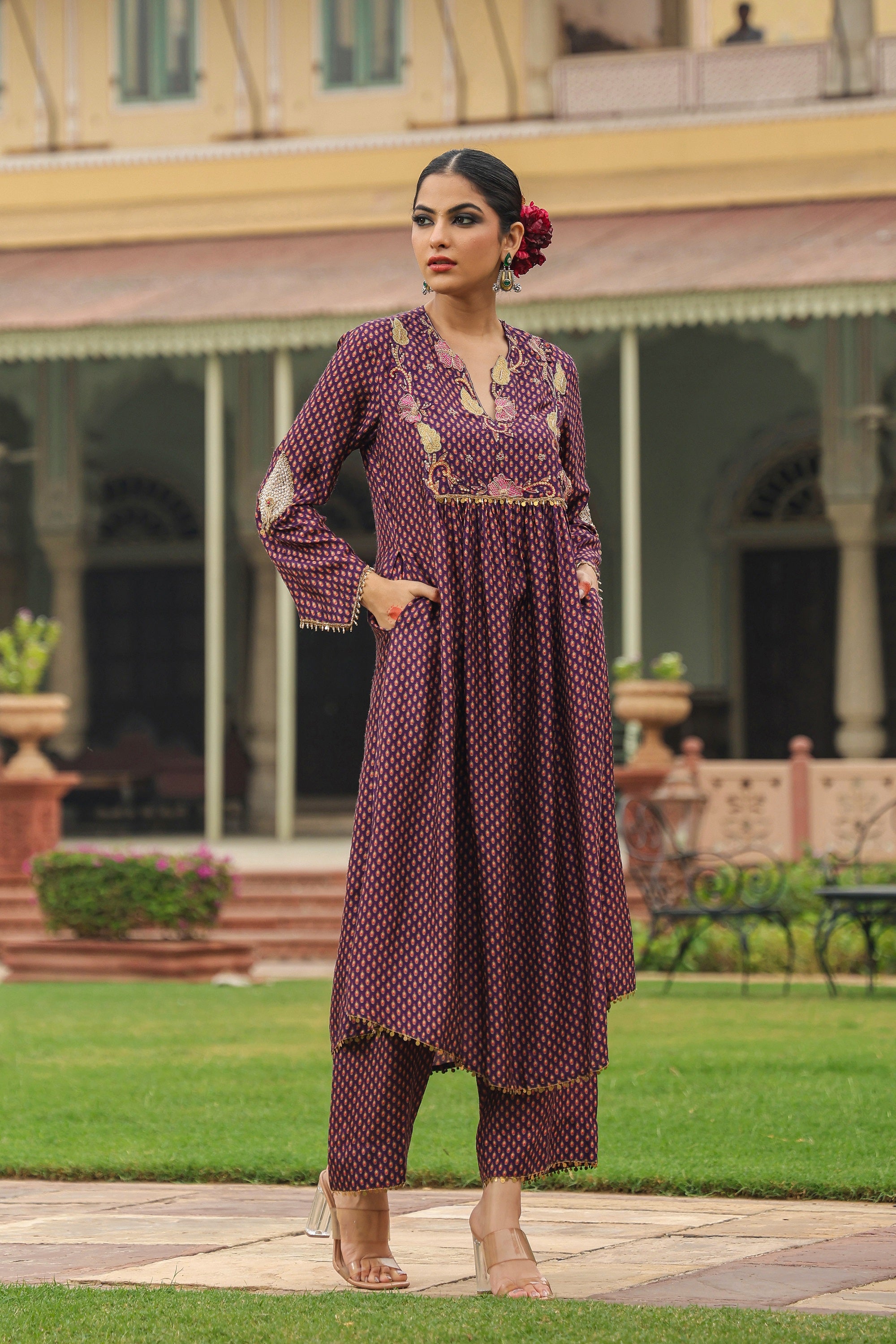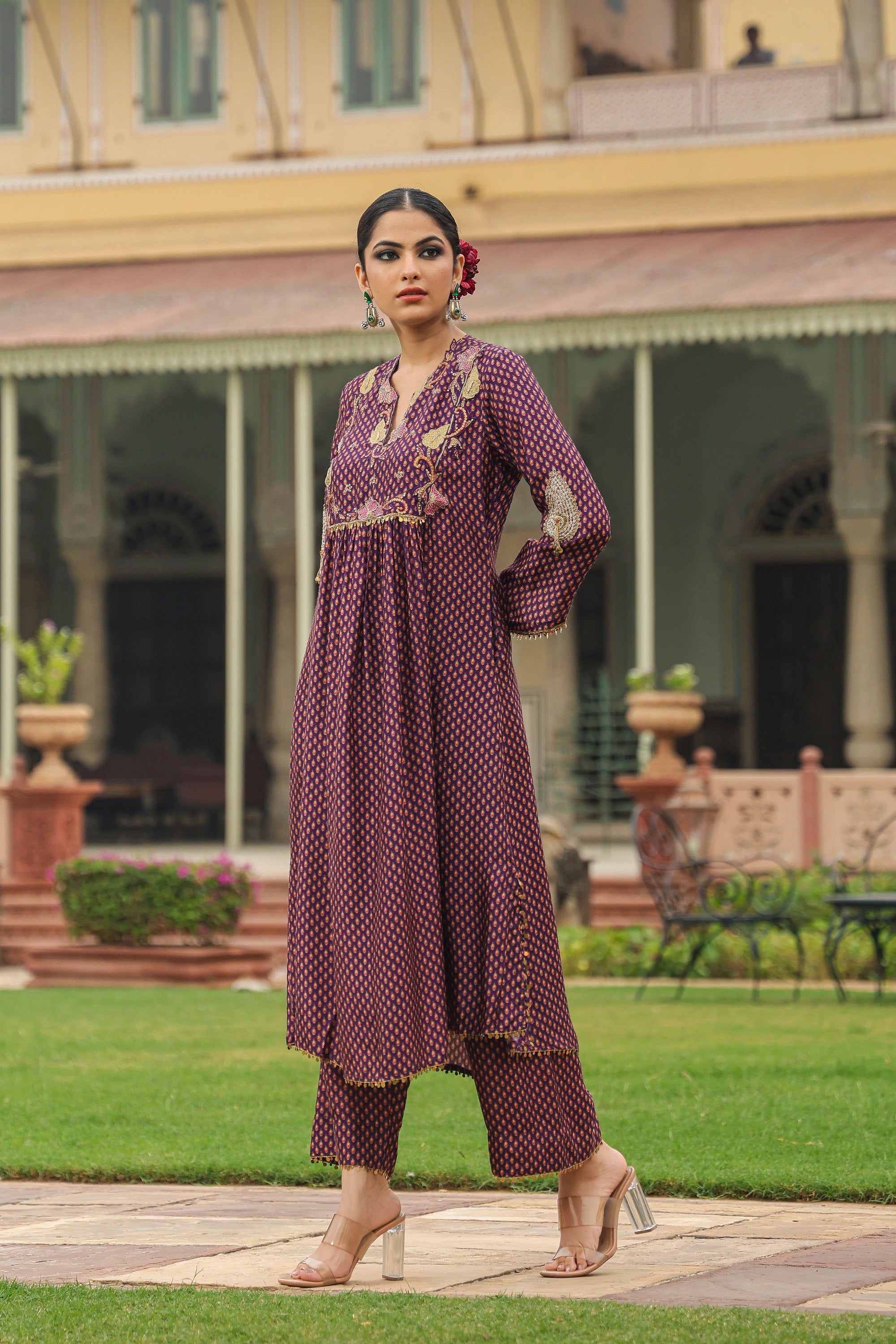 | This 2 pc Kurta set comes with yoke wit Applique motifs enhanced with pearls, Zari and resham thread work and pearl badaam butta on the sleeve Delicate detailing of tikkis and pearls on the cuffs, hem line and bottom of the palazzos |
