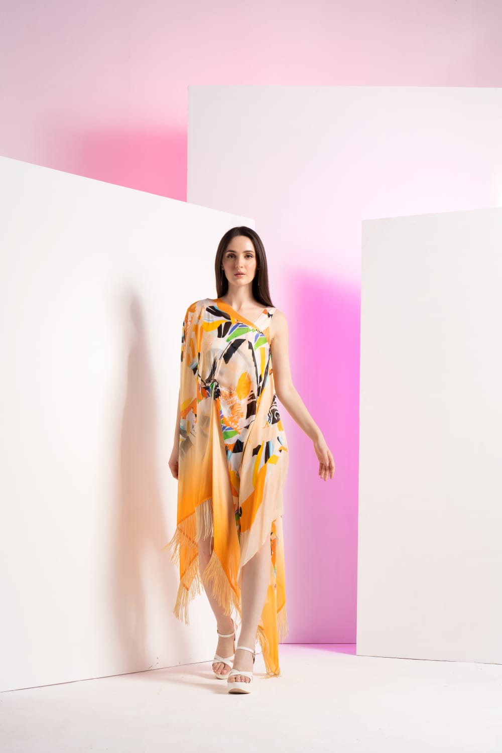 Chrome cornhusk metal ring detail body suit along with a cape detailed with fringe lace