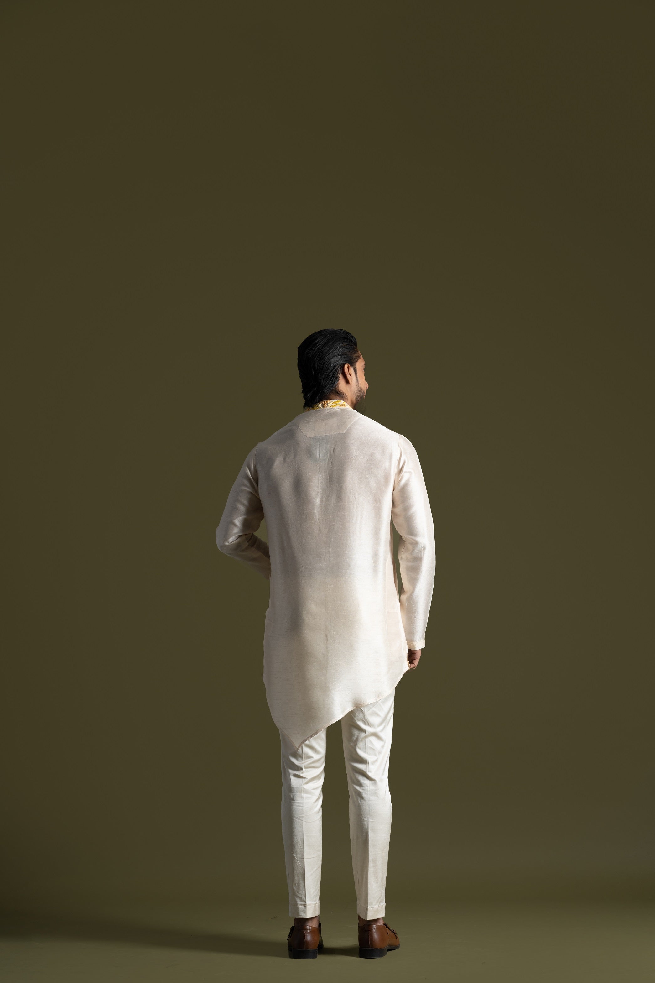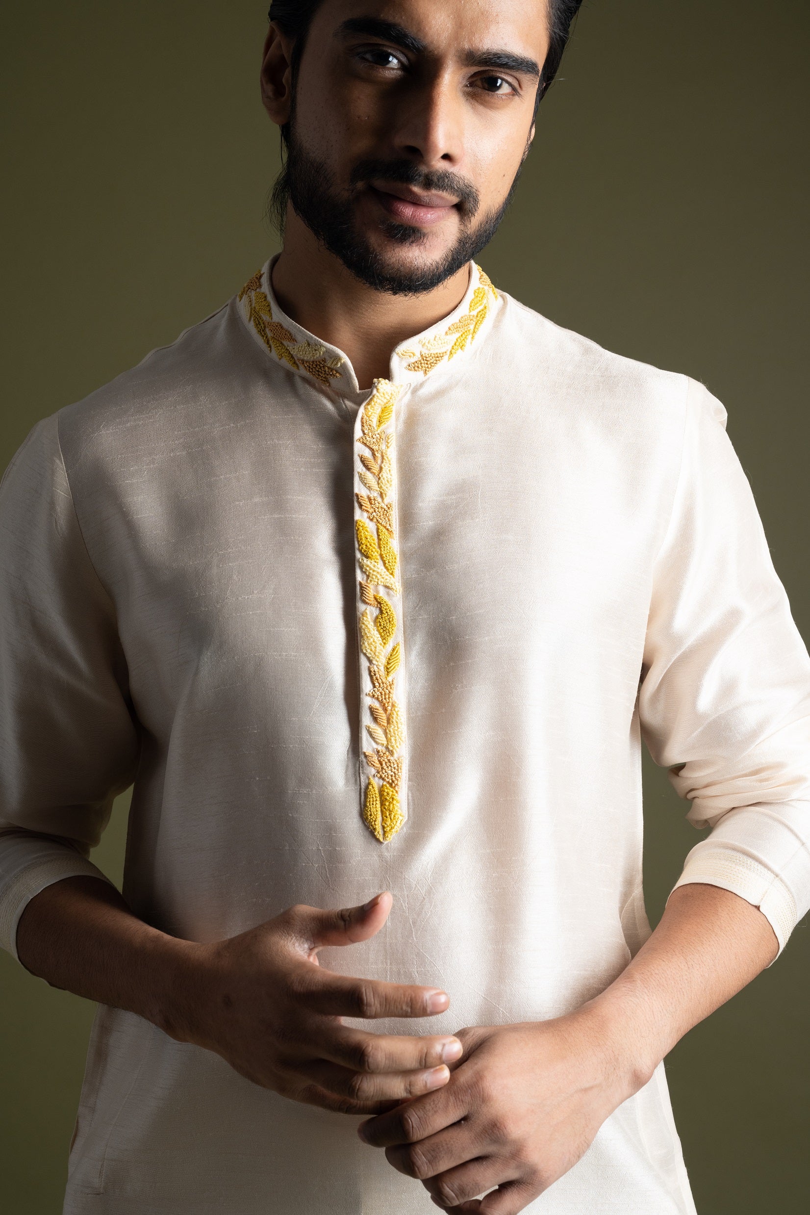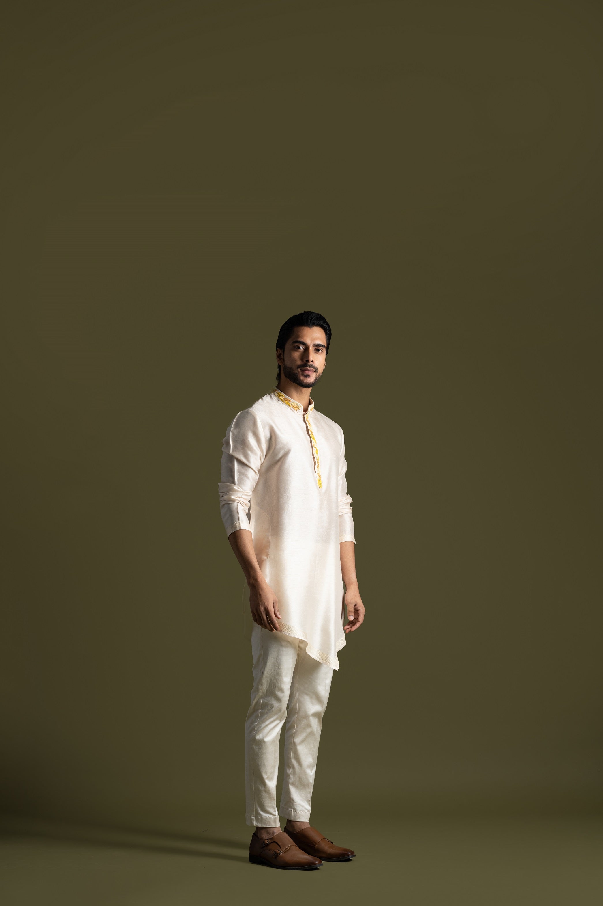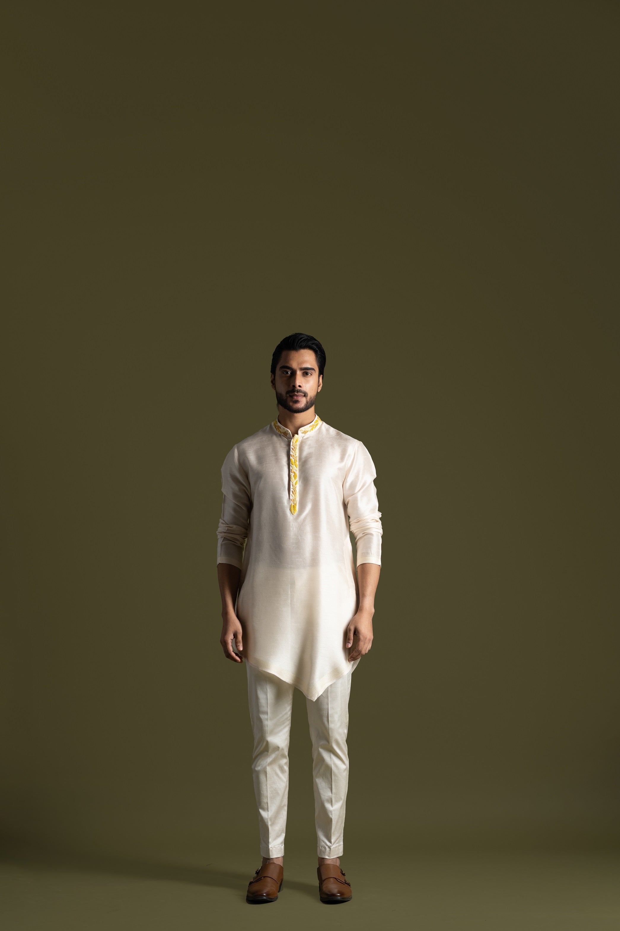 | CREAM KURTA IN SILK WITH AN ASSYMETRIC CUT AND SUBTLE EMBROIDERY AROUND COLLAR AND BUTTON PLACKET. PAIRED WIT A CREAM PANT PAJAMA |