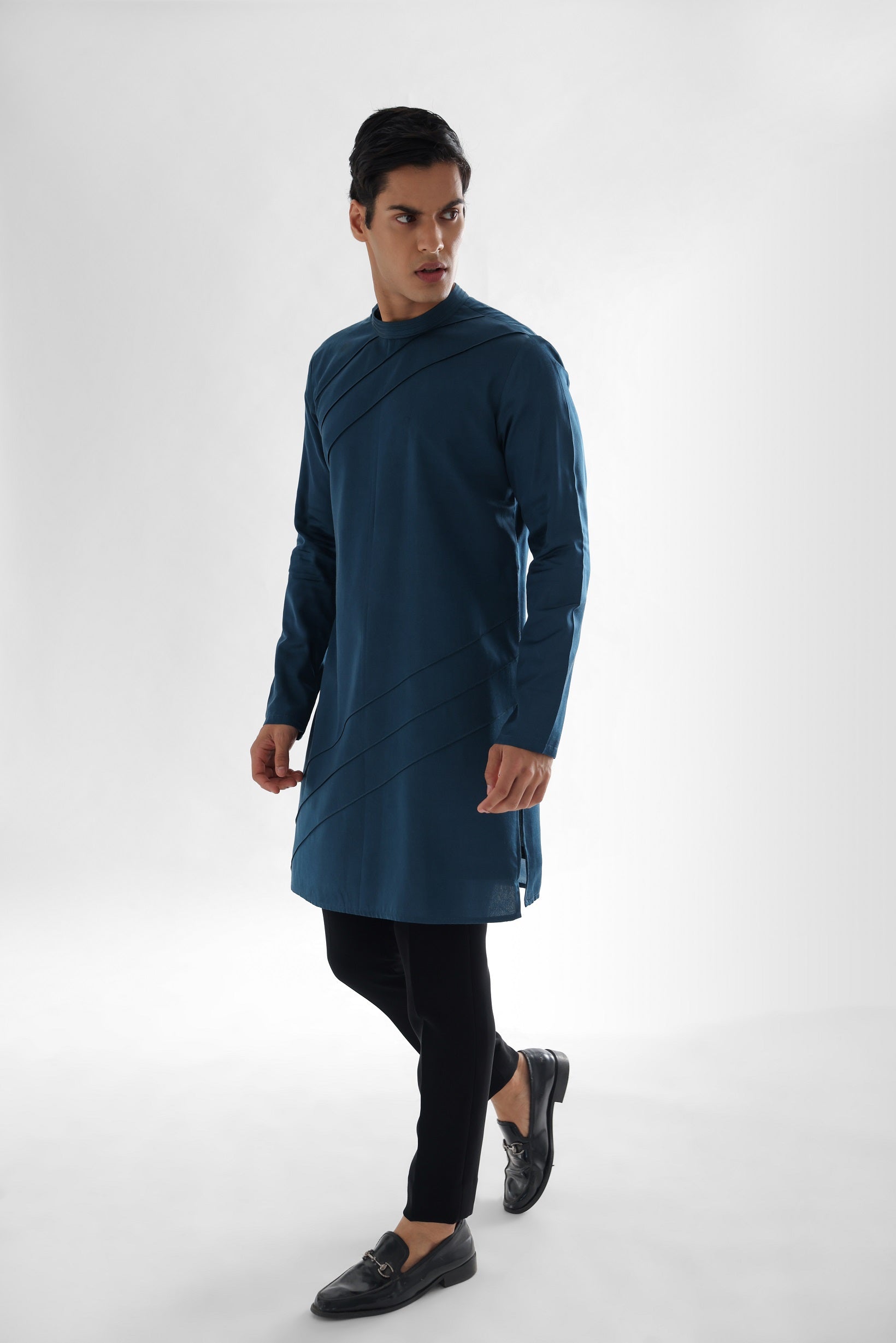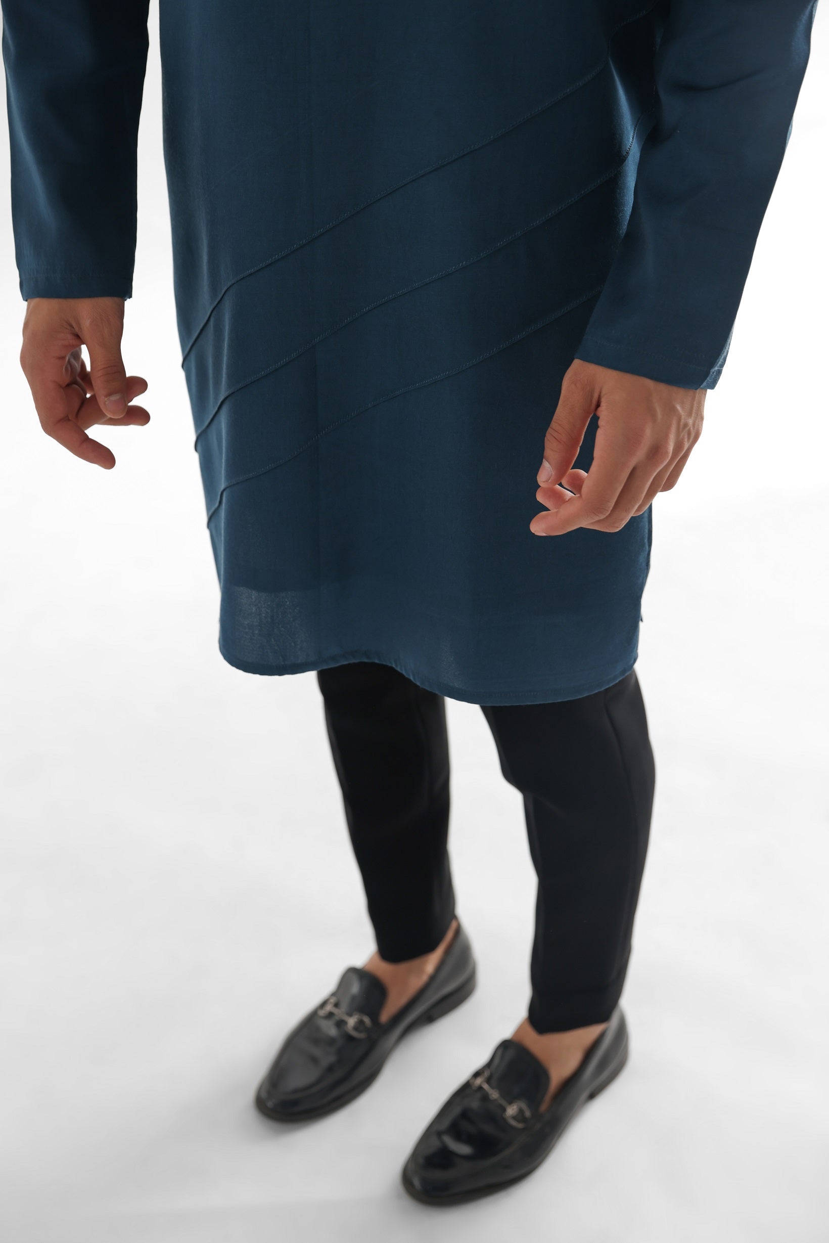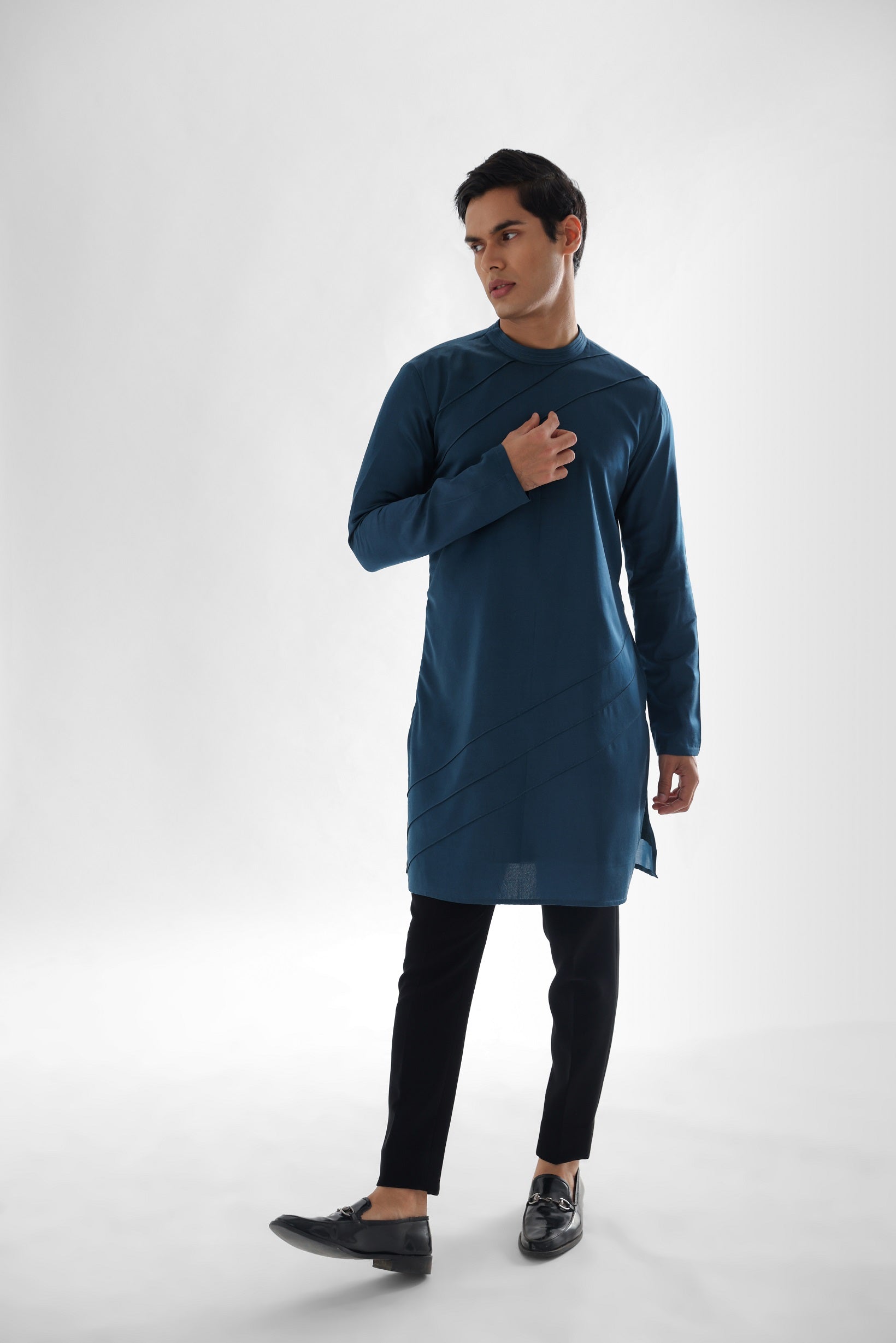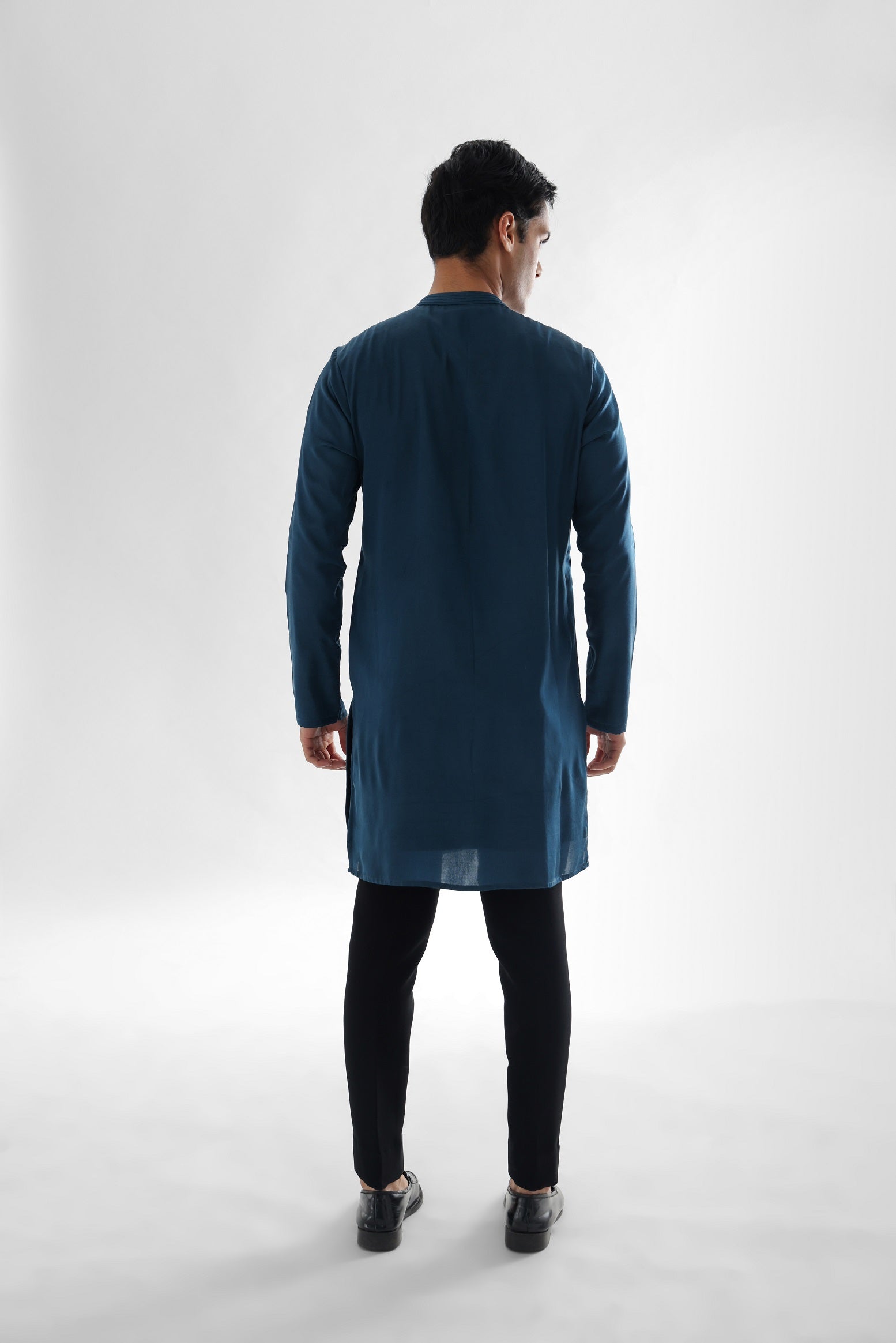 | TEAL BLUE SHORT KURTA IN SATIN WITH BLACK PANT PAJAMA |