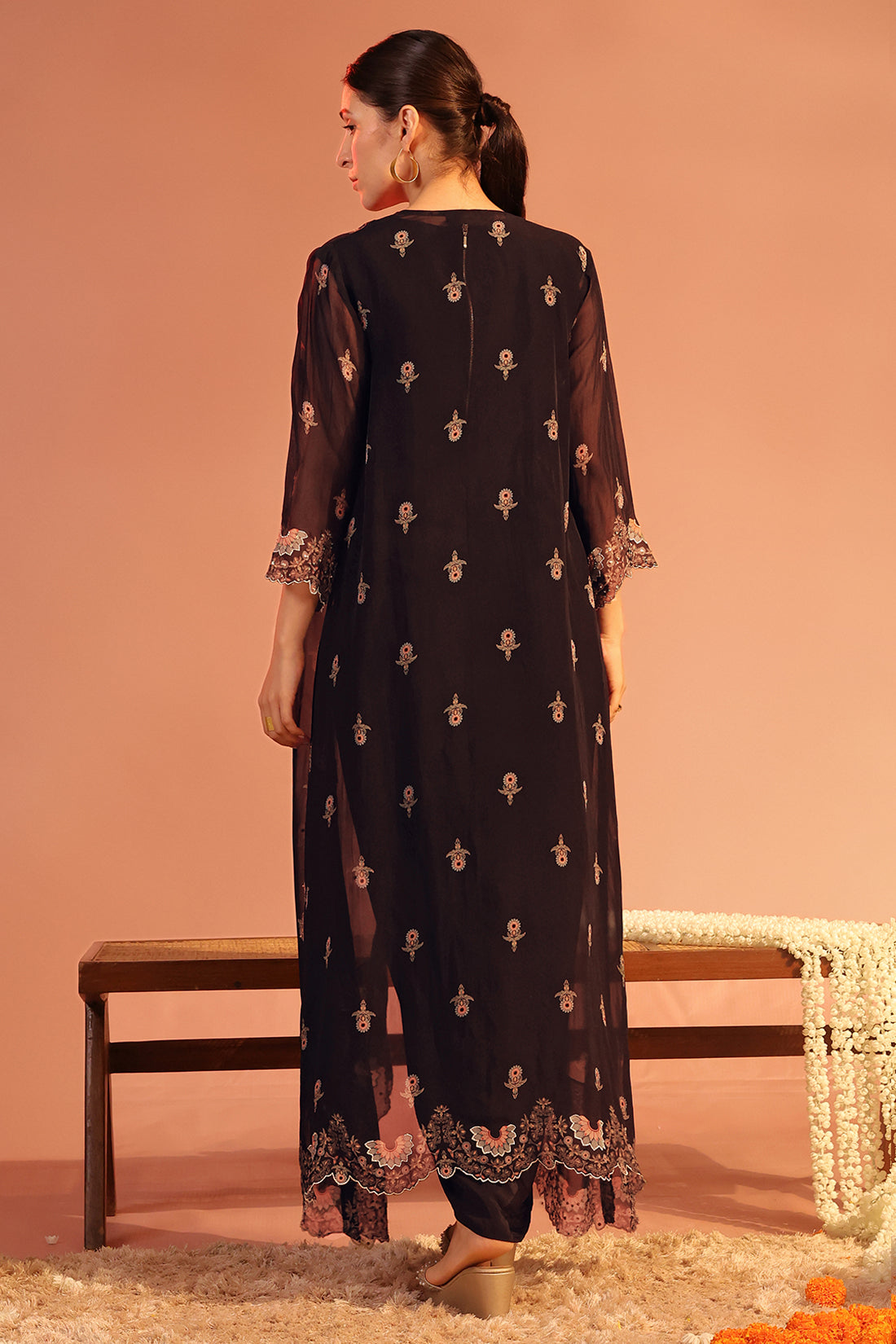 Black Eraya Embellished Drape Dress with a Metal Belt, Paired with an Organza Jacket Featuring a Cutwork Hem.