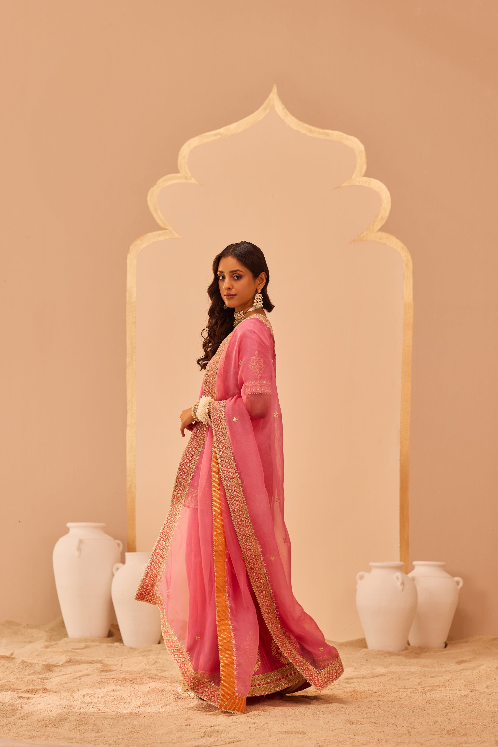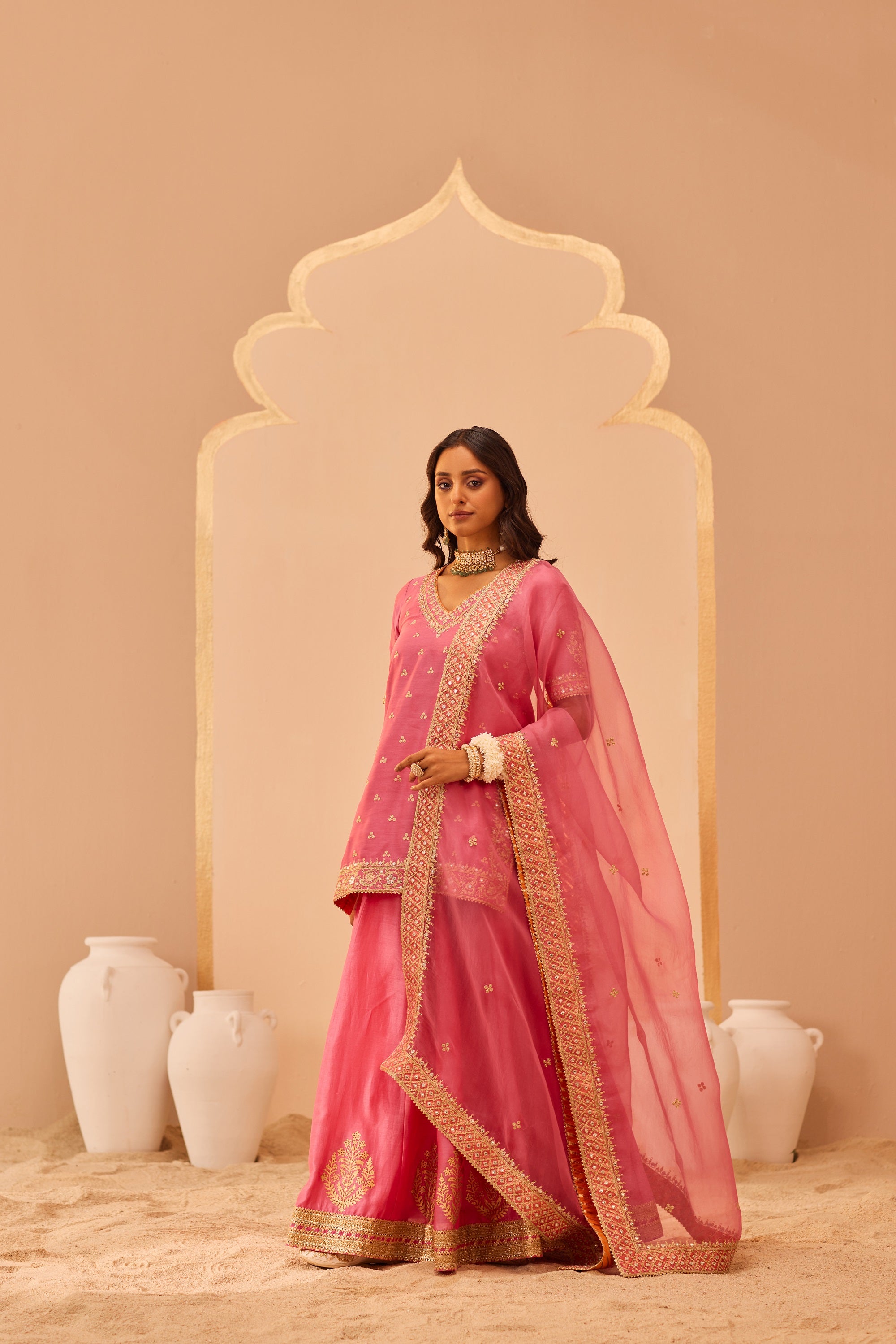 | This ensemble is made in pure silk chanderi and is teamed up with a silk organza dupatta. The short kurta has a broad and deep v neck at the front, a zero back and elbow length sleeves. The outfit is adorned with a signature block print which is highlighted with tilla and patra embroidery. It is finished with a pure benarsi fabric and gota detailing. |