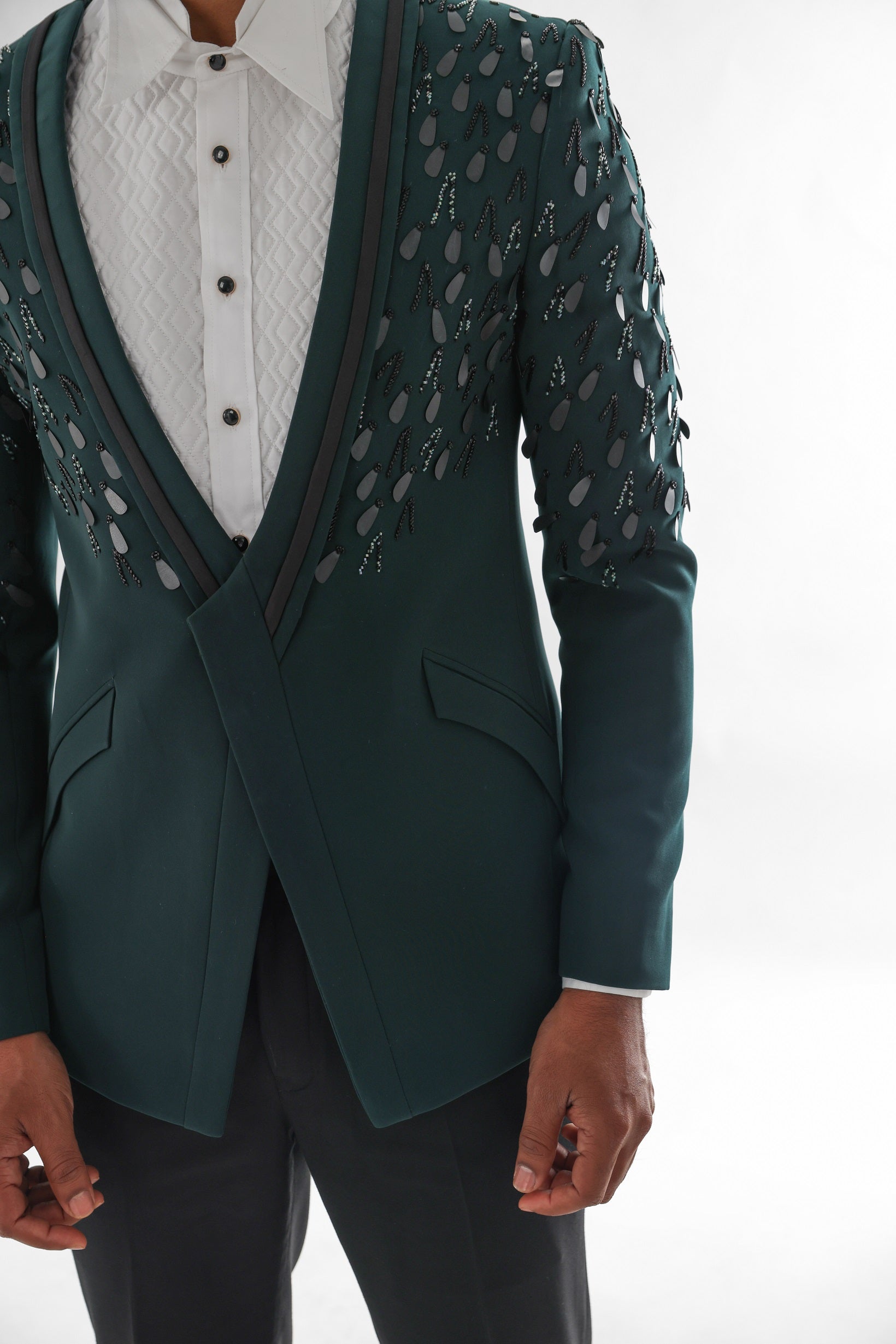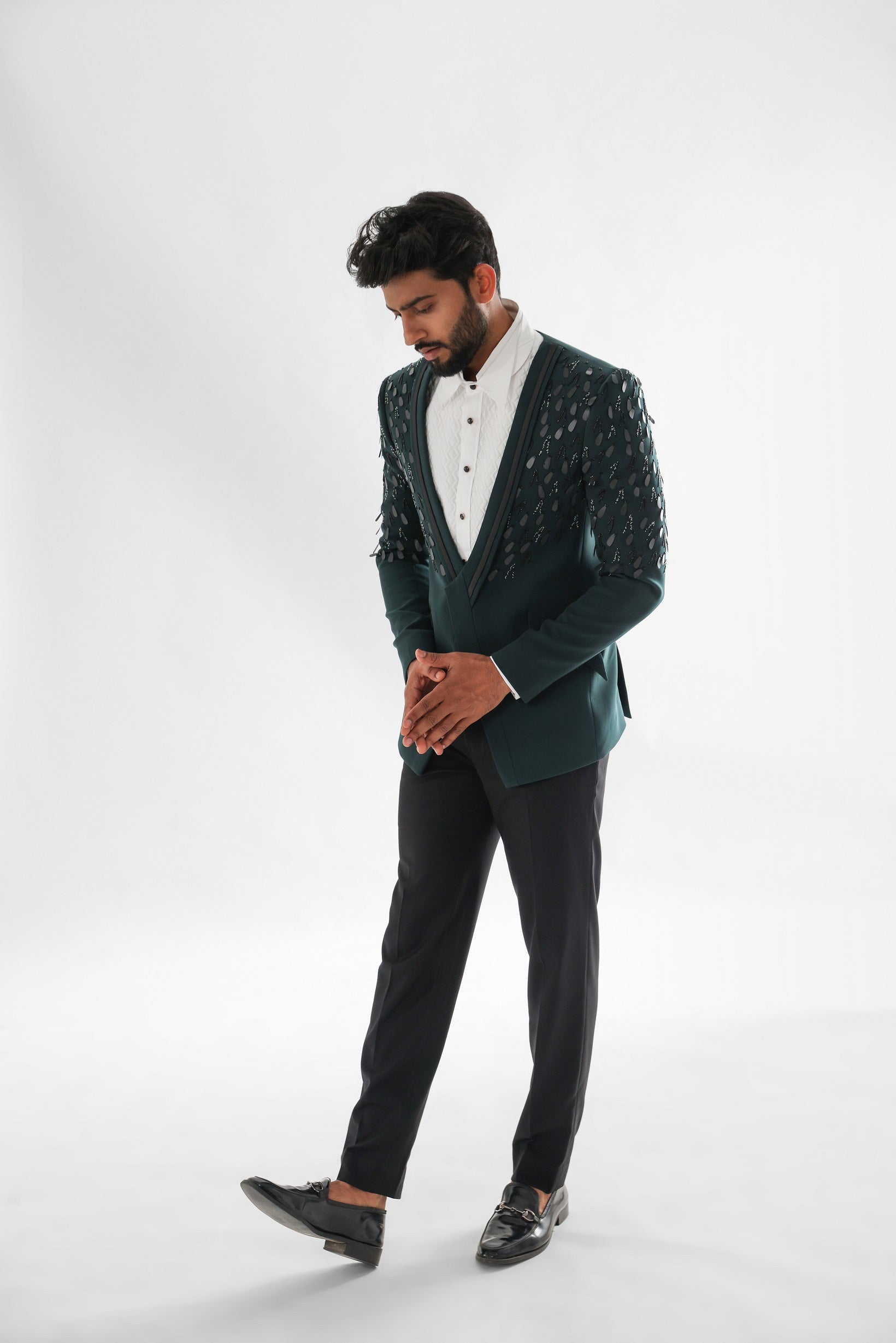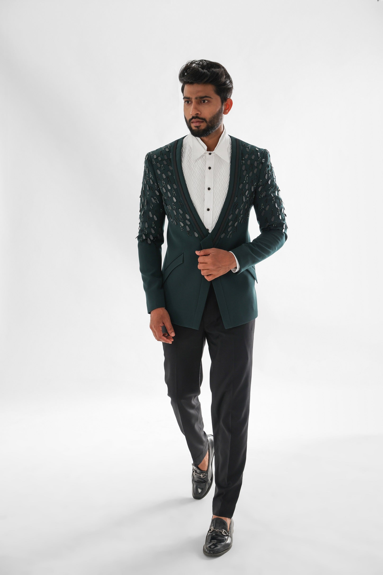 | Forest Green Tuxedo set with embroidery using dew drop shaped matte sequins. Paired with Black Trousers. THIS SET INCLUDES TUXEDO AND TROUSER. PLEASE NOTE: SHIRTS ARE NOT INCLUDED IN THE SET. |