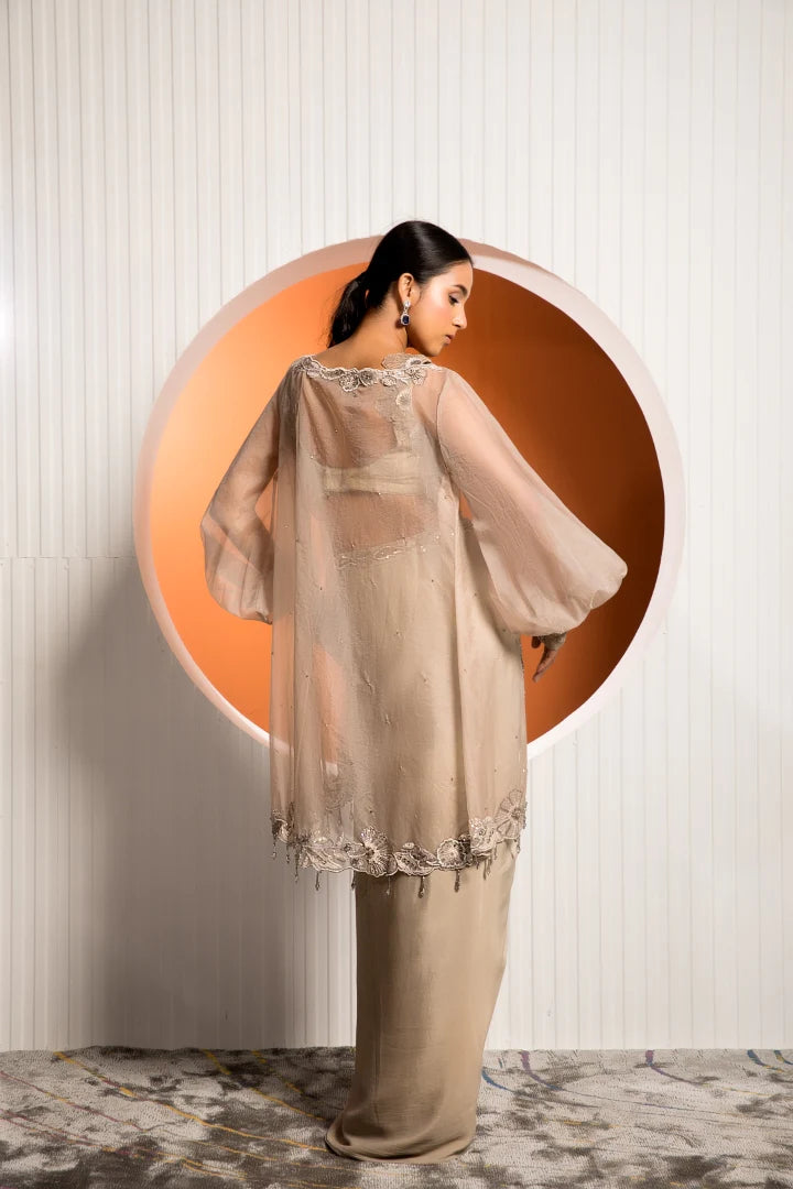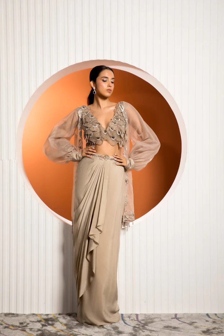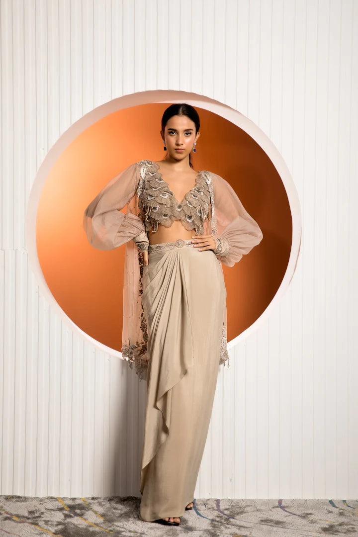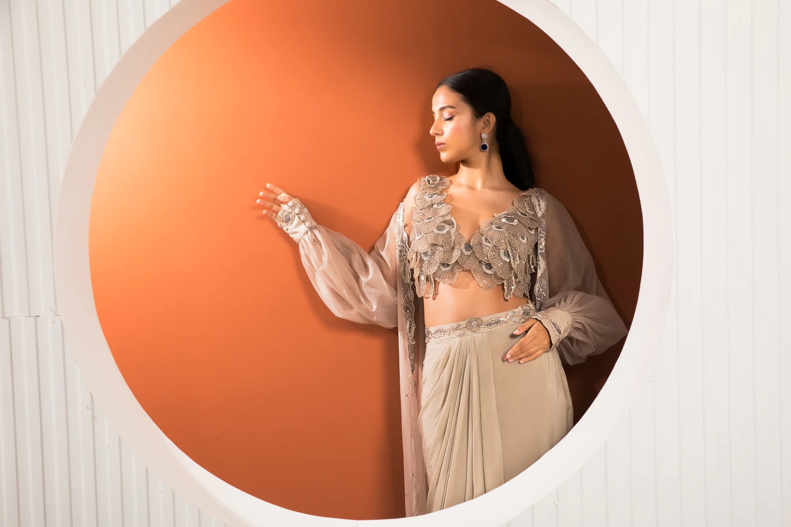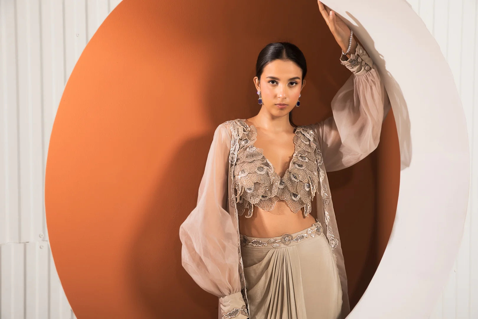 | Getting ready for a special occasion needs all the sartorial elements in place and this set featuring floral appliqué blouse, draped skirt and exquisitely designed bishop sleeve shrug in warm tan color is just what you need to stand out in the crowd. |