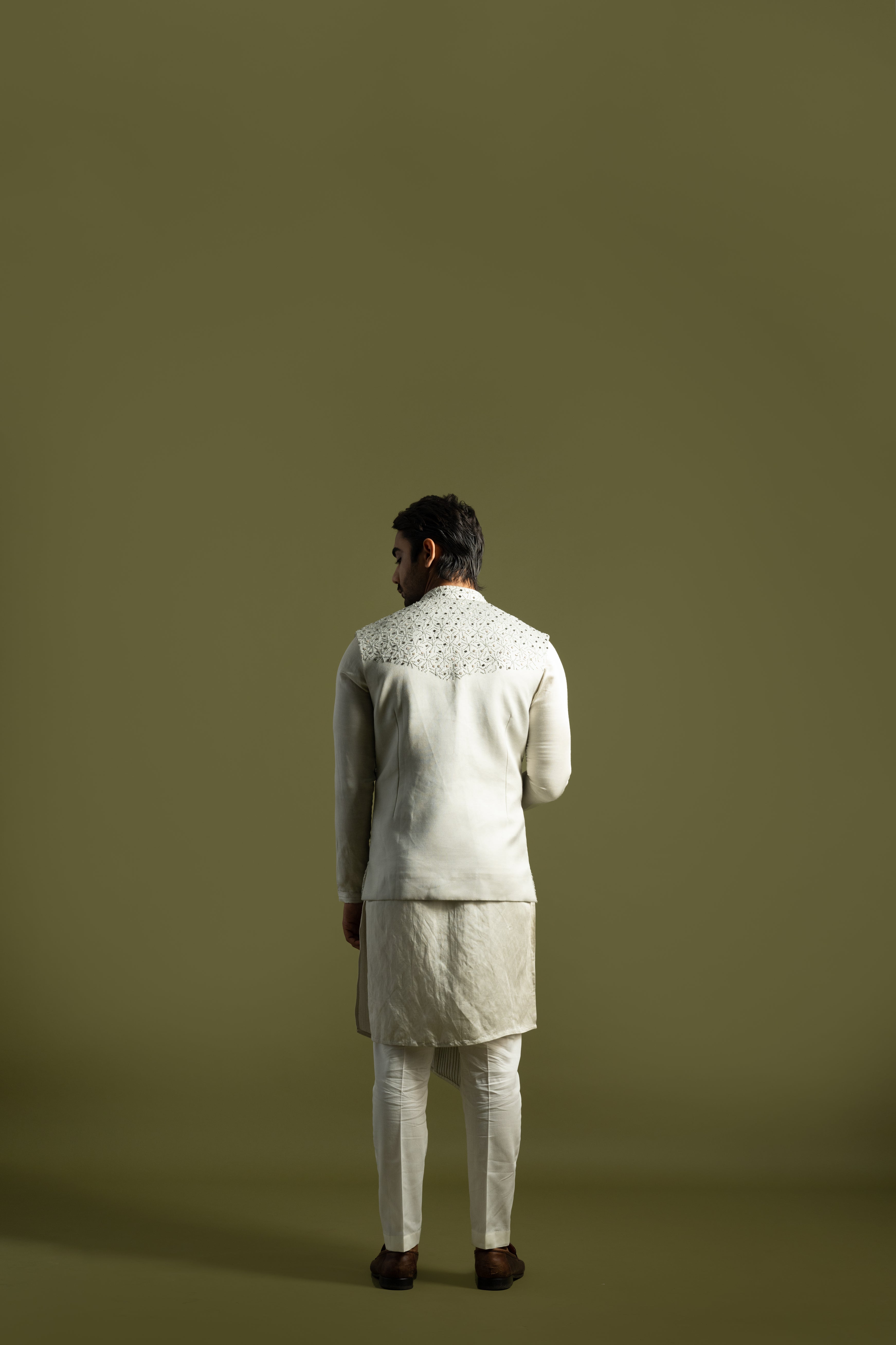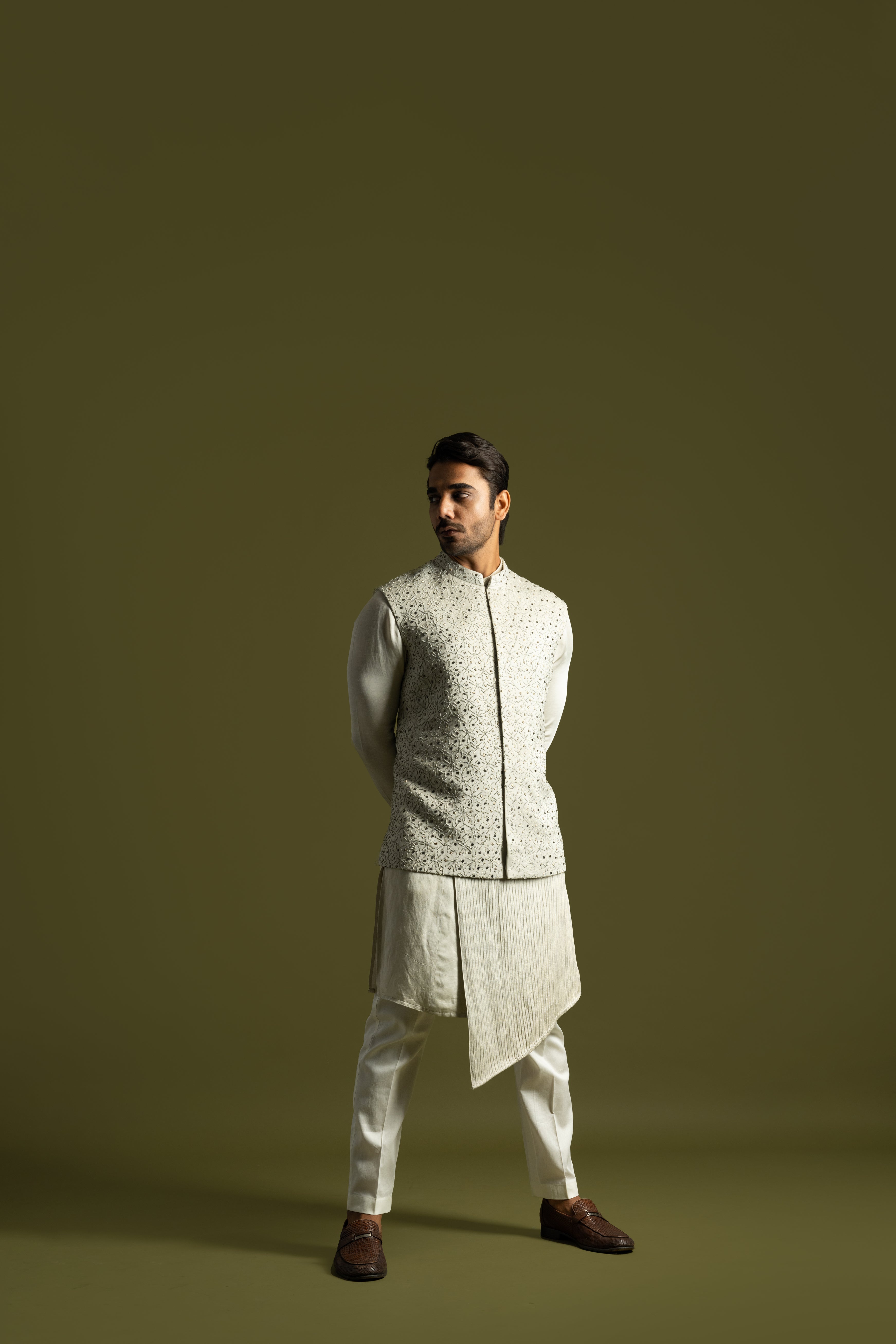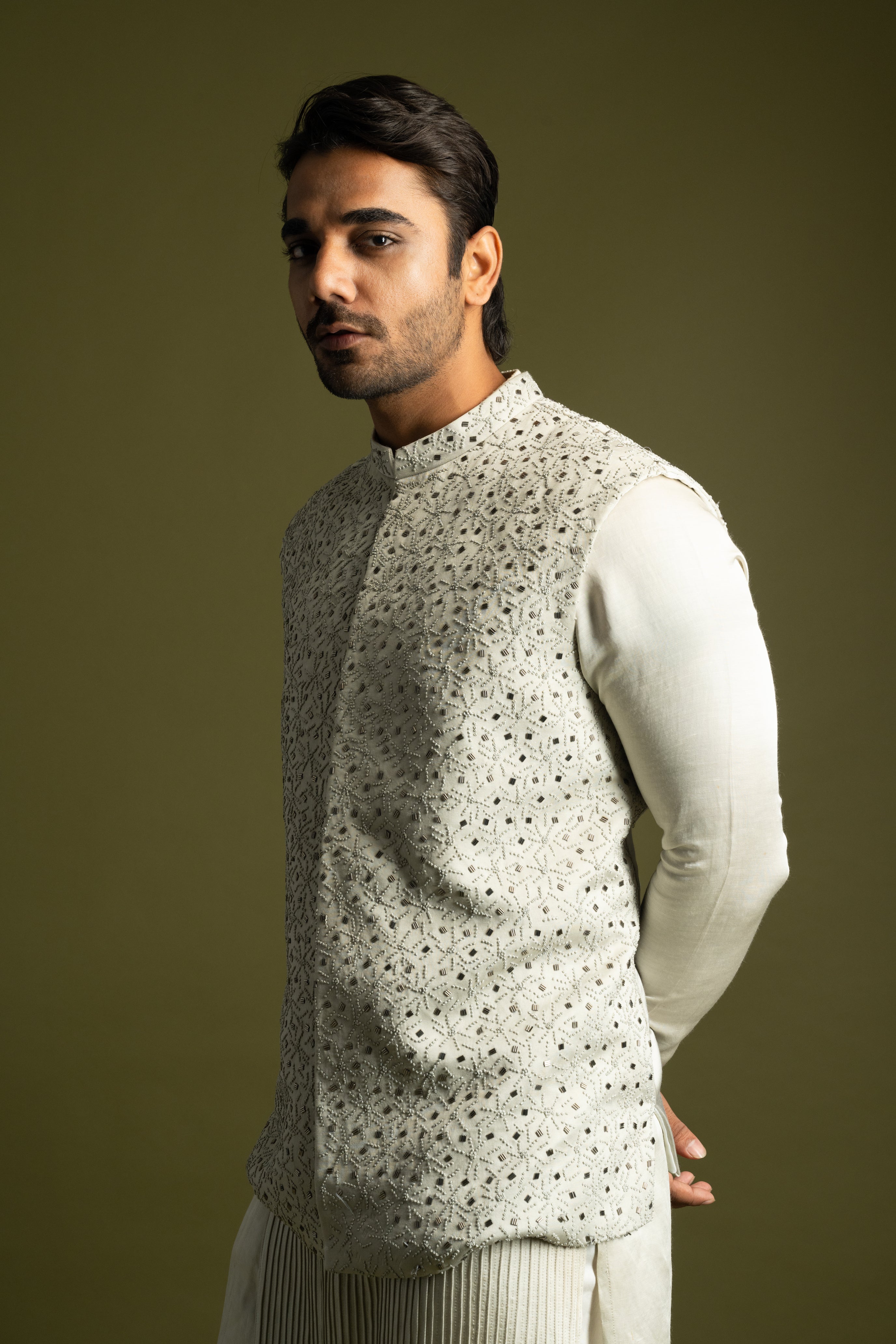 | GREY BUNDI JACKET WITH ABSTRACT FRENCHKNOT EMBROIDERY ALL OVER, HIGHLIGTED WITH KATDANA |