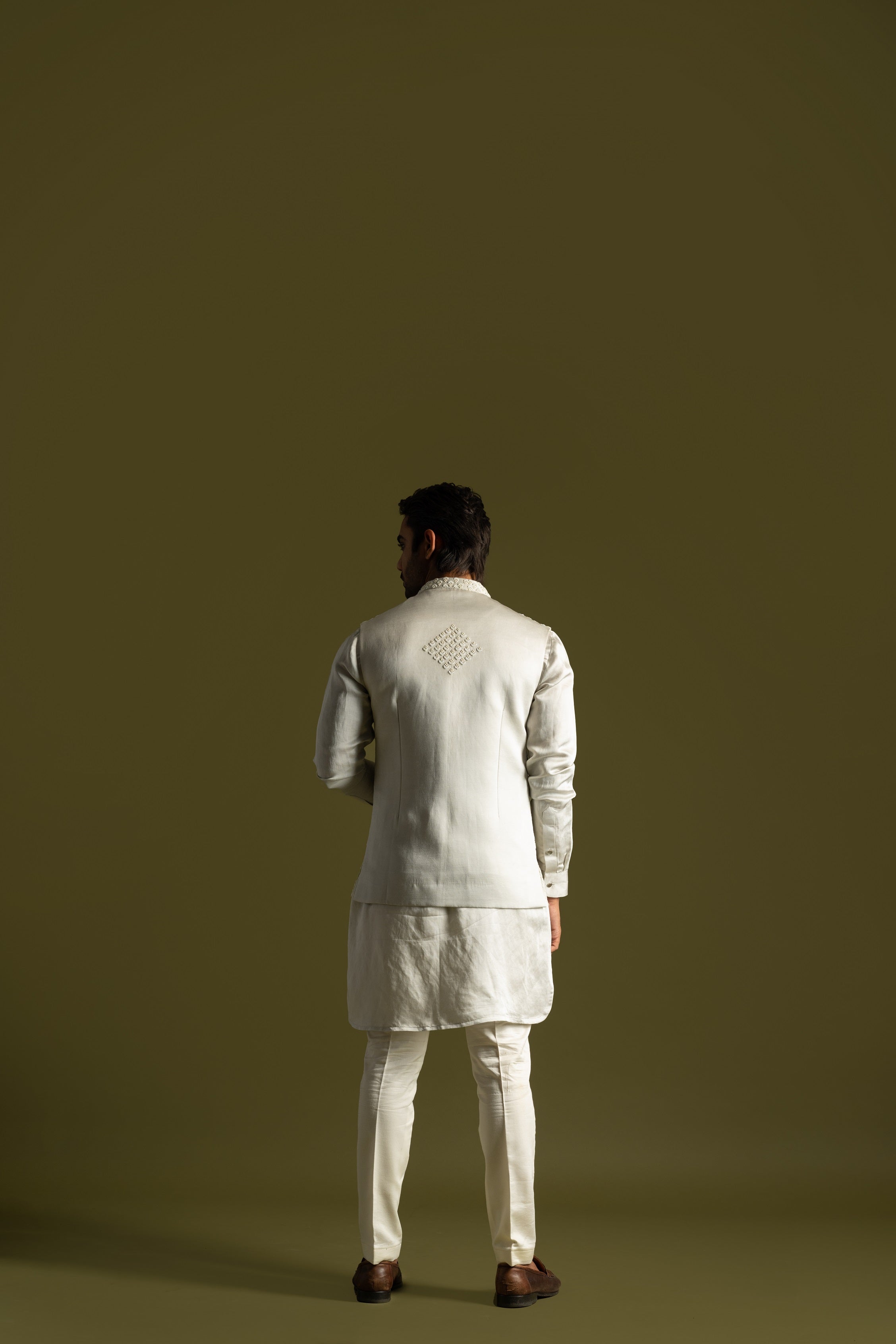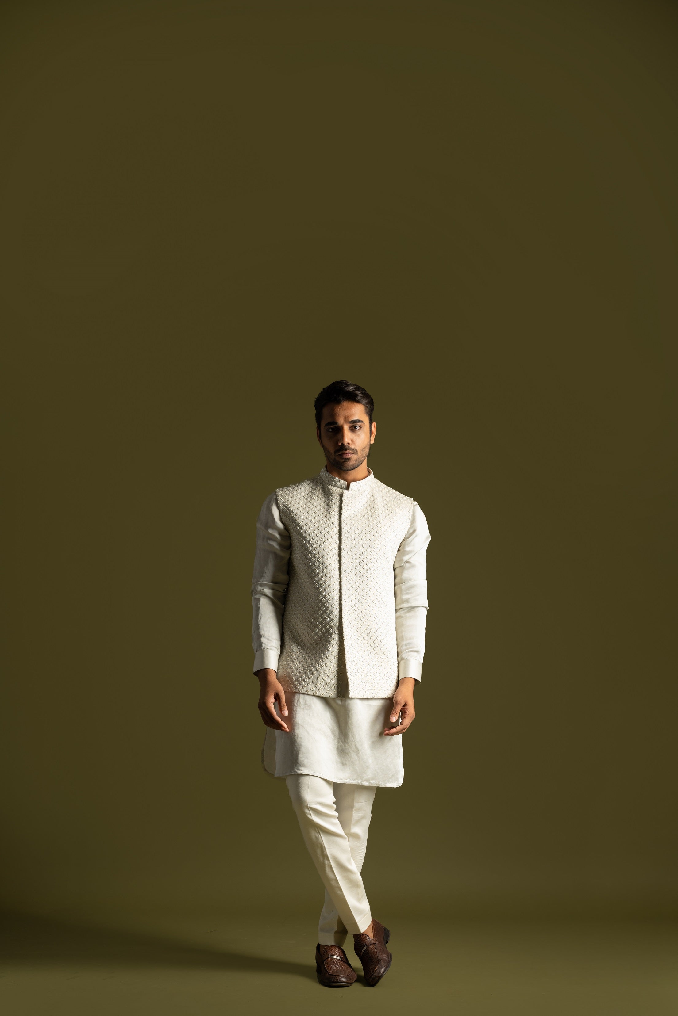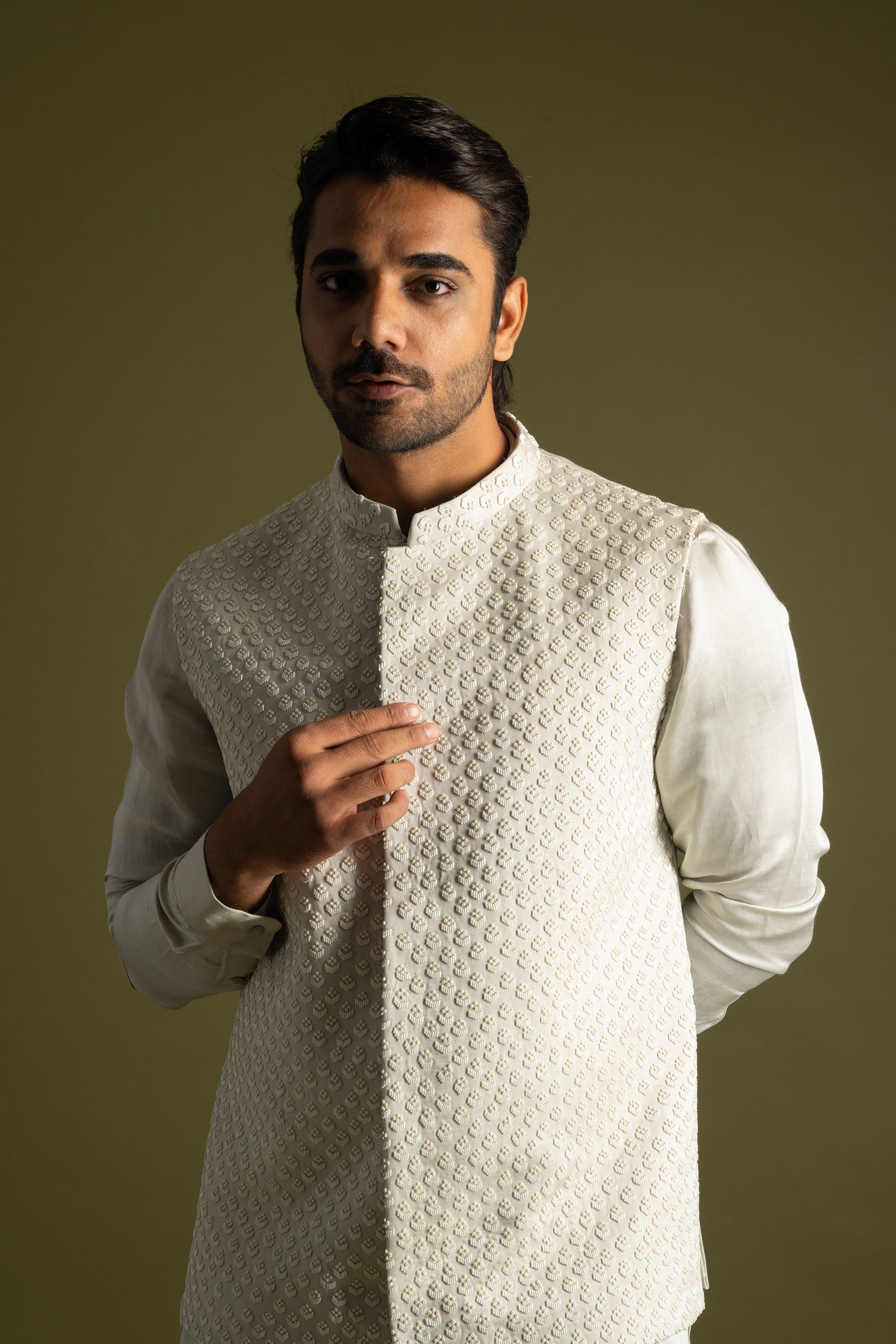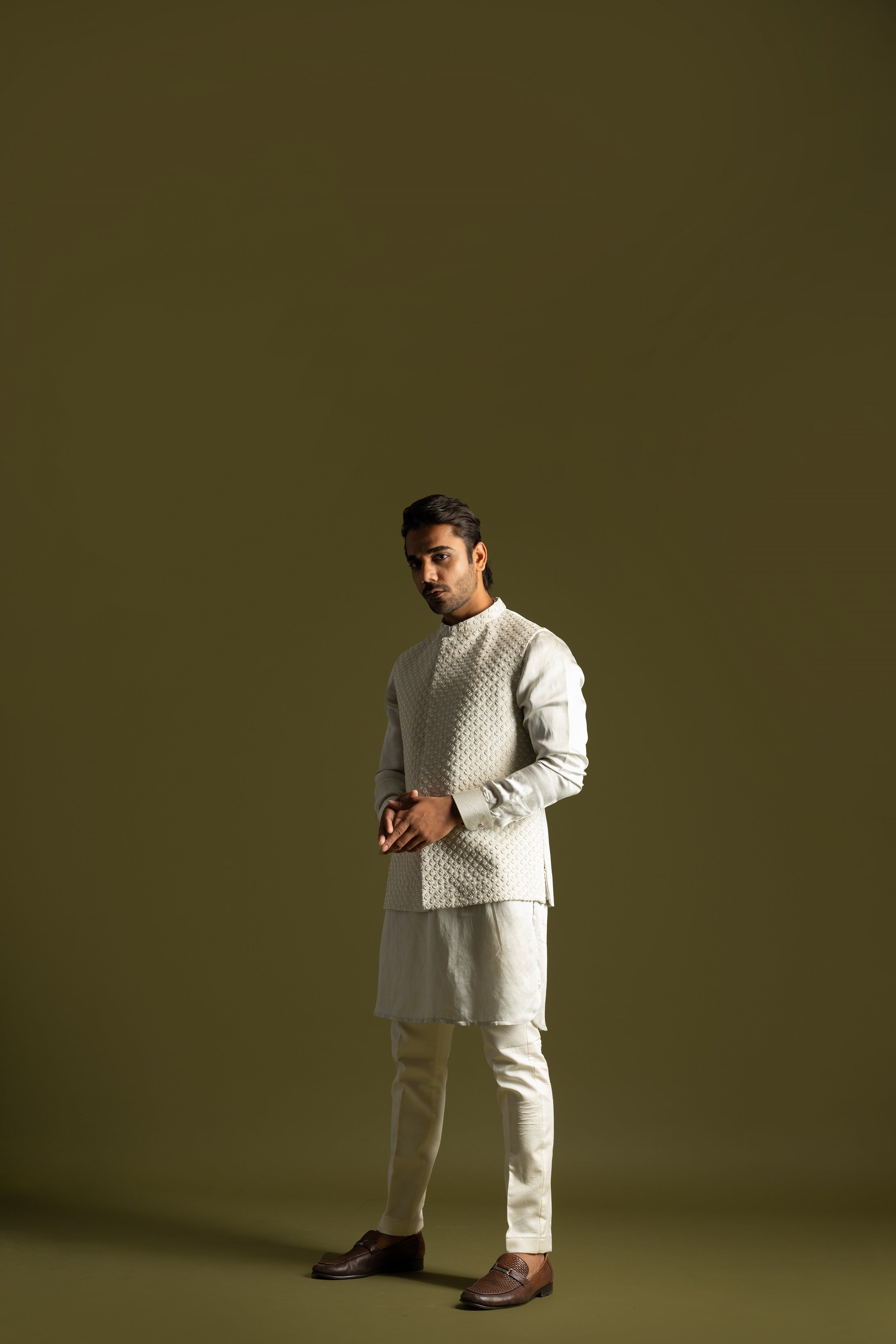 | GREY LINEN SATIN NEHRU JACKET EMBROIDERED ALL OVER USING KATDANA AND FRENCHKNOT DETAILING. COMES WITH A LIGHT GREY KURTA WITH A CURVED HEMLINE, HIGHLIGHTED WITH A MOTIF ON THE CHEST. PAIRED WITH A CREAM PANT PAJAMA |