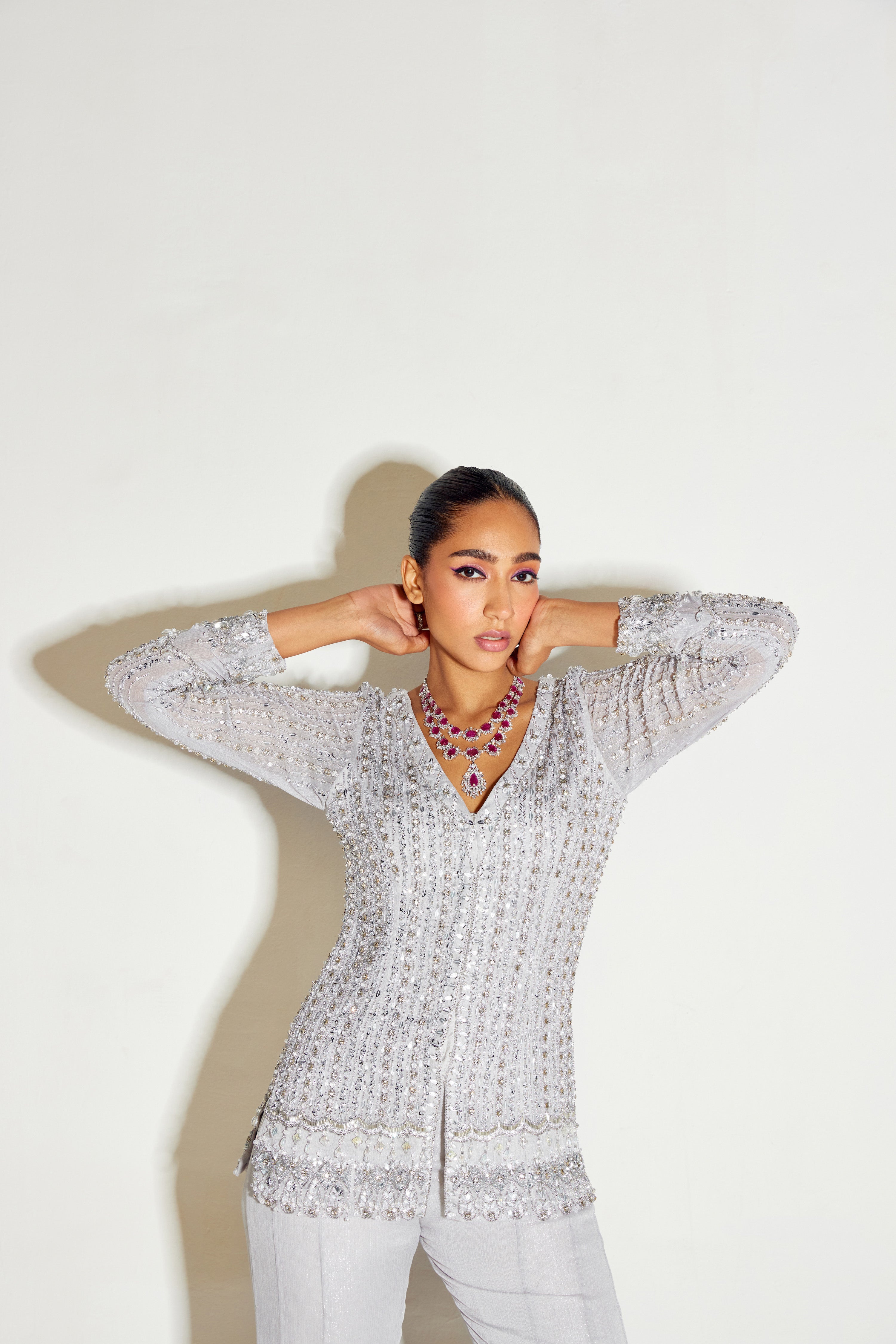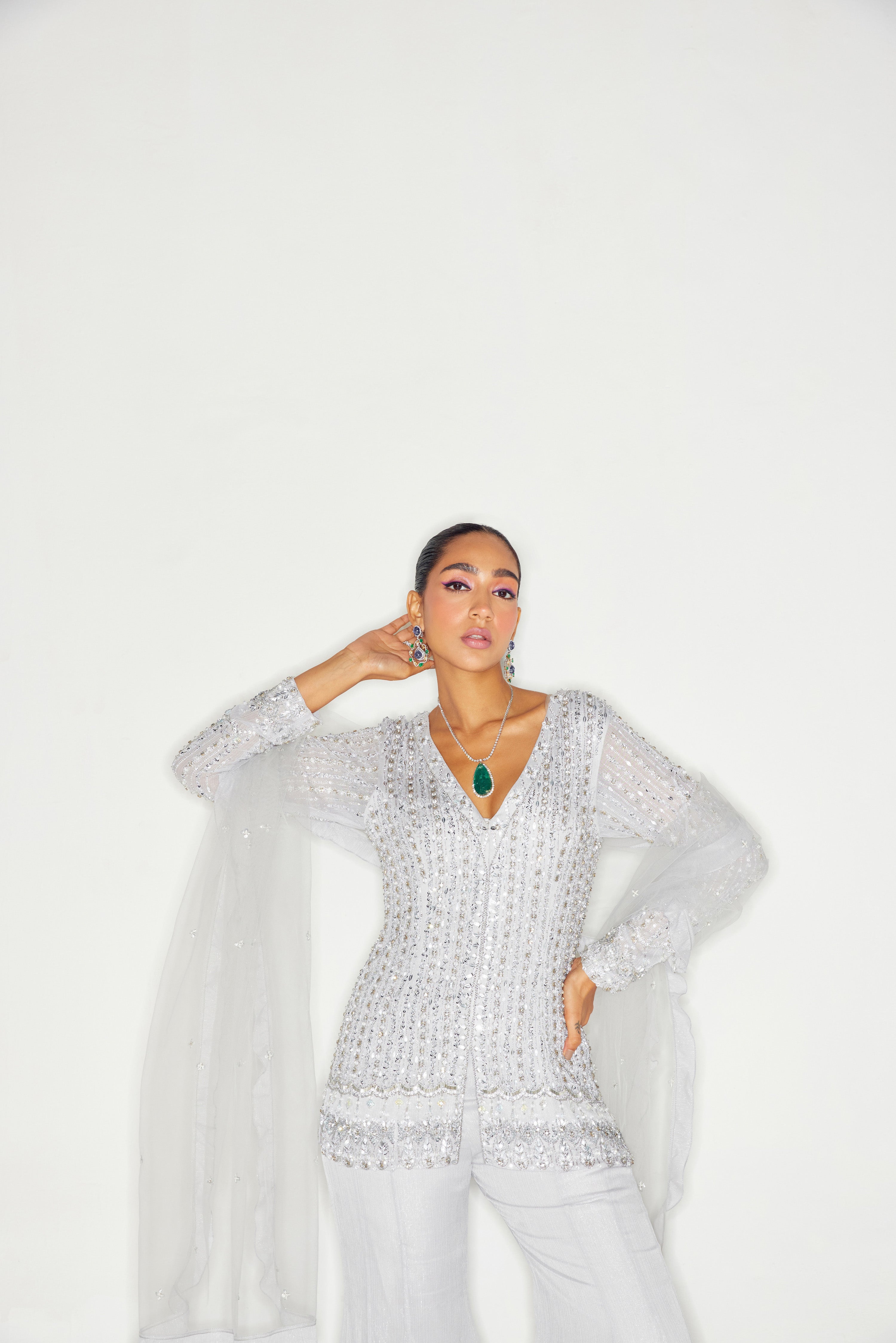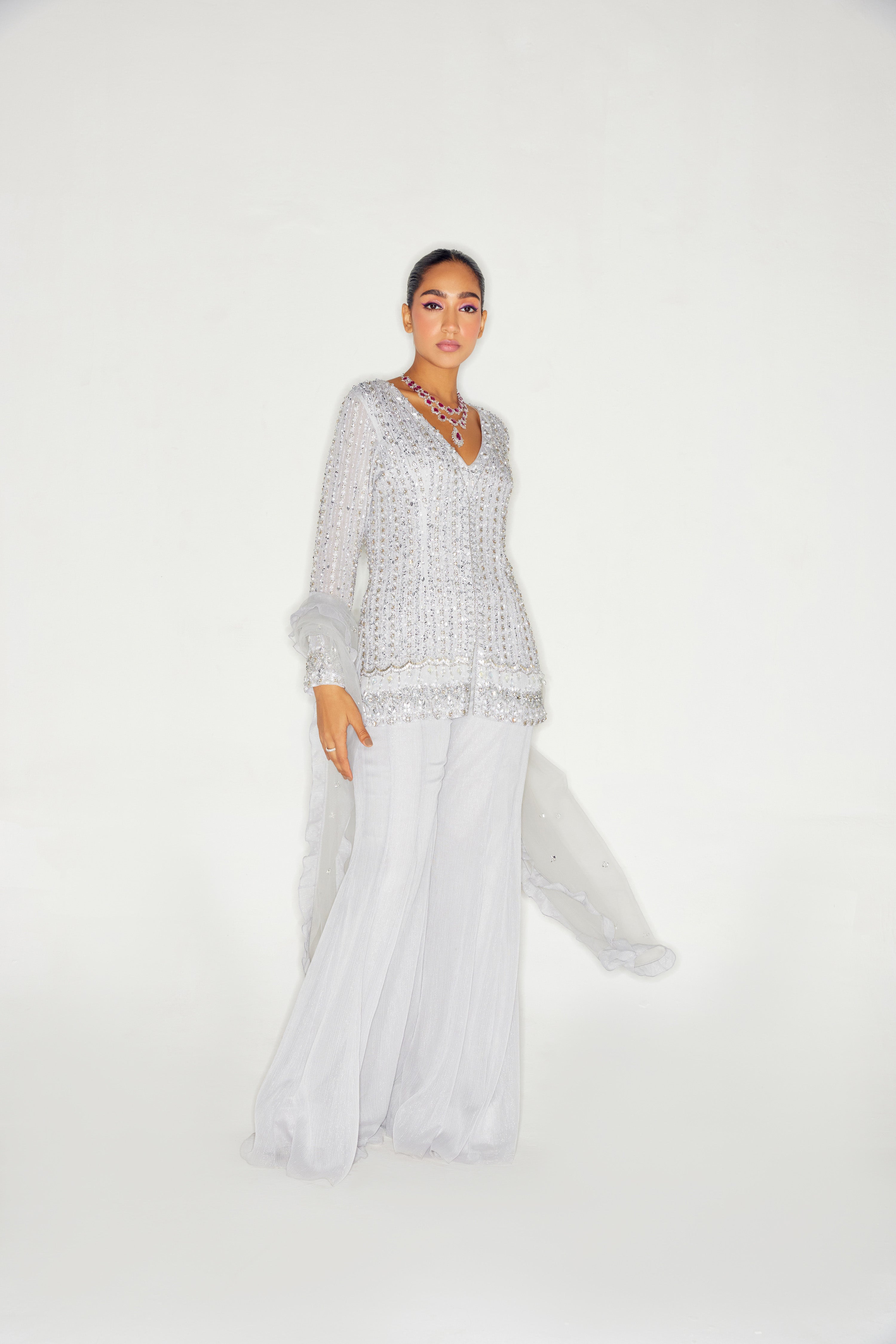 Grey Fitted tonal hand embroiderd kurta in metallic georgette fabric paired with matching flared pants and net ruffle dupatta