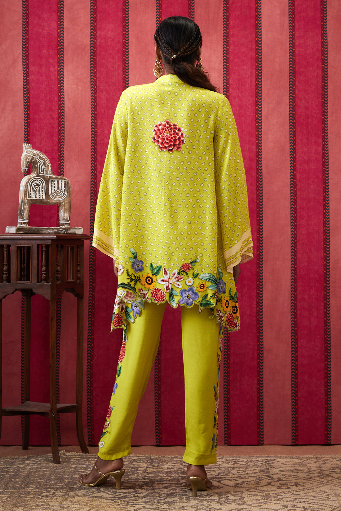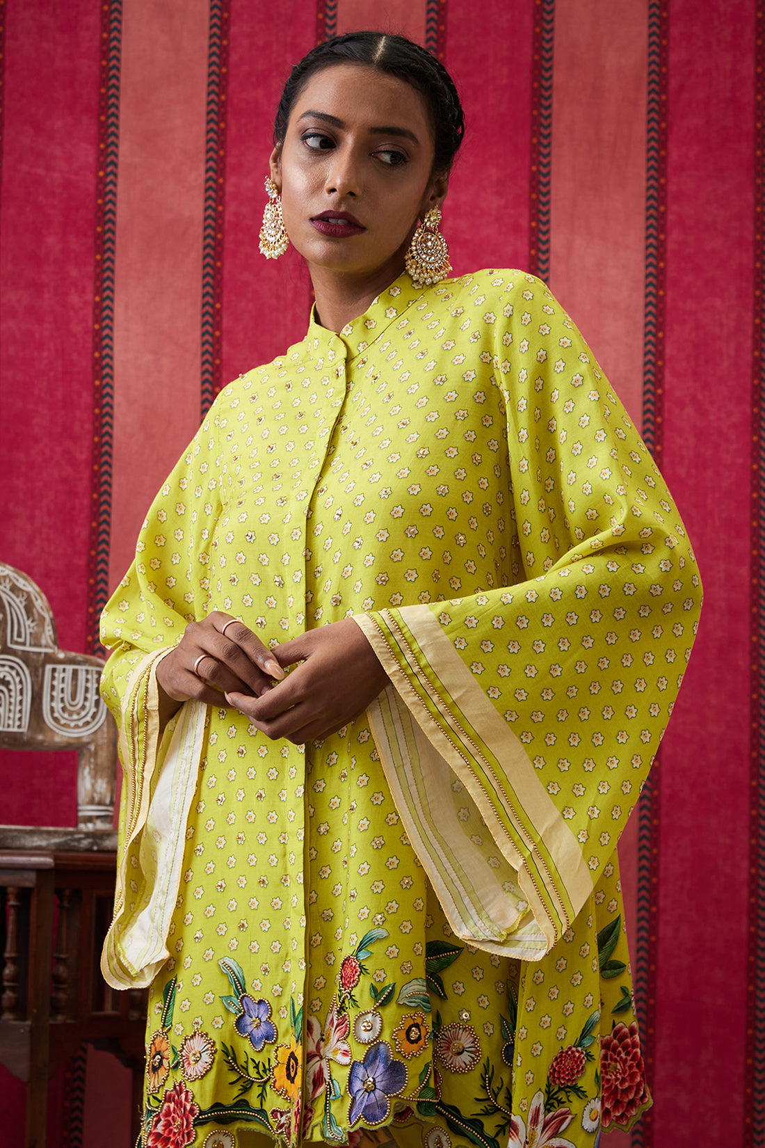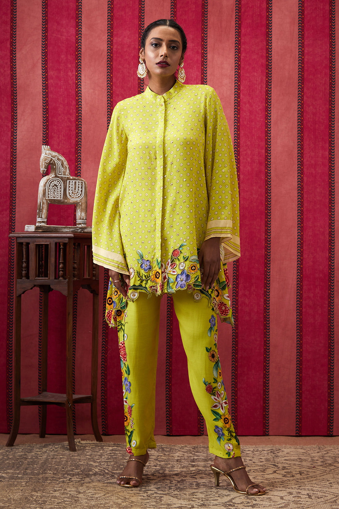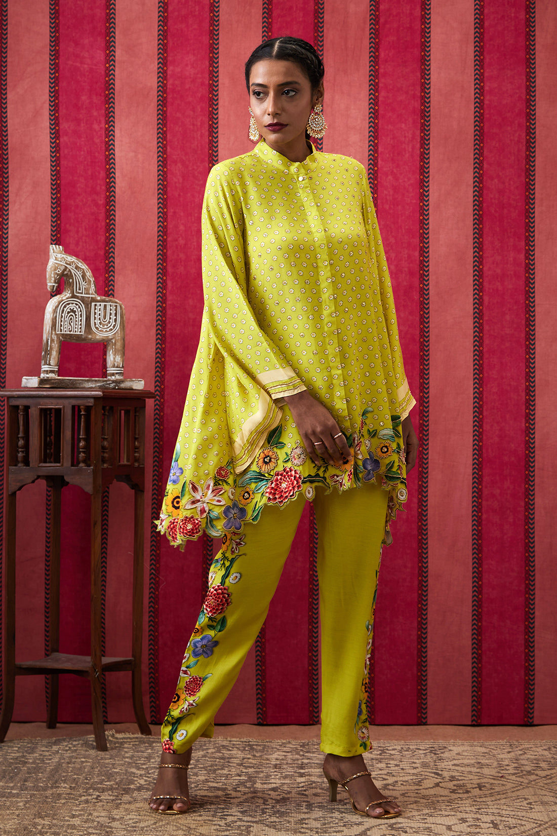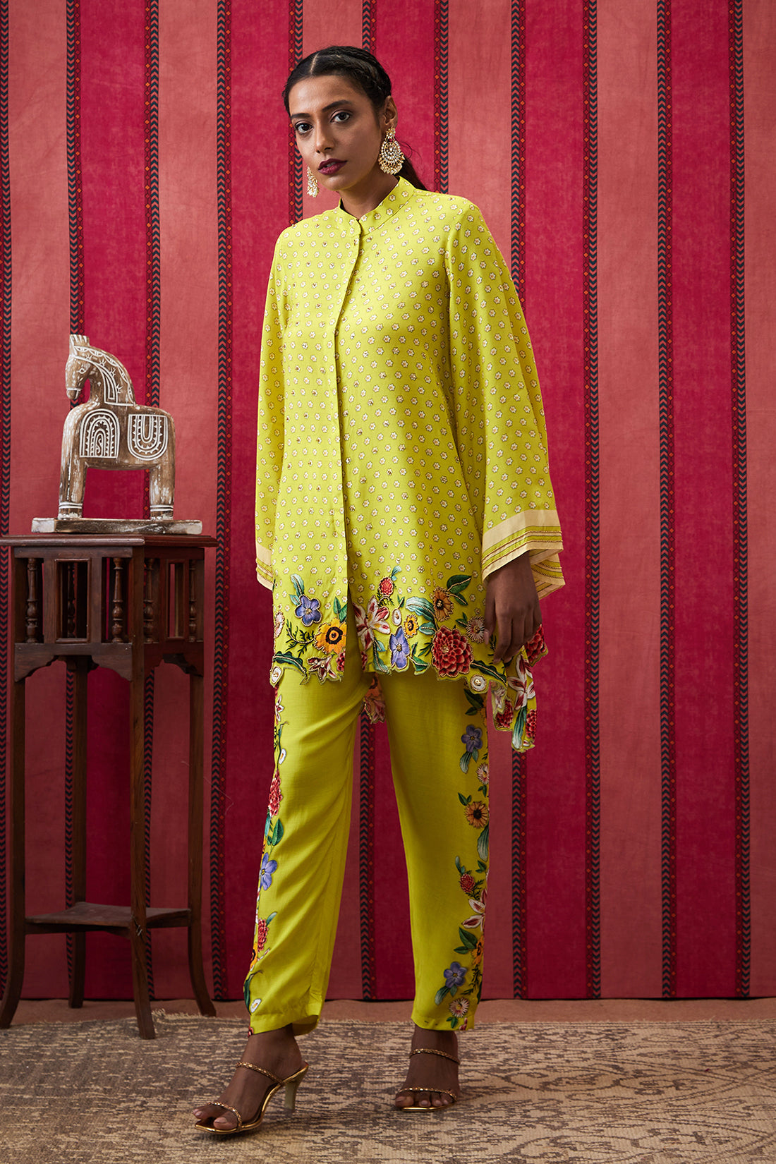 Featuring a yellow Applique High-low Shirt in Cotton silk fabric. It is paired with a straight pant.