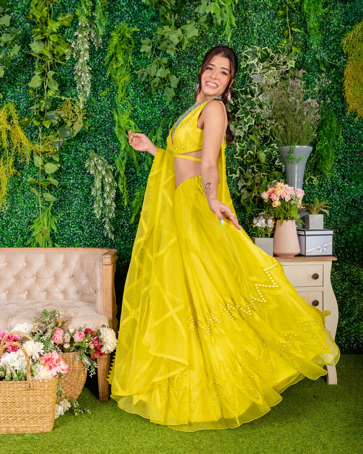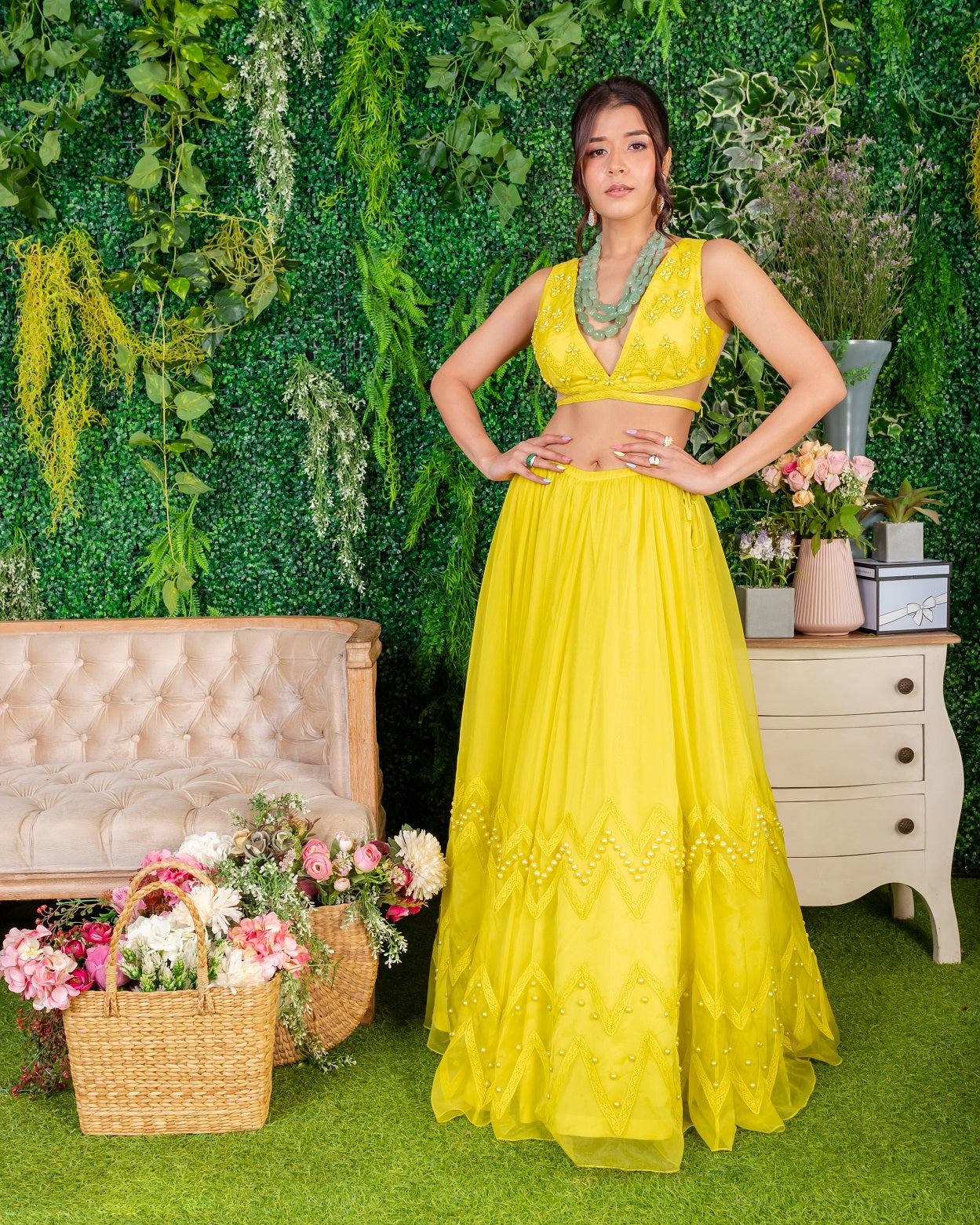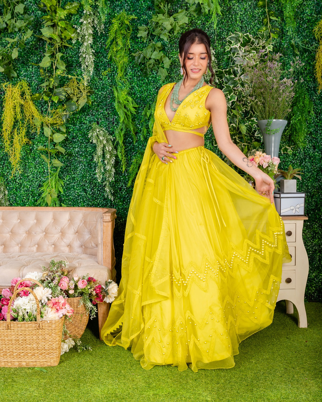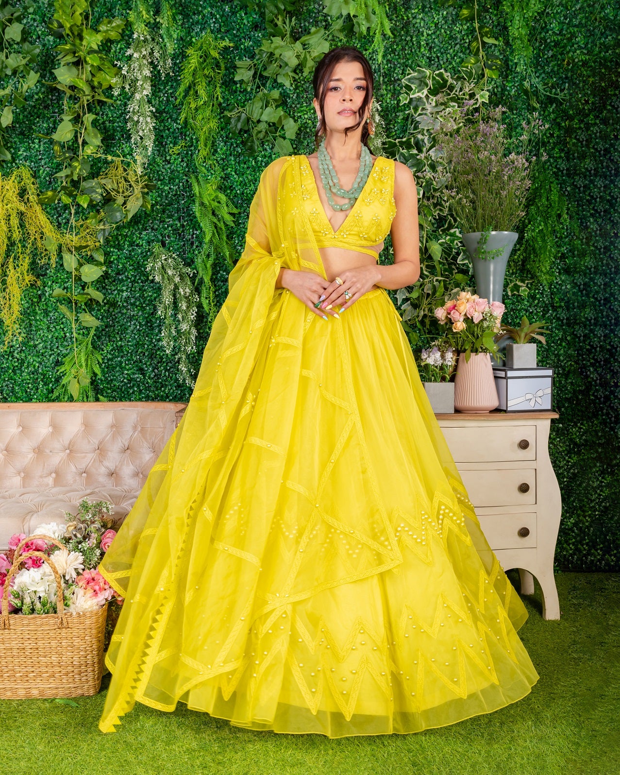 Featuring a limoncello lehenga in organza and crepe base with lace, fringe, samoosa patti and pearl hand work. It is paired with a matching blouse and a dupatta.