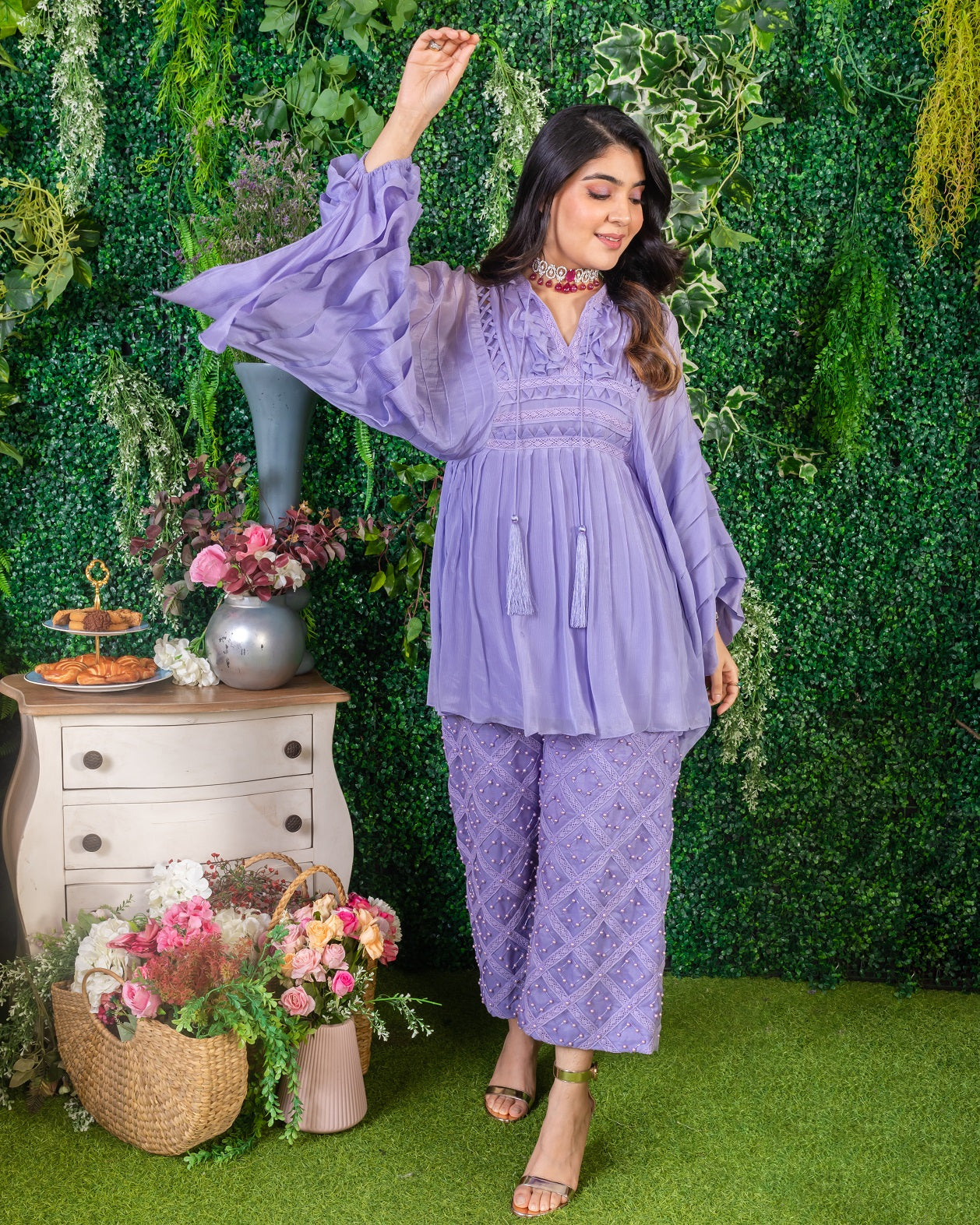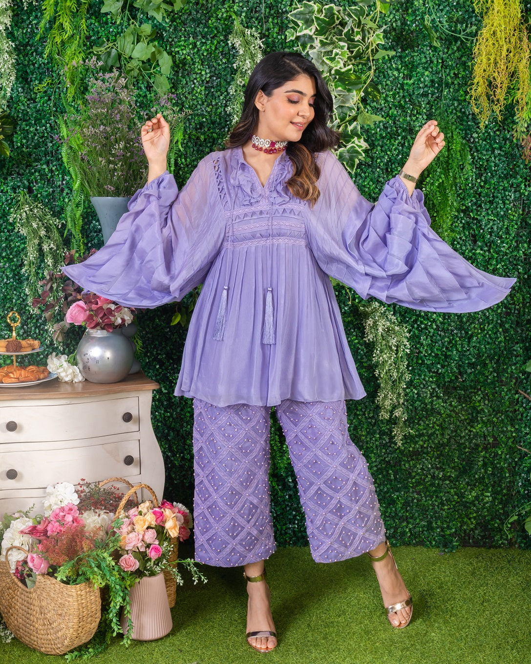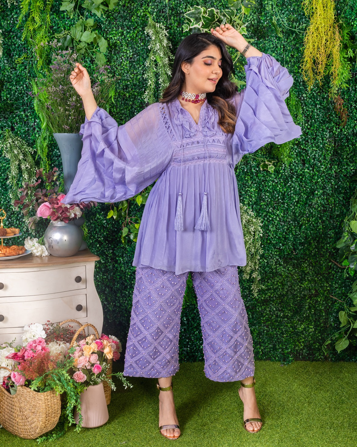 Featuring a lavender tunic in chiffon and organza base with lace, fringe, samoosa patti and pearl hand work.