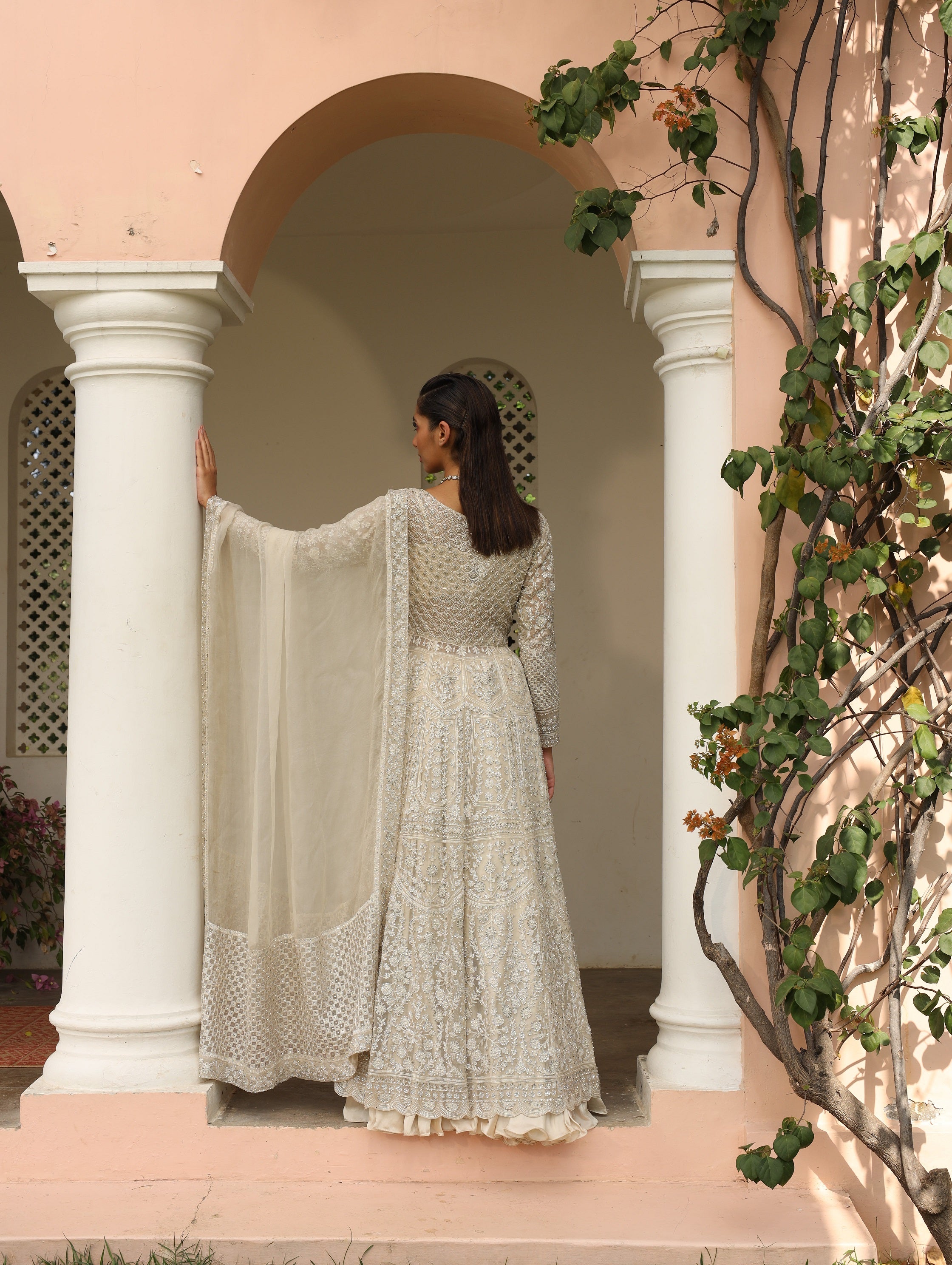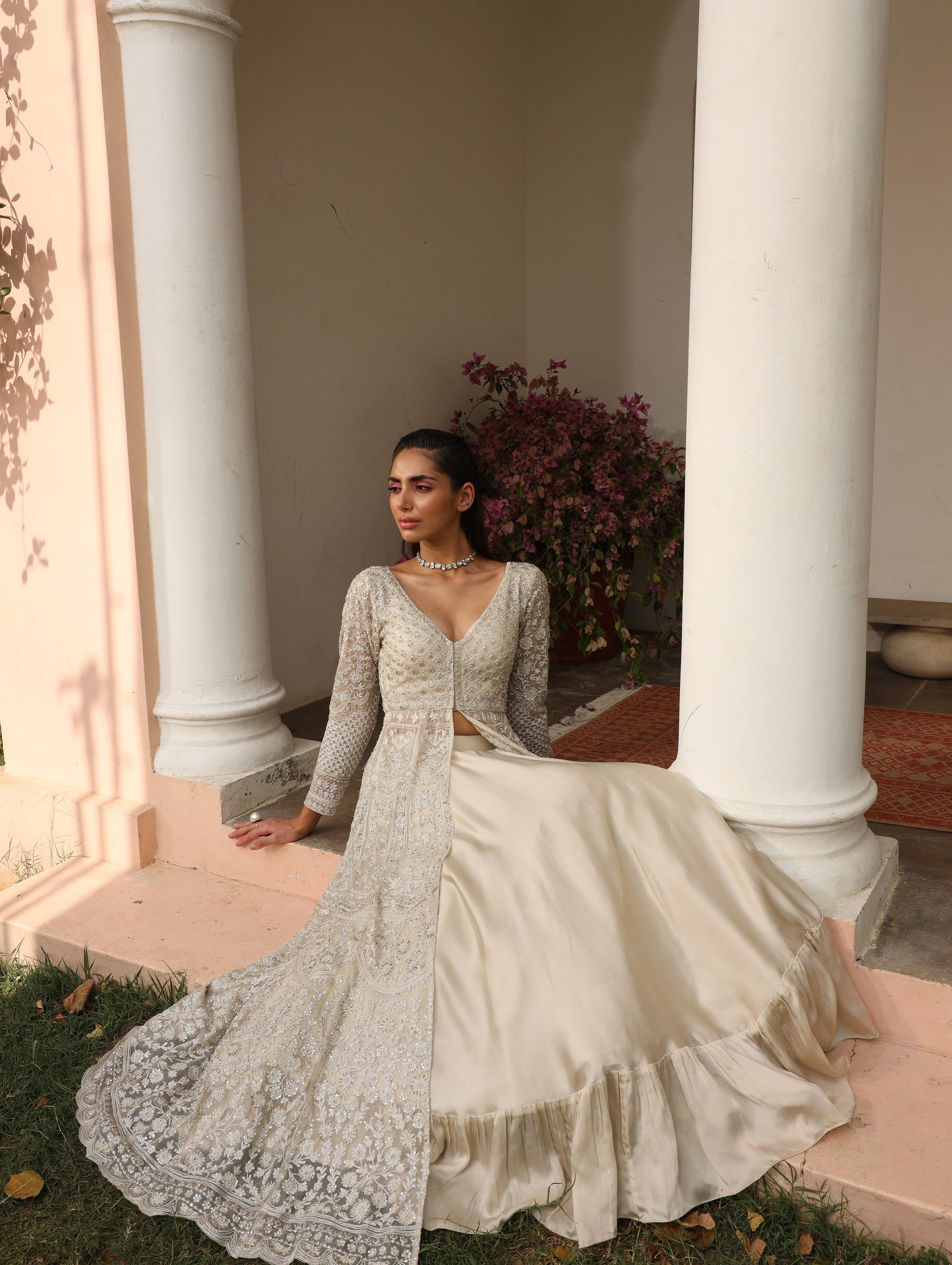 | Heavy embroidered long jacket paired with satin butier and skirt for inner layer.full jacket embroidery. |