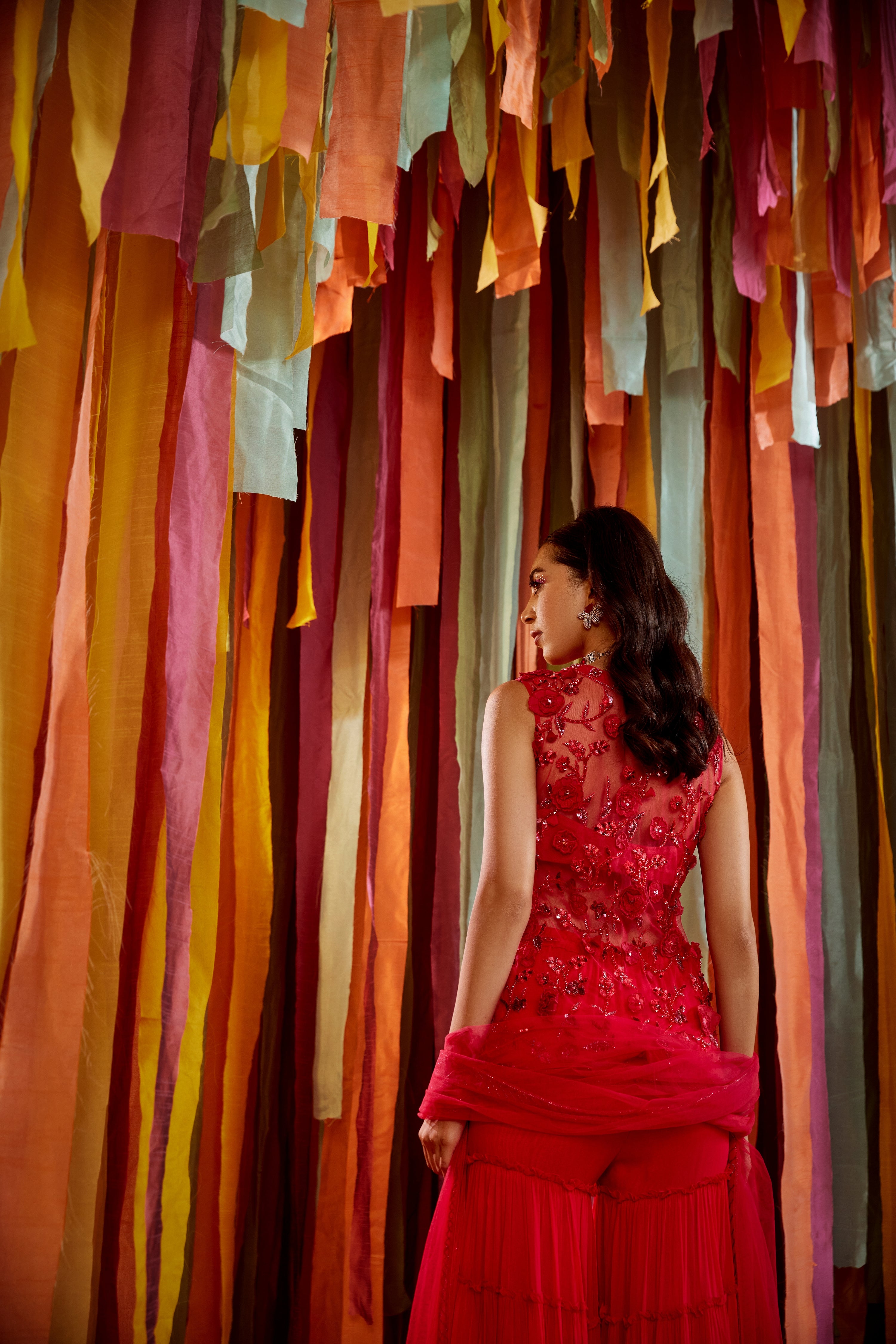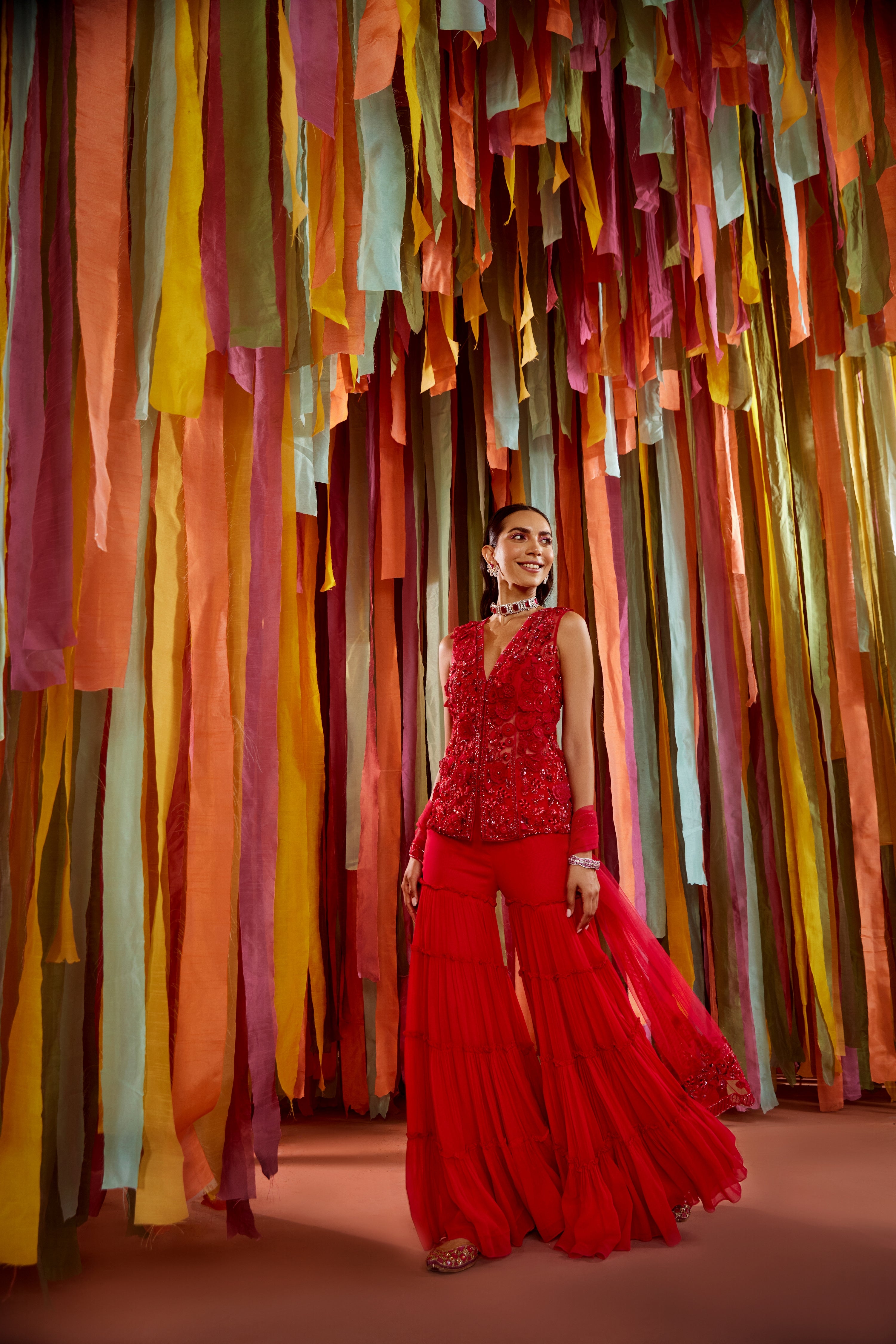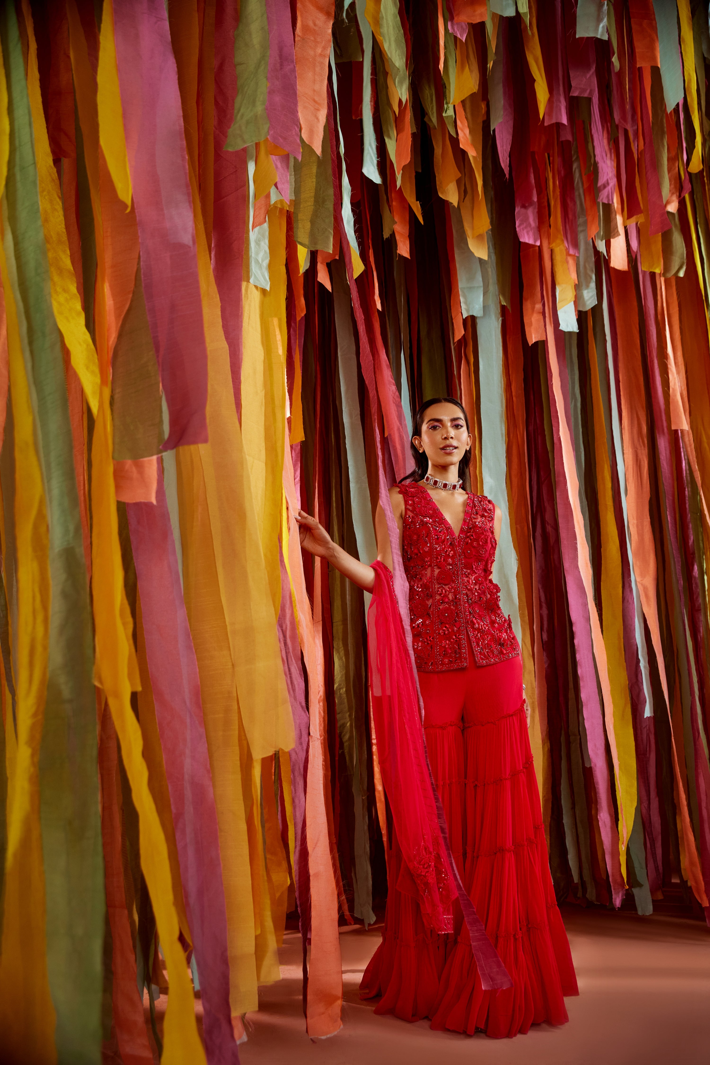 Hot pink tonal hand embroidered kurta featuring 3D organza flowers, it has a V neckline, half lining. It is paired with a tiered sharara in georgette and a net dupatta.