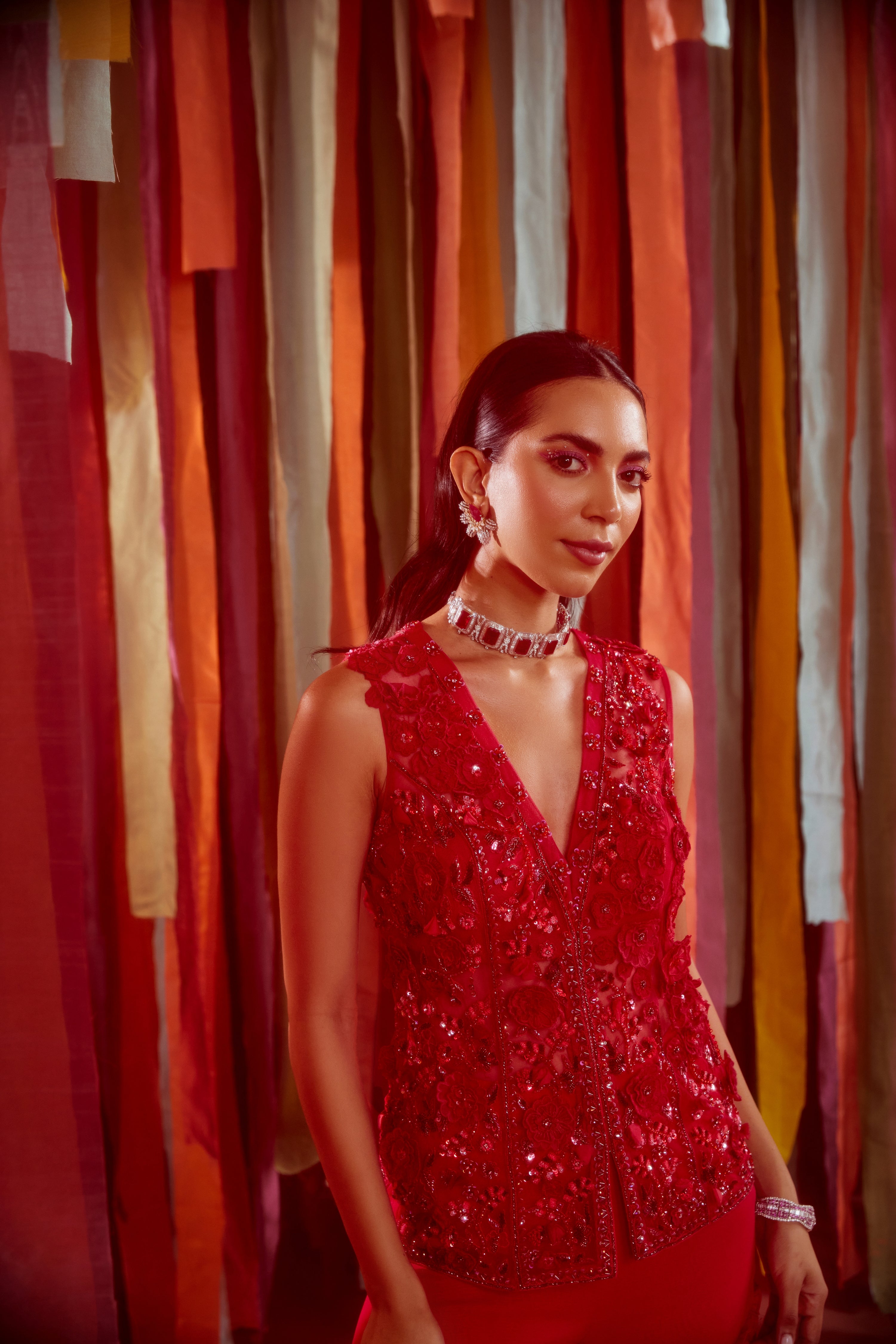 Since the outfit itself is quite elaborate with 3D flowers, opt for minimalistic accessories to avoid overwhelming the look. A simple pair of earrings and a delicate bracelet can complement the outfit well