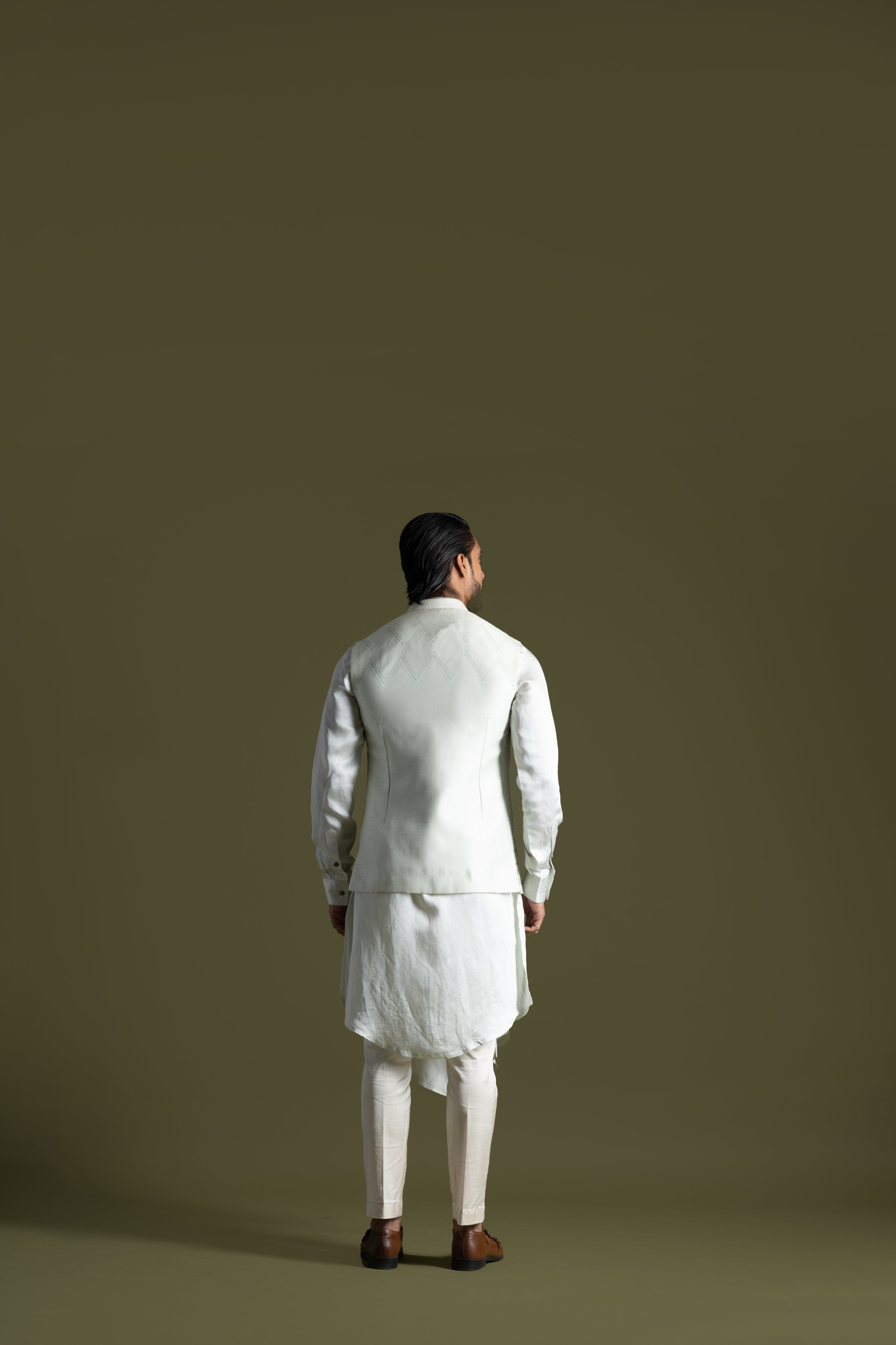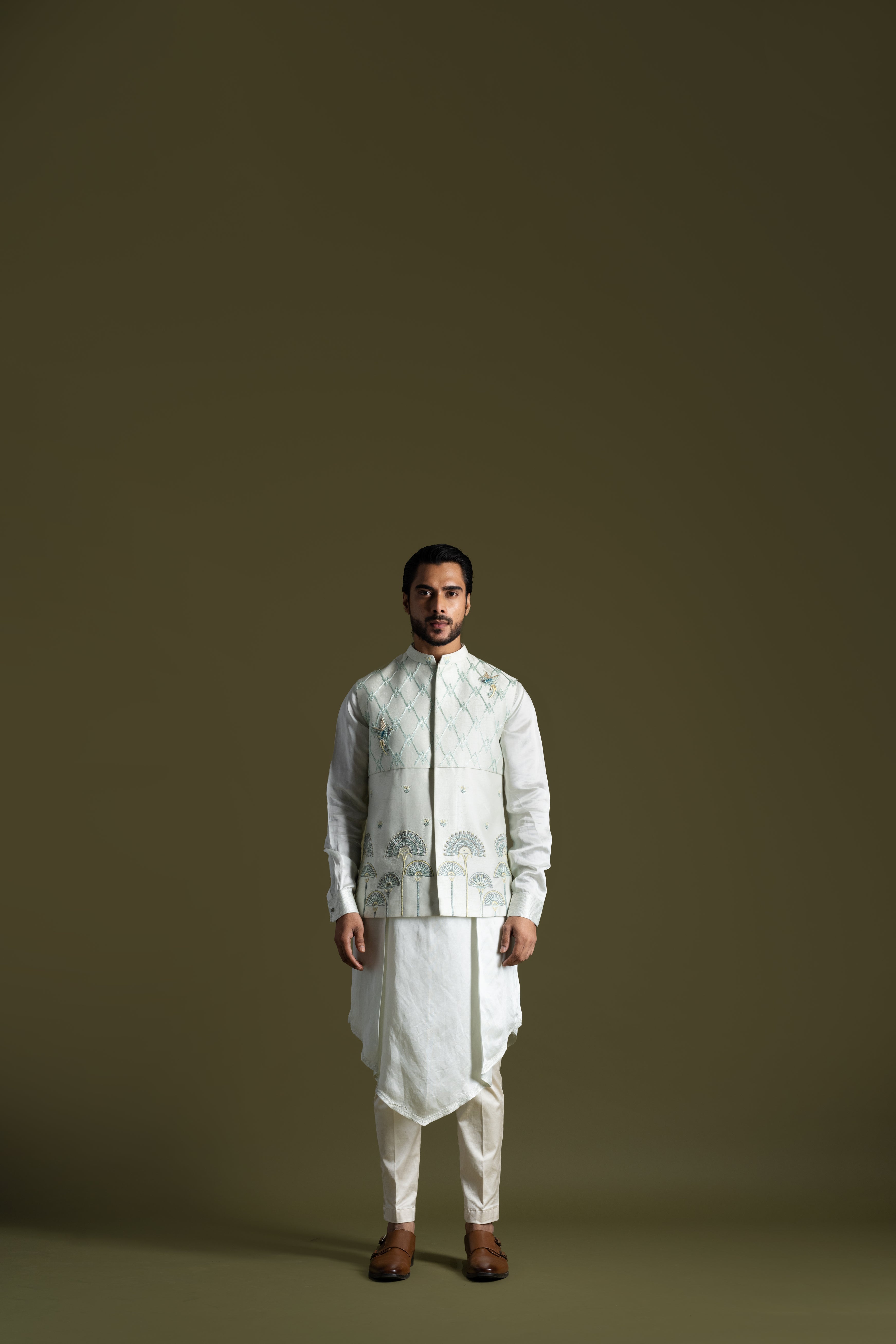 | ICE BLUE NEHRU JACKET WITH EGYPTIAN EMBROIDERED MOTIFS ALL OVER THE NEHRU AND A DOUBLE PANEL DETAILING |