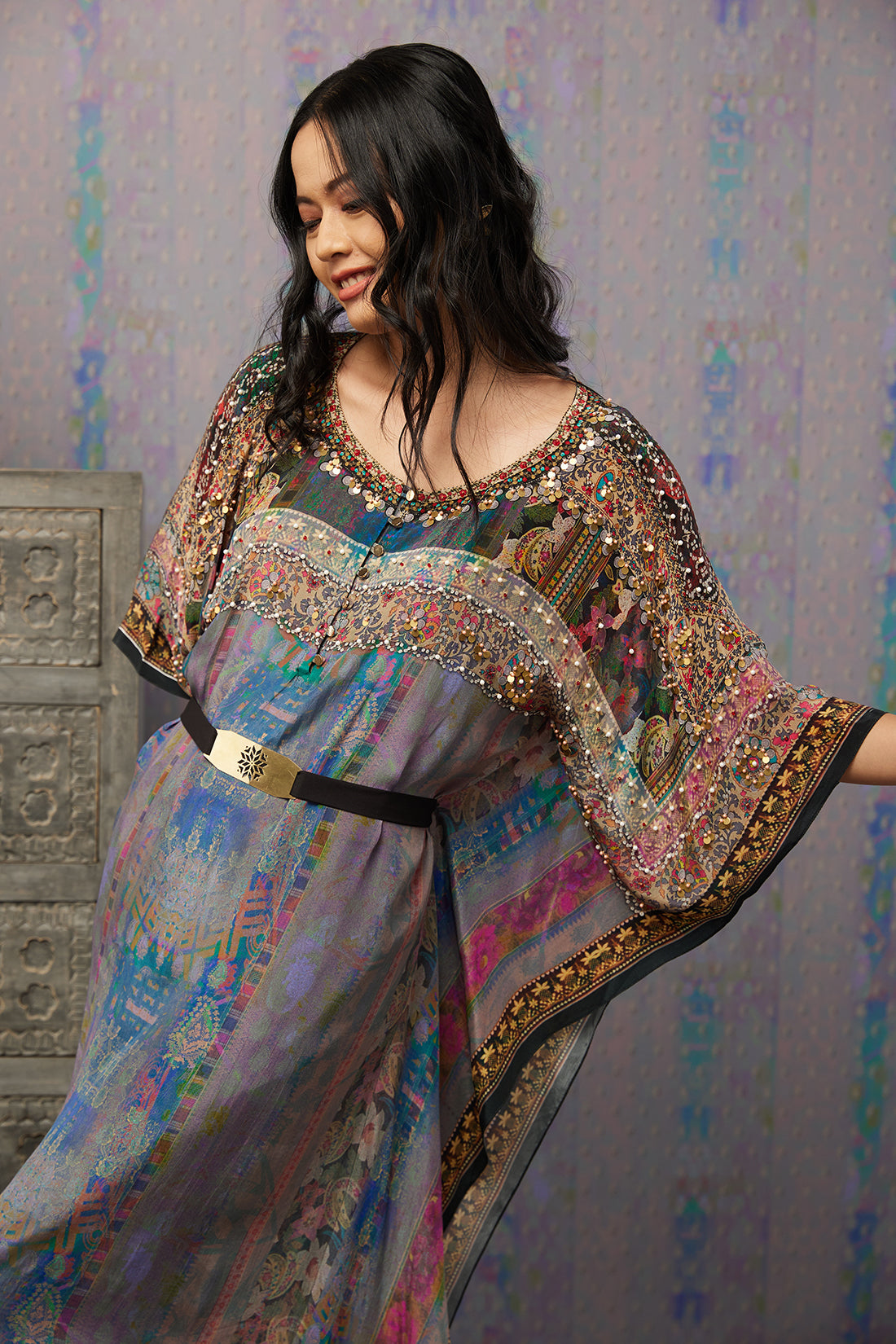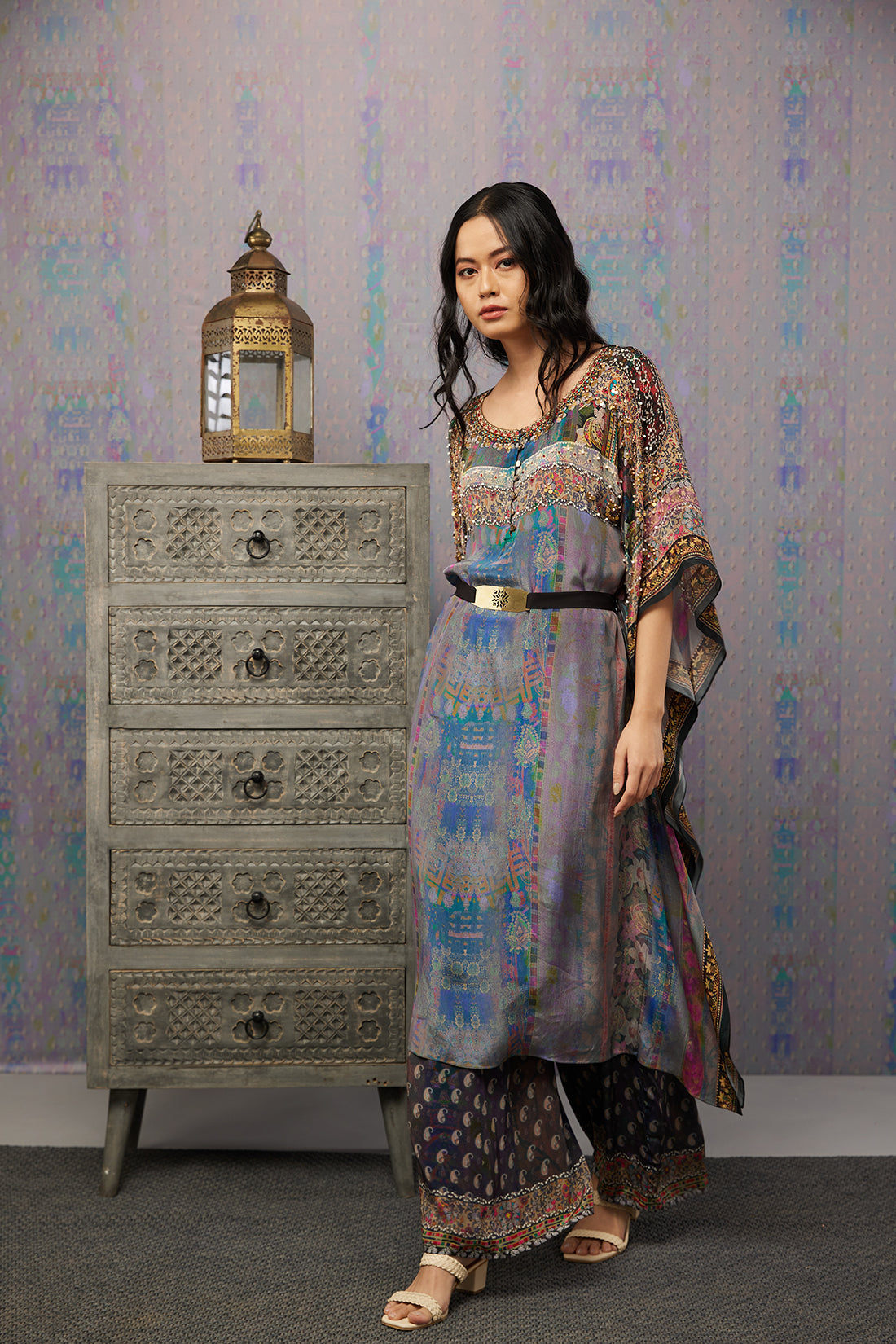 Featuring a mutli-color kaftan Belt set. It has a crop top and a staight bottom.