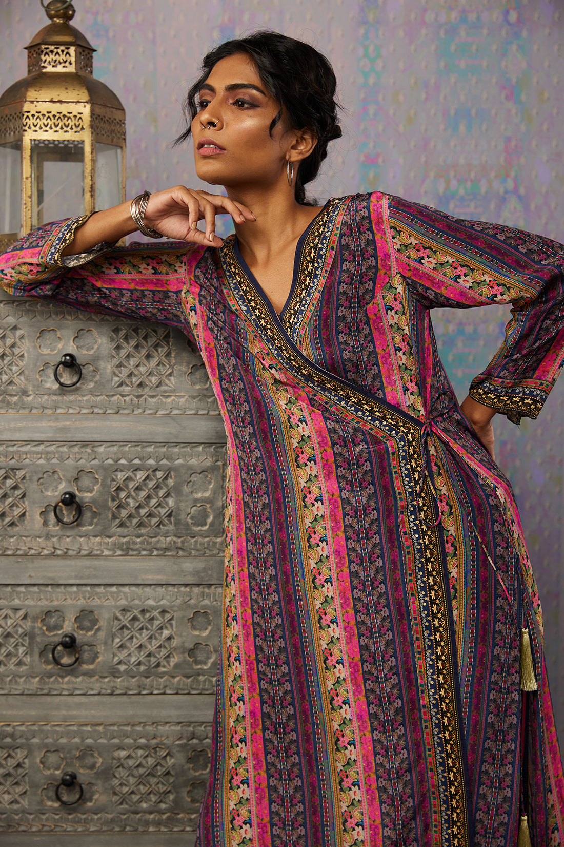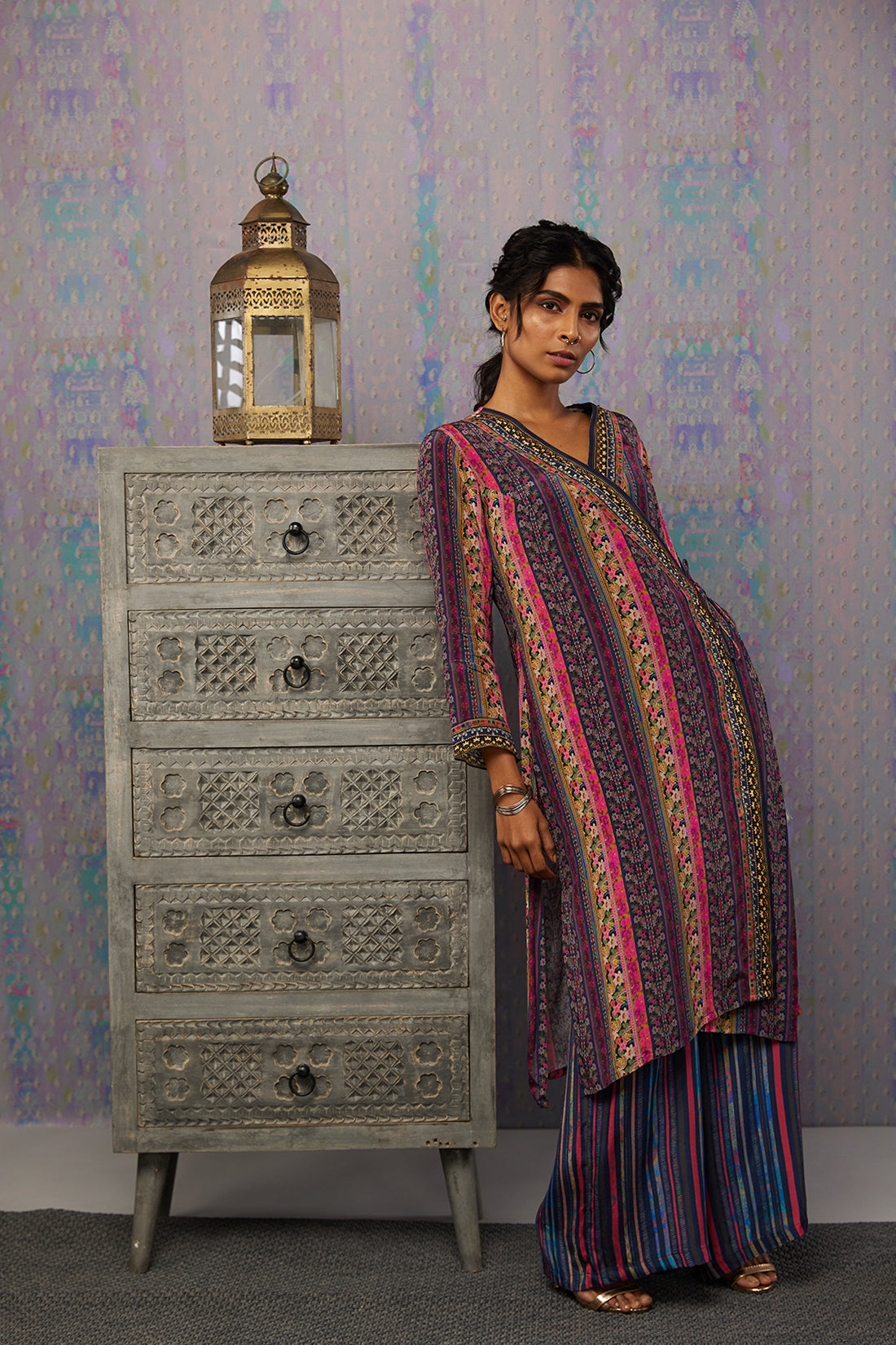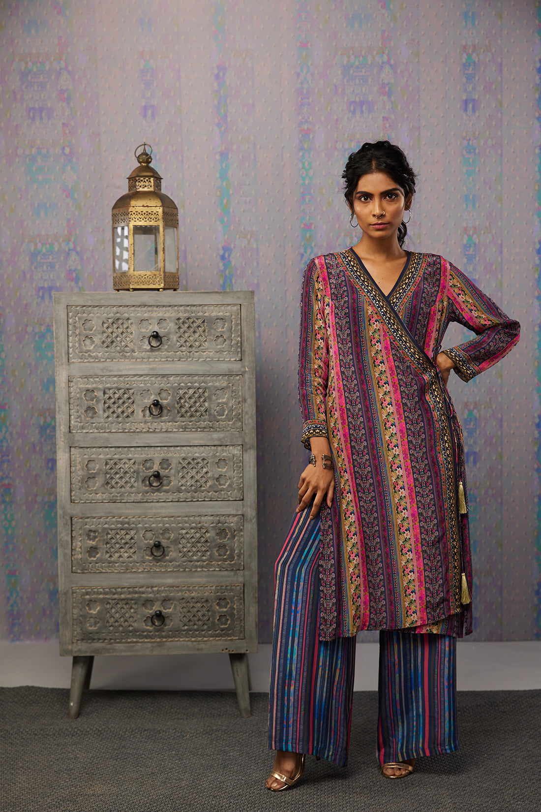 Featuring a multi-color Angarkha Kurta set. It is paired with a straight bottom pant