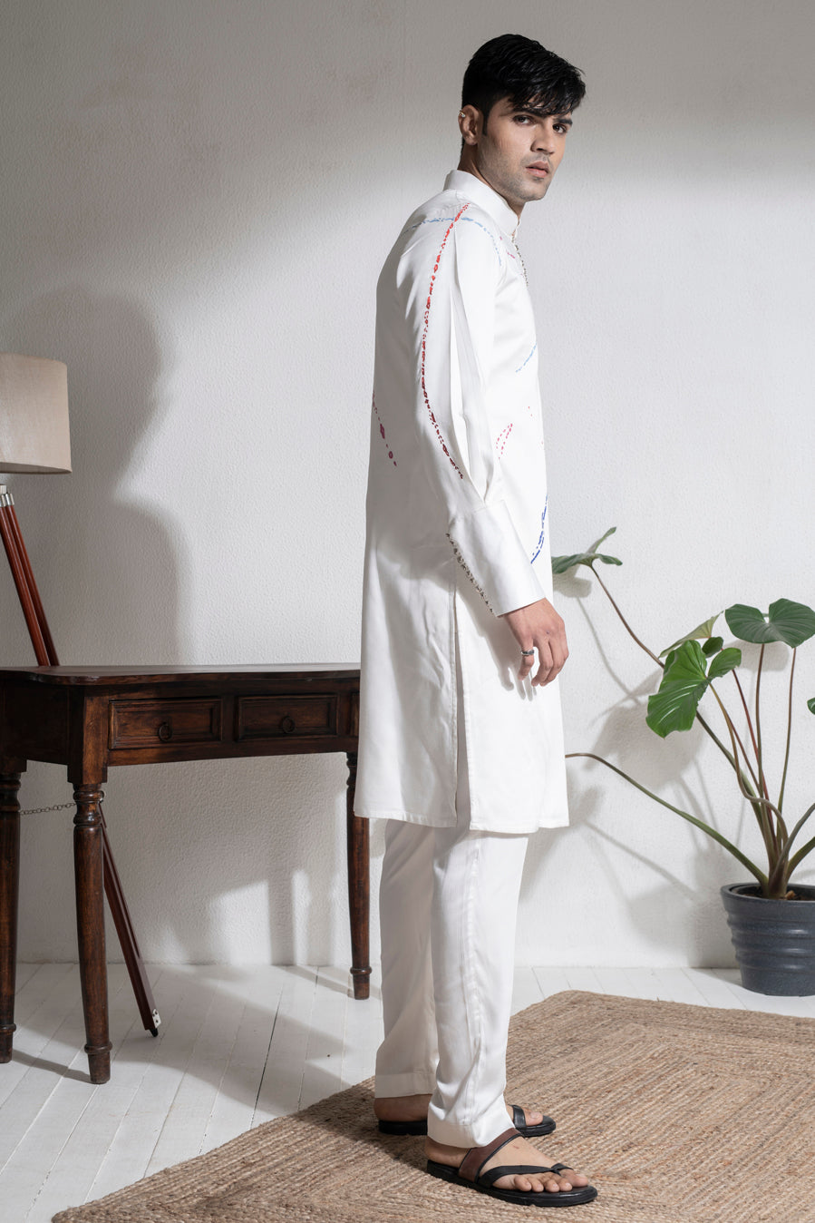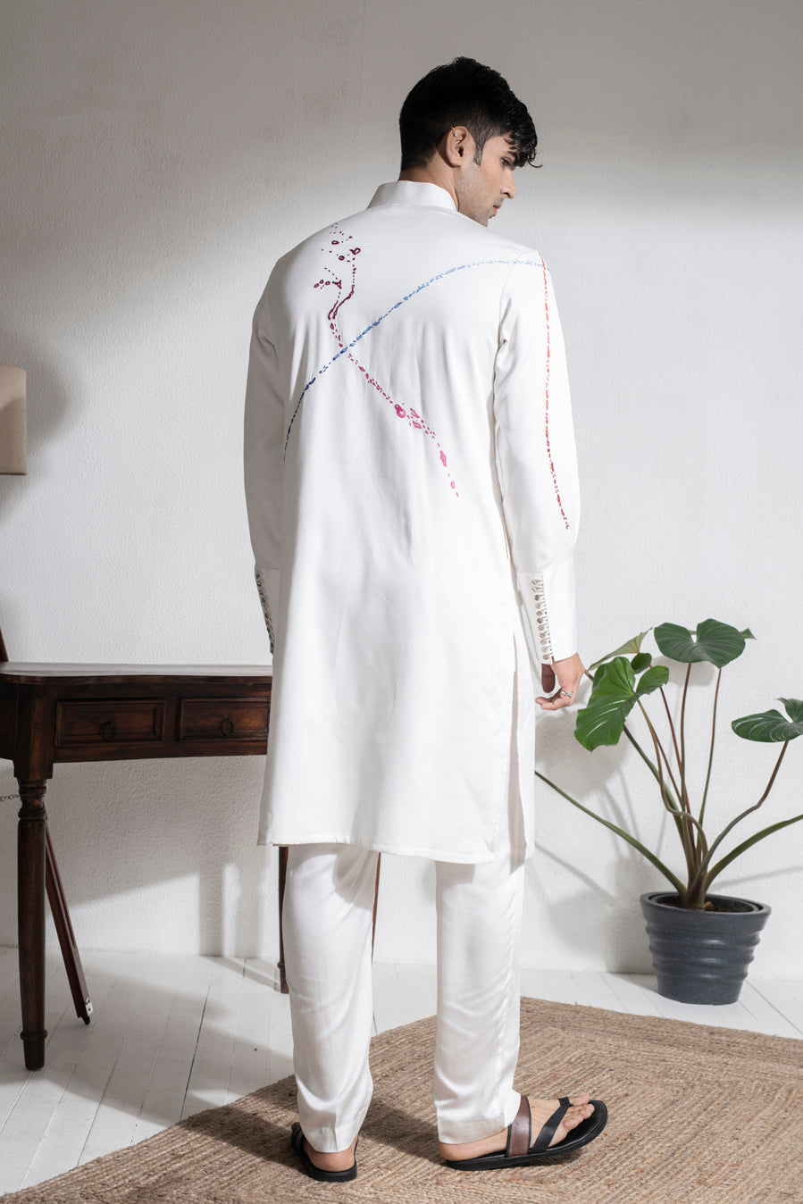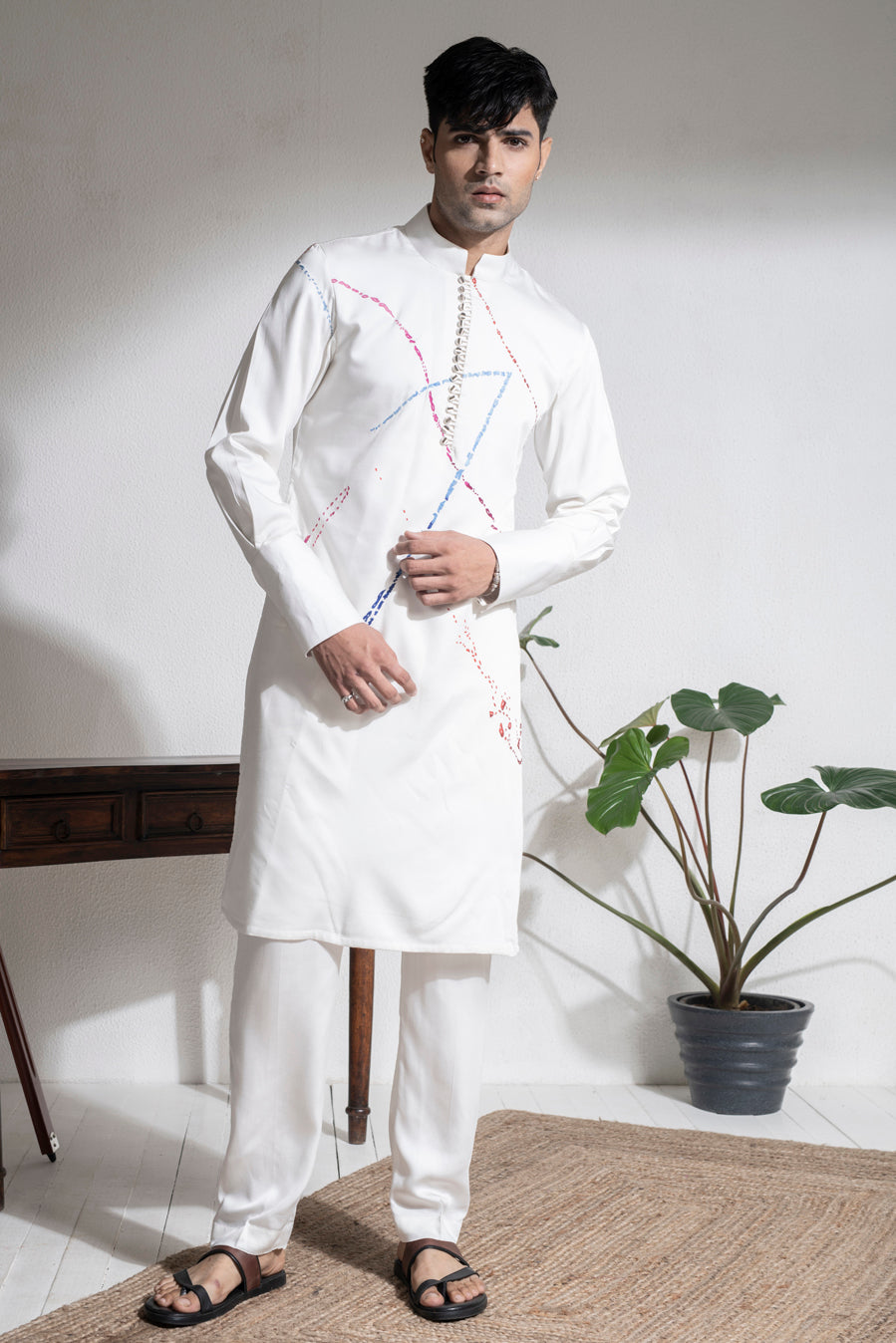 Featuring an ivory kurta in cotton modal satin base with embroidery. It is paired with matching pants.