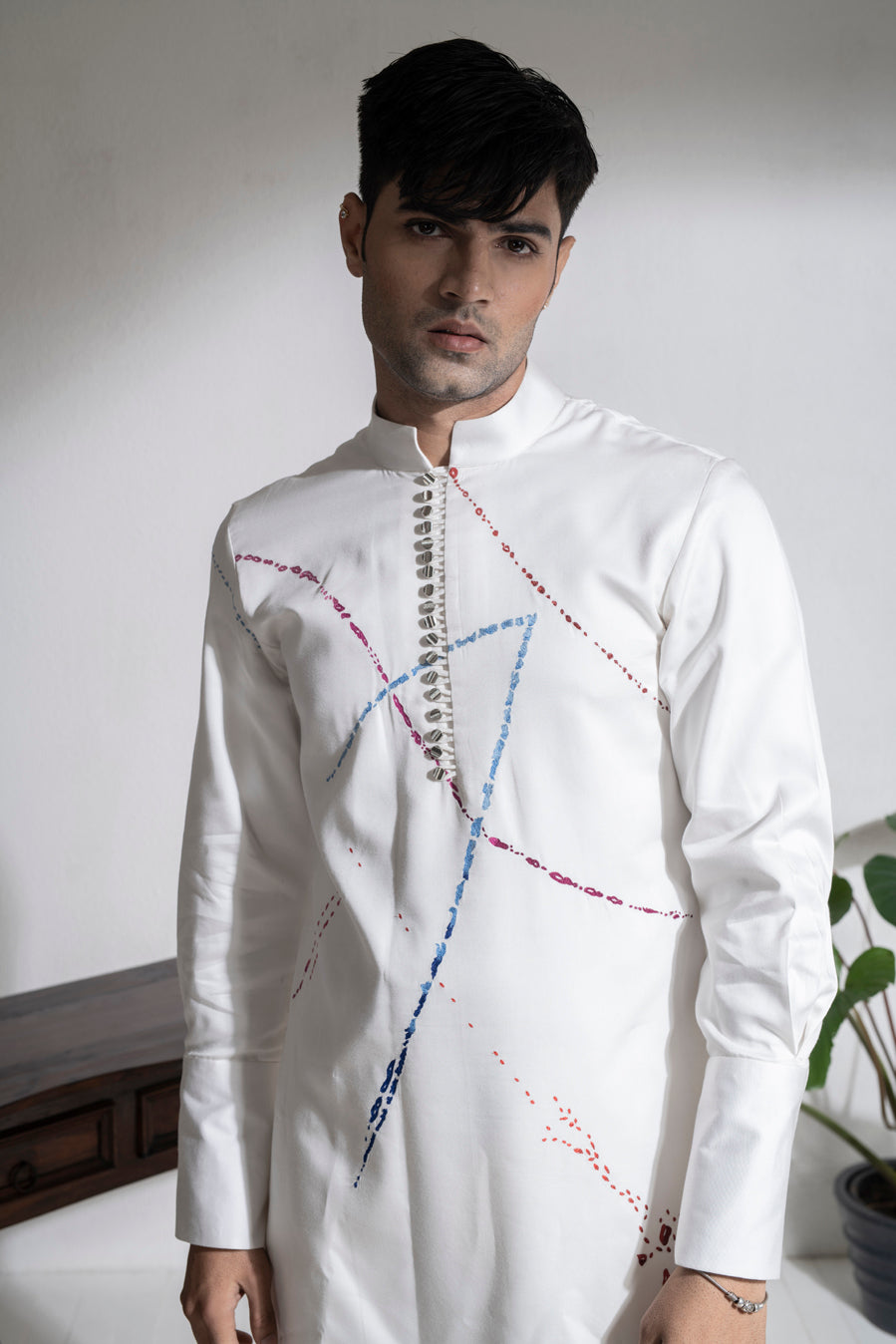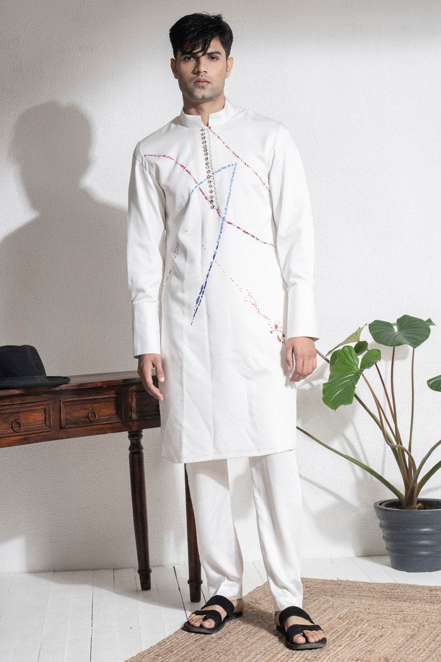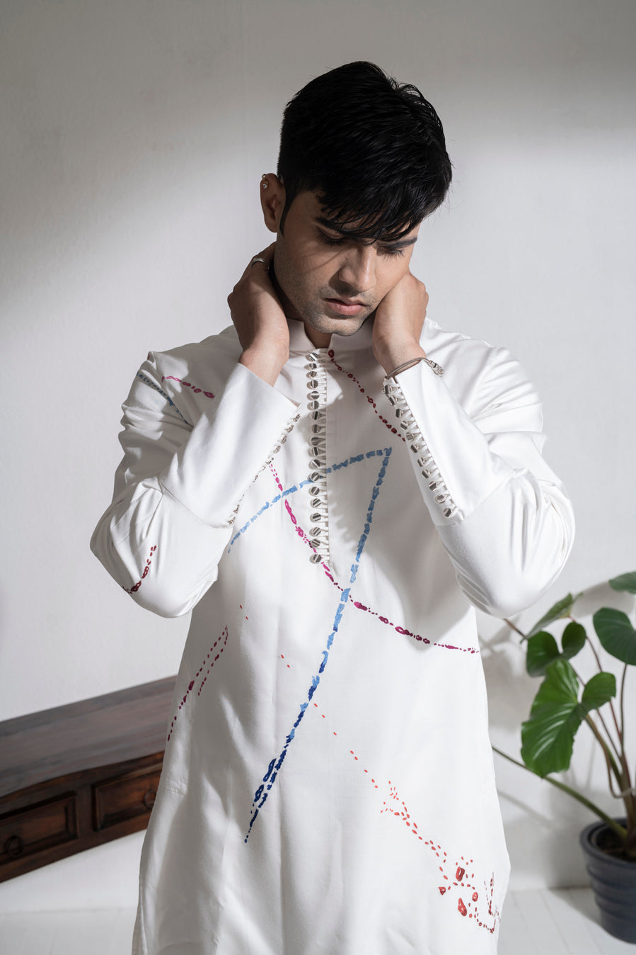 Featuring an ivory kurta in cotton modal satin base with embroidery. It is paired with matching pants.