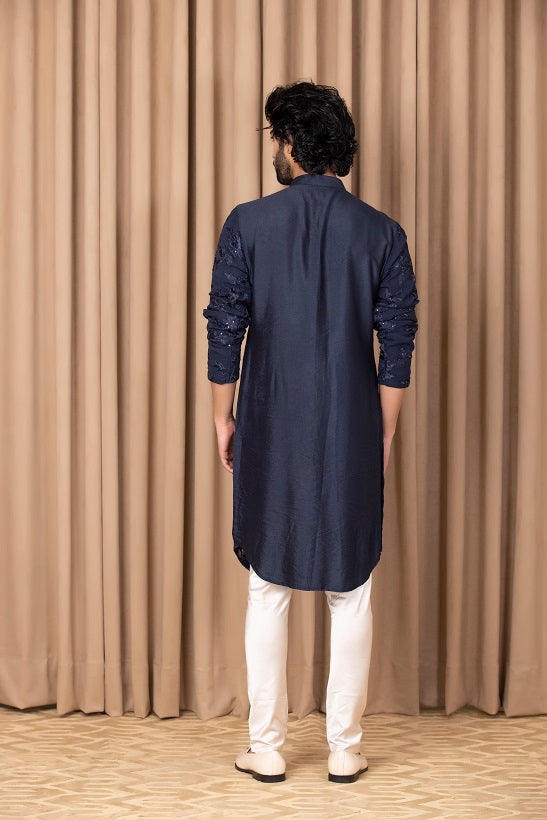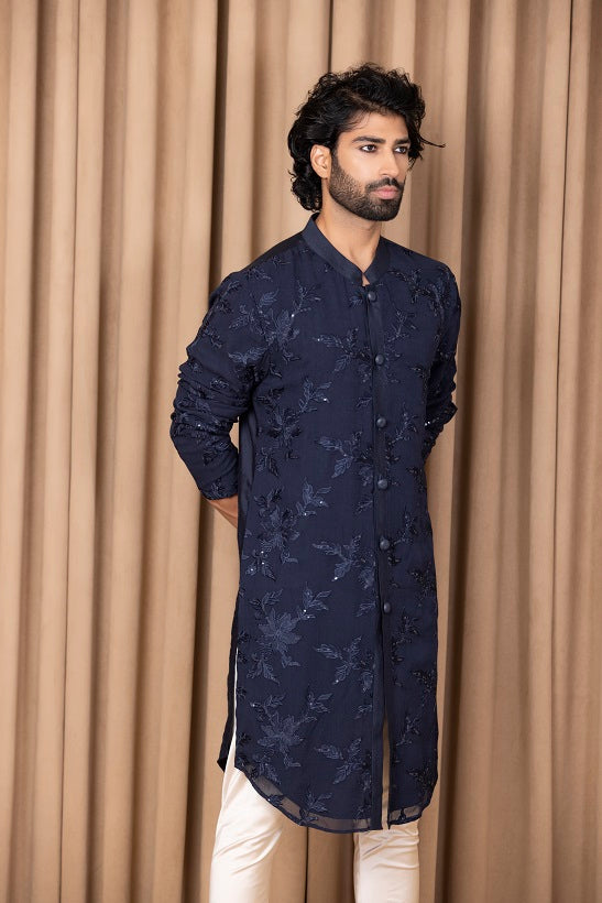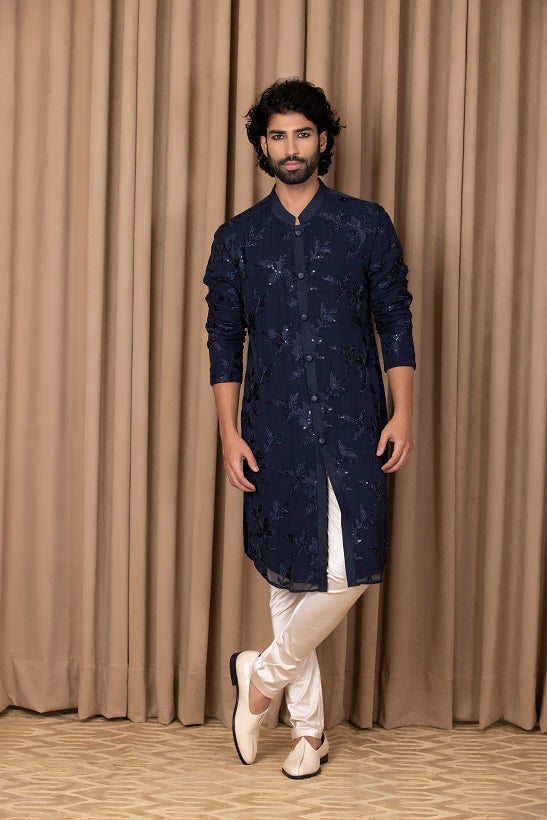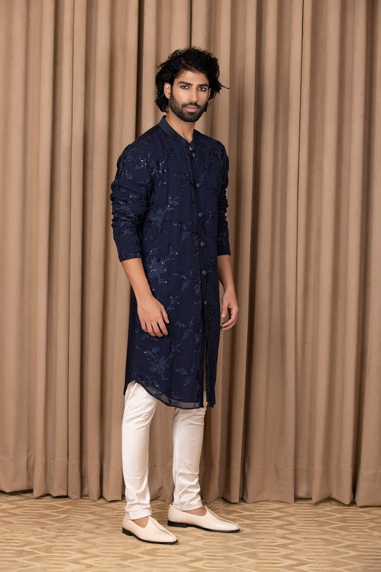 | Featuring a bespoke cotton silk and georgette kurta set in navy blue color with thread machine embroidery on the front and sleeves. Perfect for an outdoor occasion for the modern groom or groomsmen. This comes with an ivory classic churidaar |