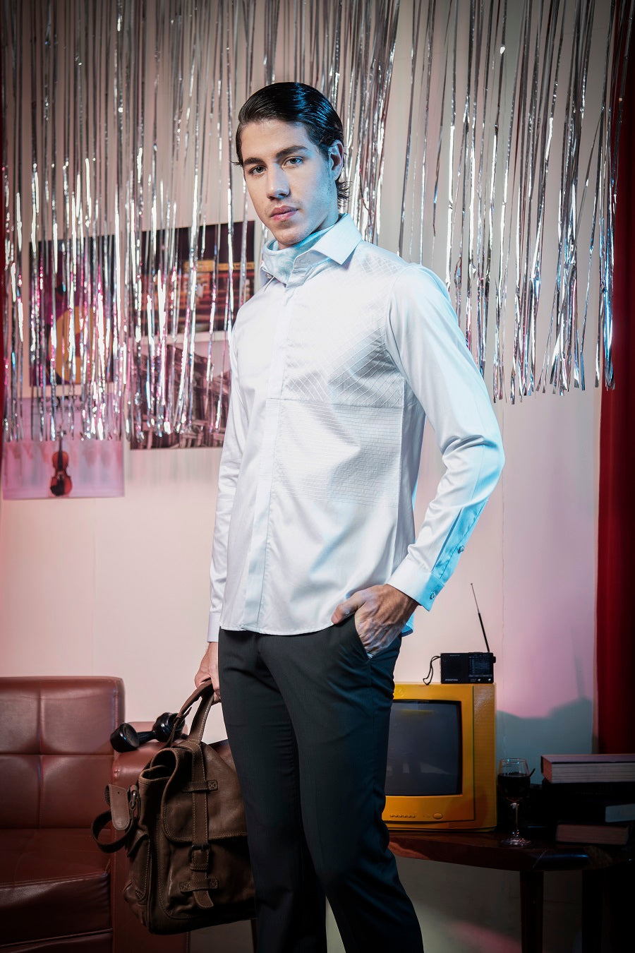 Featuring a light blue shirt in cotton base with geometric machine embroidery. Note: The pants in the image are for styling purposes only.