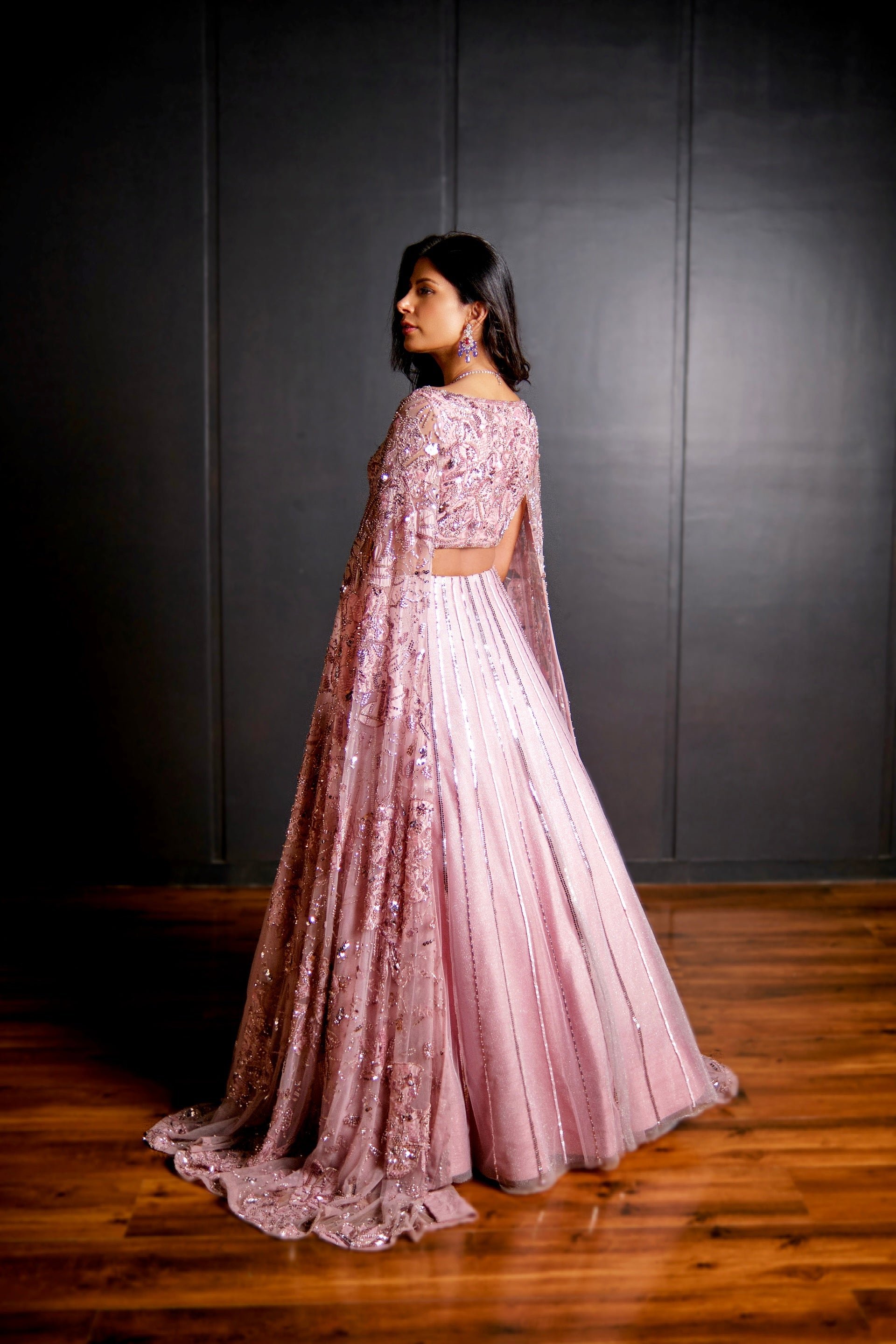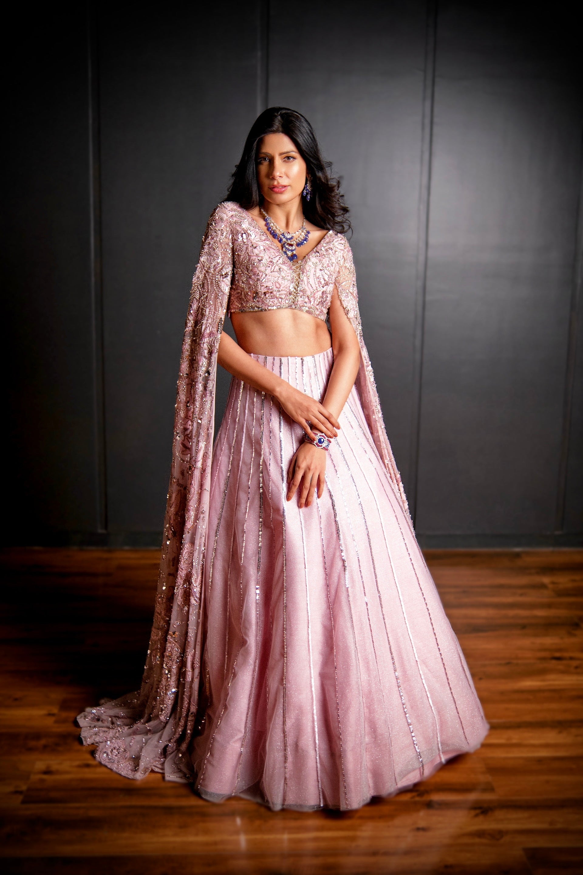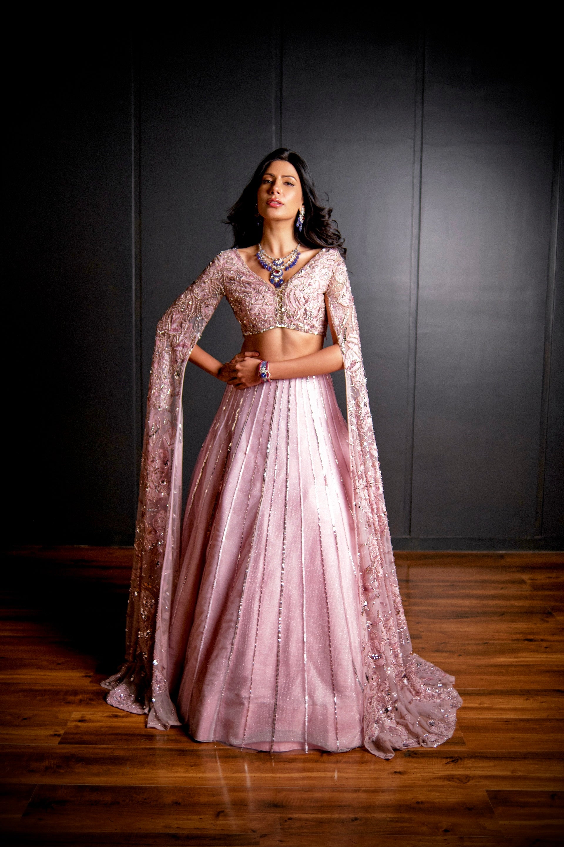 Featuring a lilac pink lehenga in tulle base with crystal beads, sequins and abstract floral lace applique embroidery. It is paired with a blouse having cape sleeves. Perfect wear for cocktail parties.