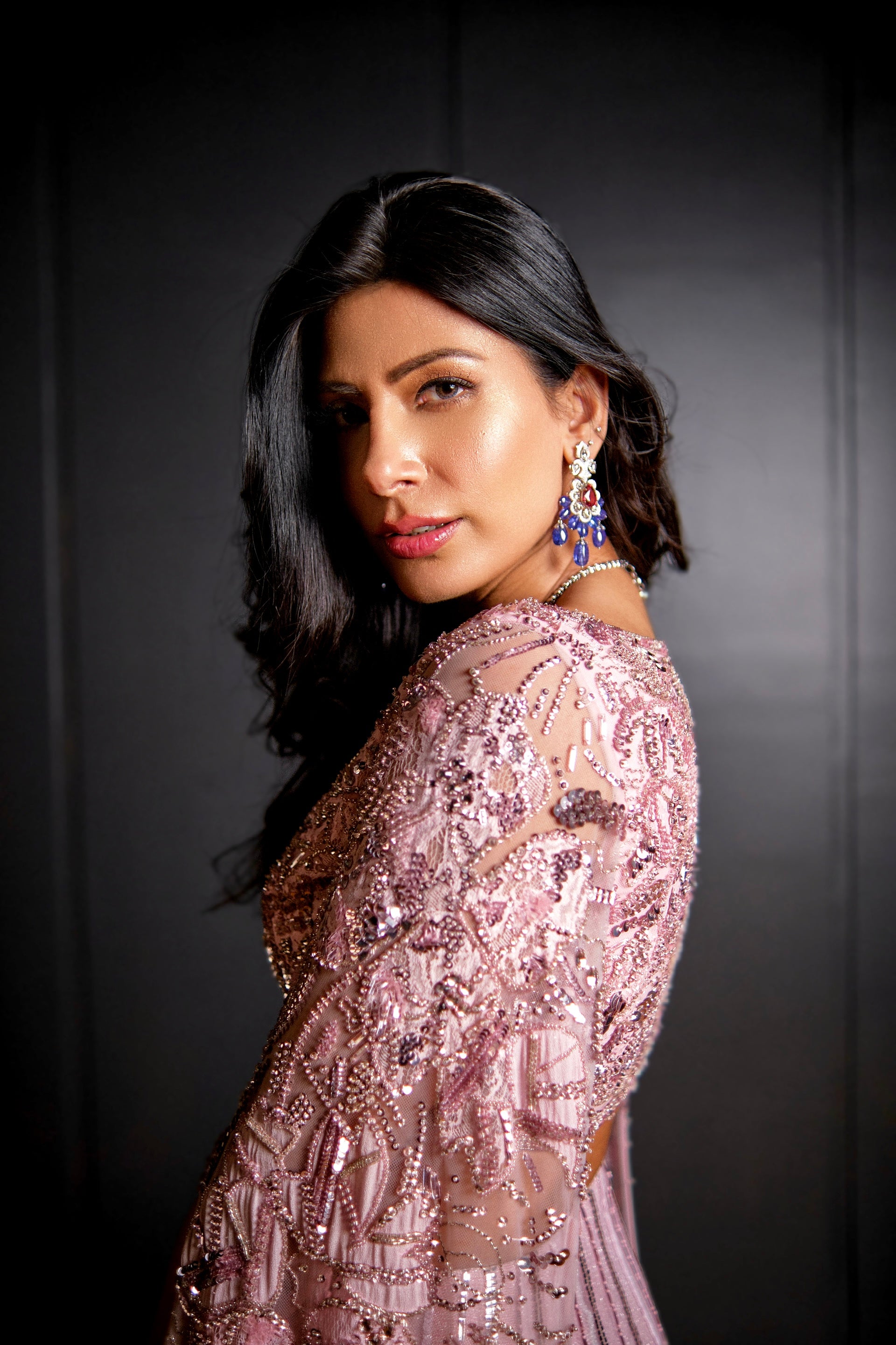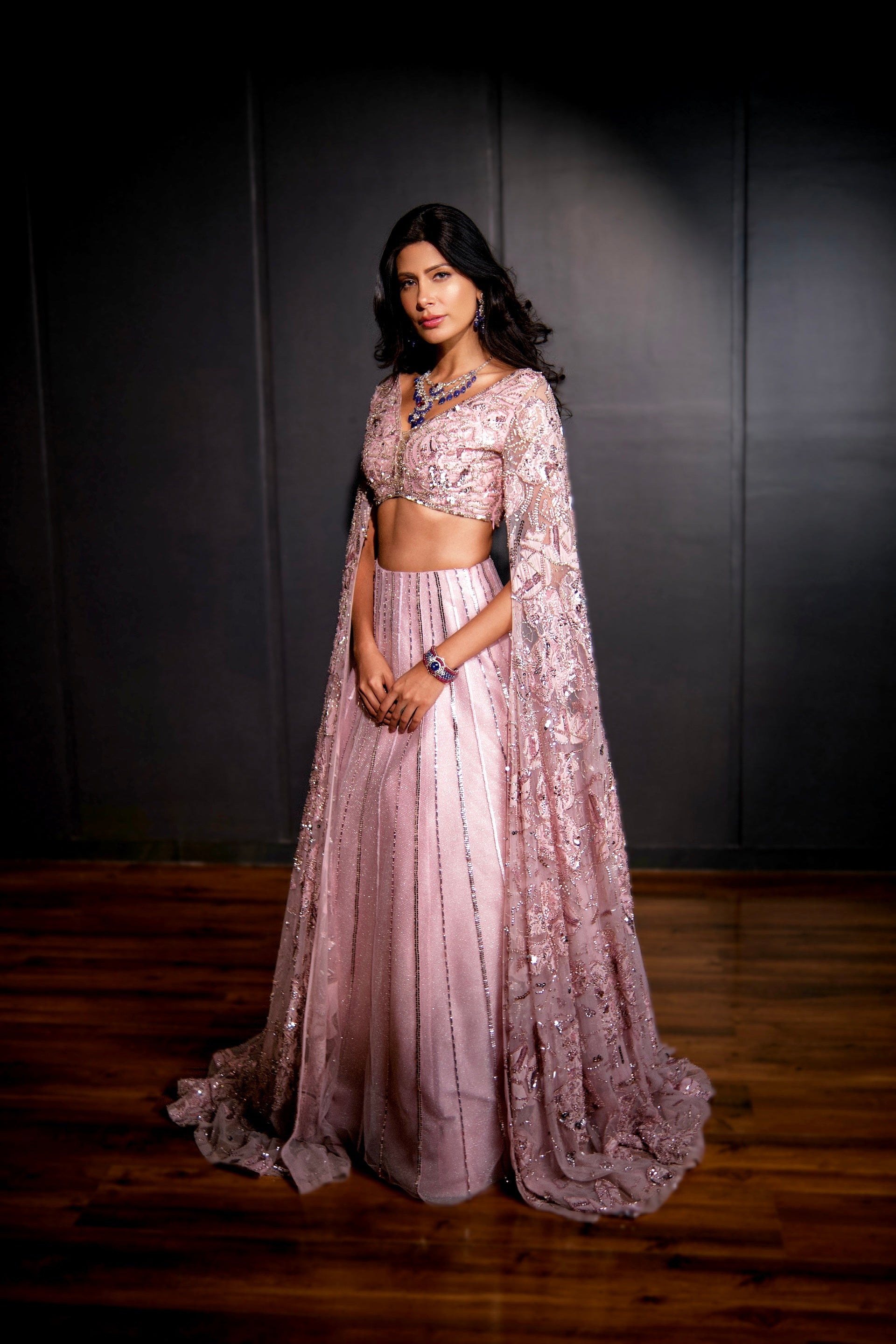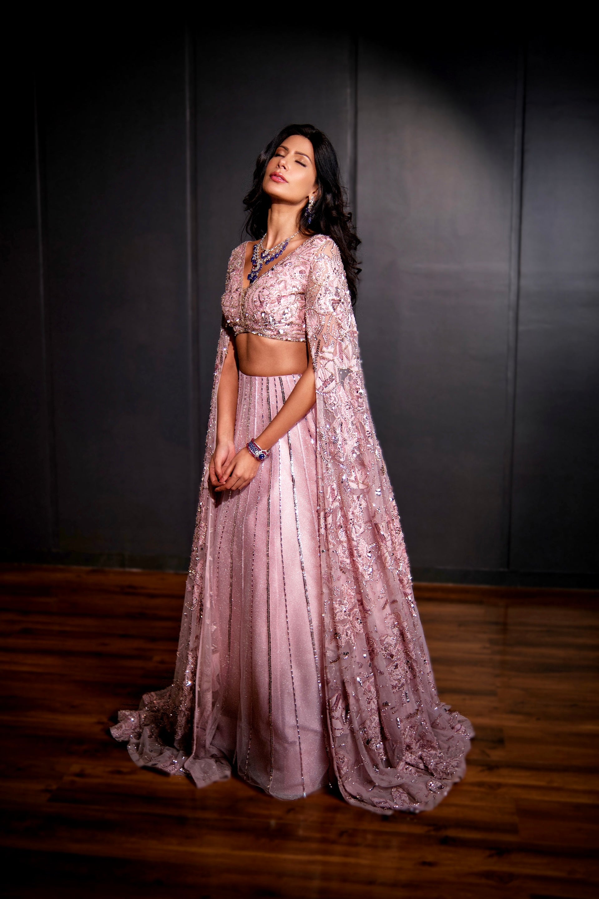 Featuring a lilac pink lehenga in tulle base with crystal beads, sequins and abstract floral lace applique embroidery. It is paired with a blouse having cape sleeves. Perfect wear for cocktail parties.