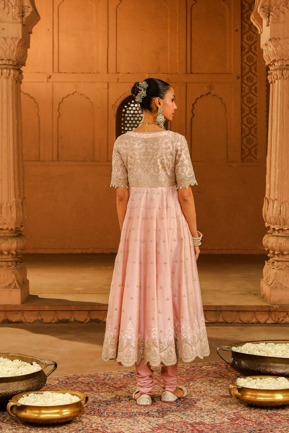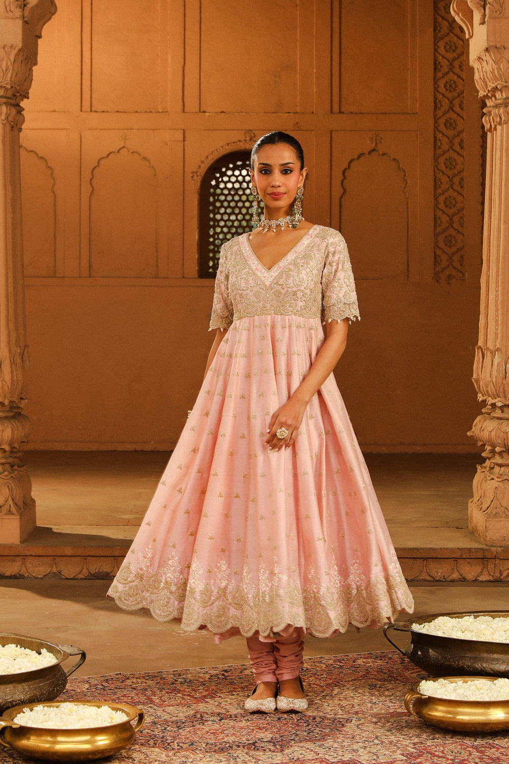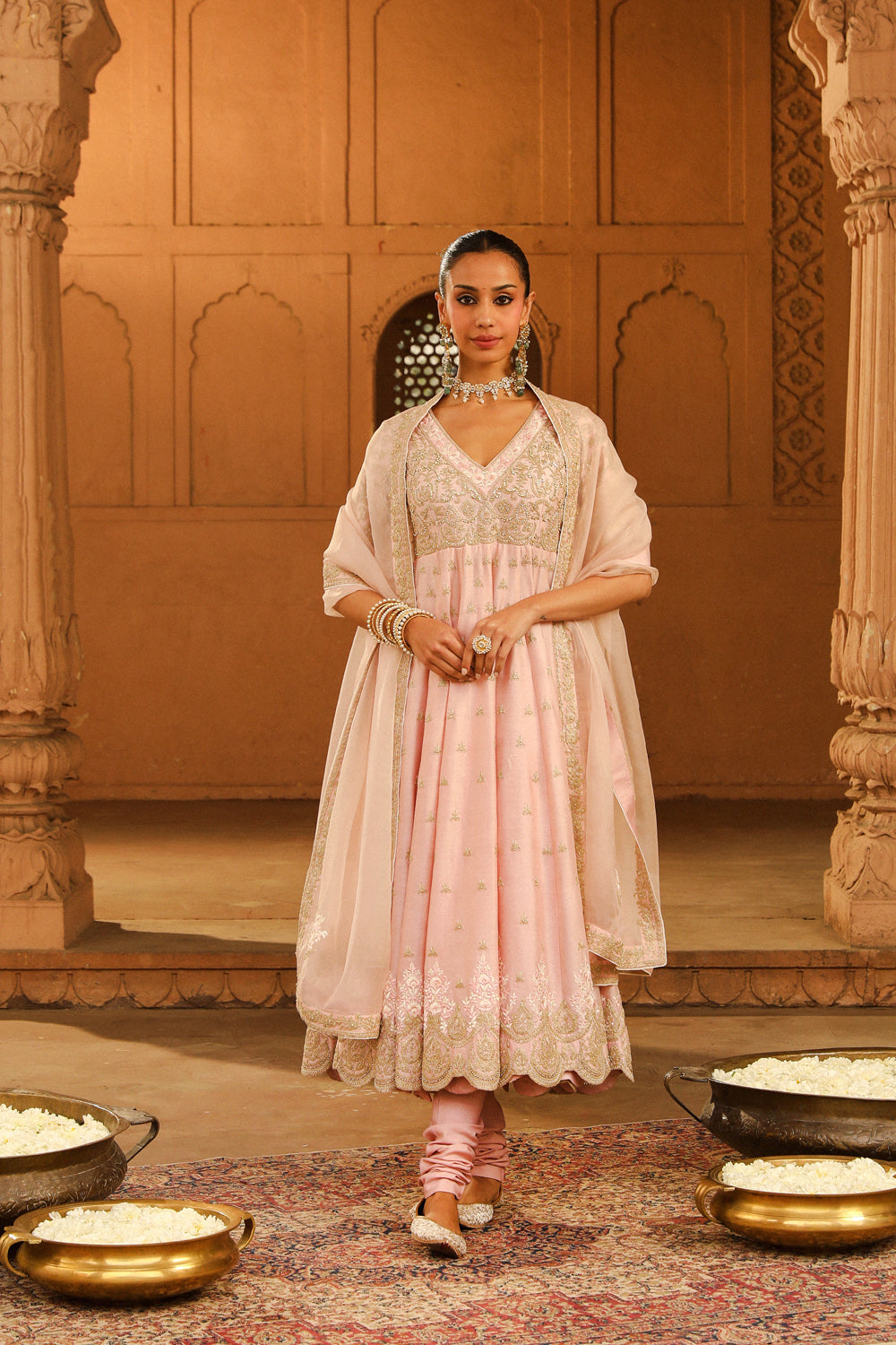 The long ankle length kalidaar anarkali is made in pure silk chanderi fabric teamed up with a chooridaar and a silk organza dupatta. The outfit is having a broad deep V neck at front, a zero back and elbow sleeves. The outfit is adorned with Kashmiri tilla and parsi gara embroidery highlighted with basra moti. The outfit is finished with scallop detailing.